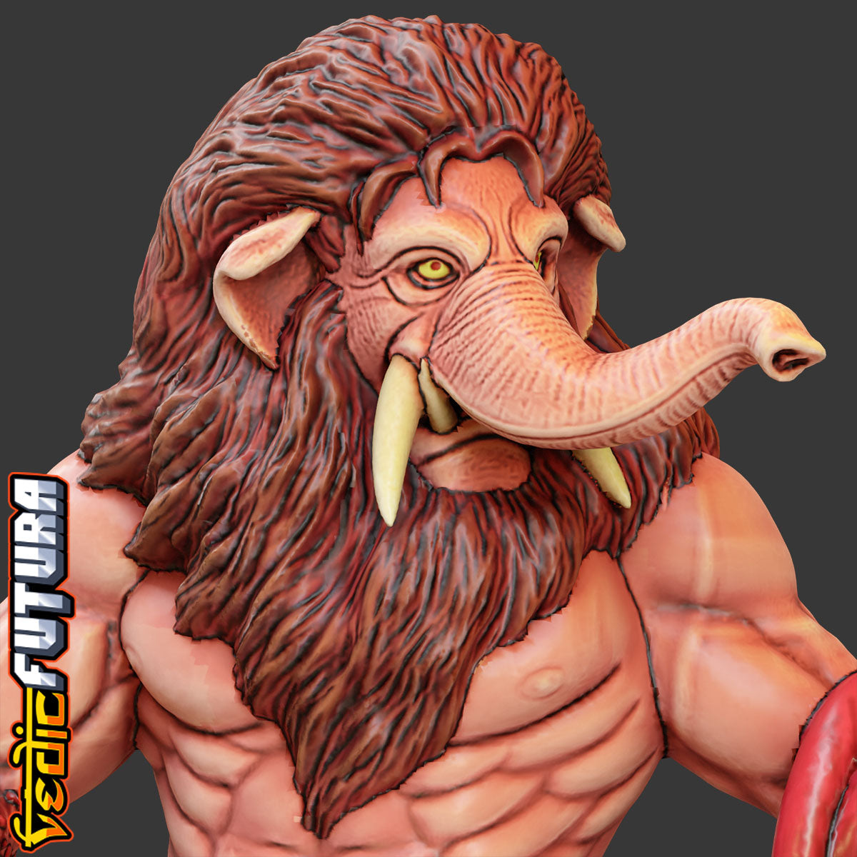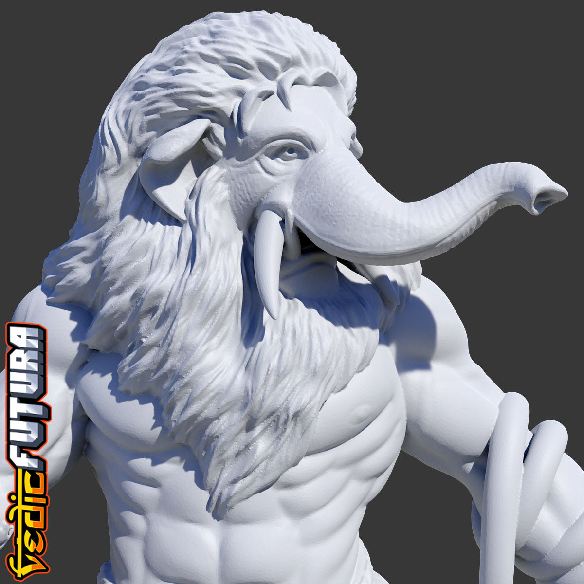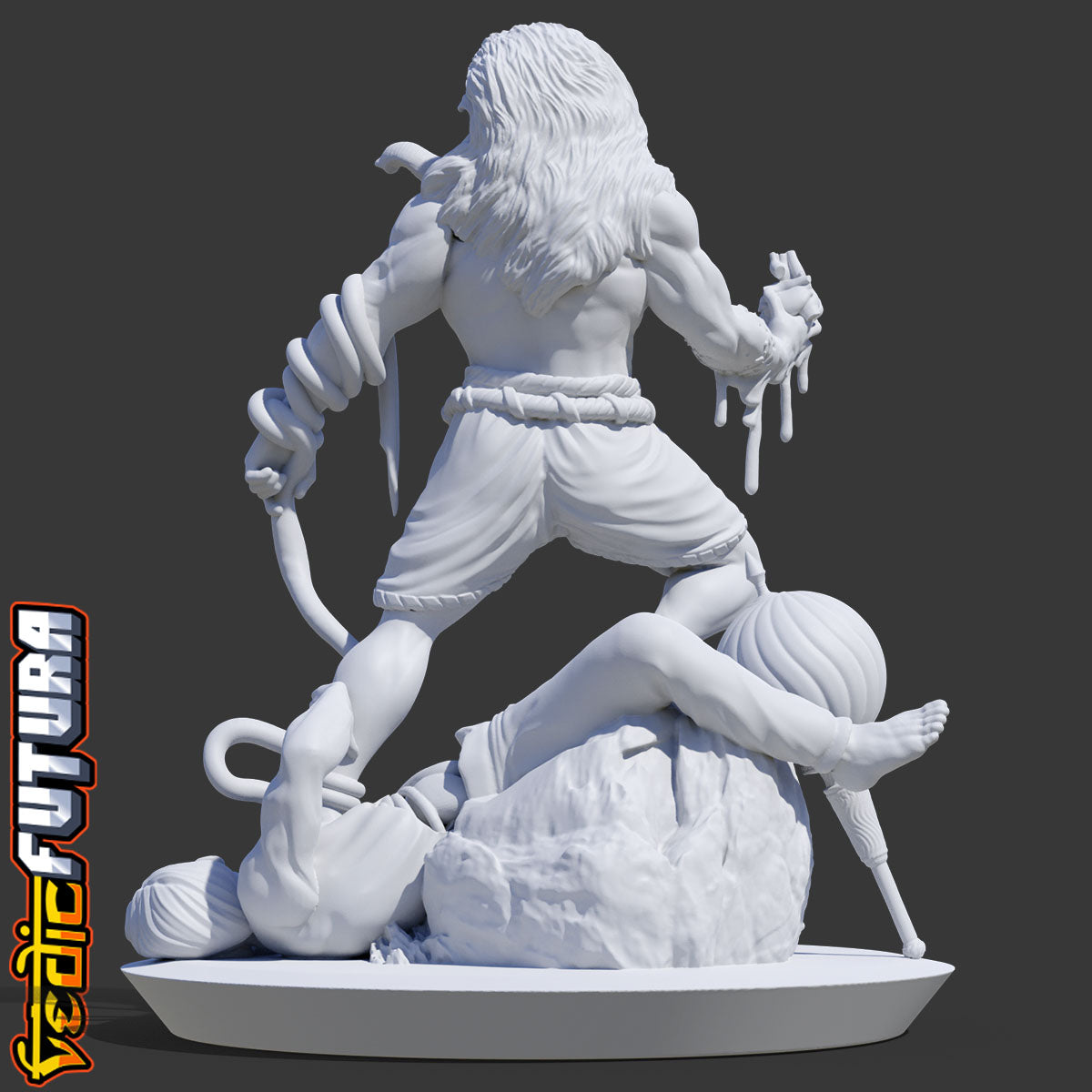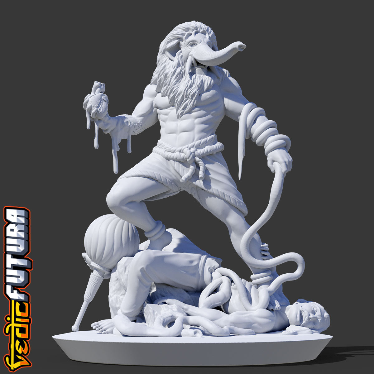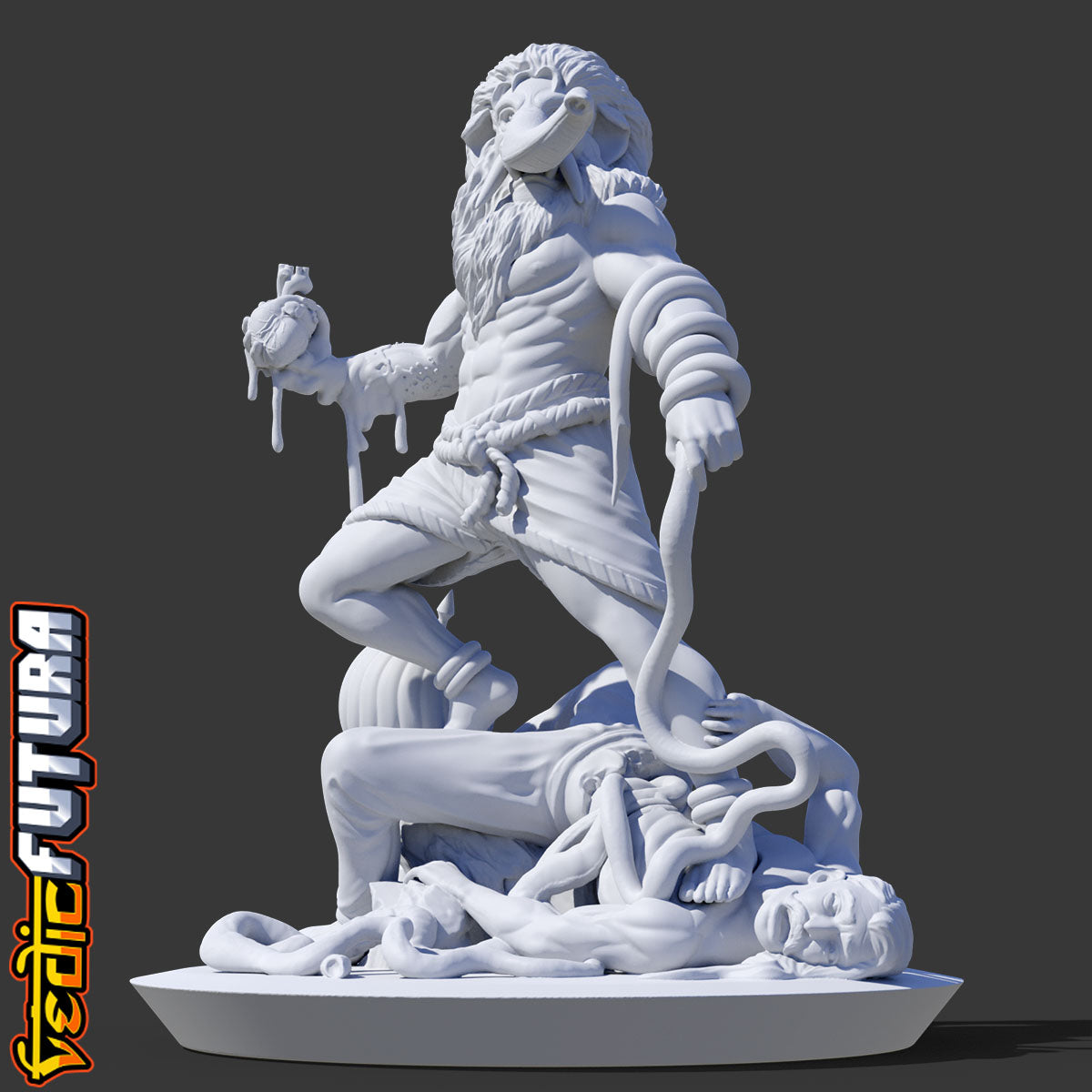 This striking sculpture, titled Simha-Ganesha, creatively merges the forms of Lord Ganesha and Narasimha, depicting Ganesha in the ferocious aspect of Narasimha after his defeat of the demon Hiranyakashipu. The figure stands powerfully over the vanquished demon, embodying Narasimha’s intense rage and protective ferocity. In one hand, Simha-Ganesha holds Hiranyakashipu’s heart, while his other hand is entwined with the demon’s entrails, referencing the violent yet righteous way in which Narasimha ended Hiranyakashipu’s tyranny in Hindu mythology. The work blends Ganesha’s gentle, elephant-headed form with the leonine features of Narasimha, including a muscular physique and intense expression, symbolizing both compassion and the fierce protection of dharma. This interpretation captures the duality of divine power—protective and destructive—necessary to uphold cosmic order.