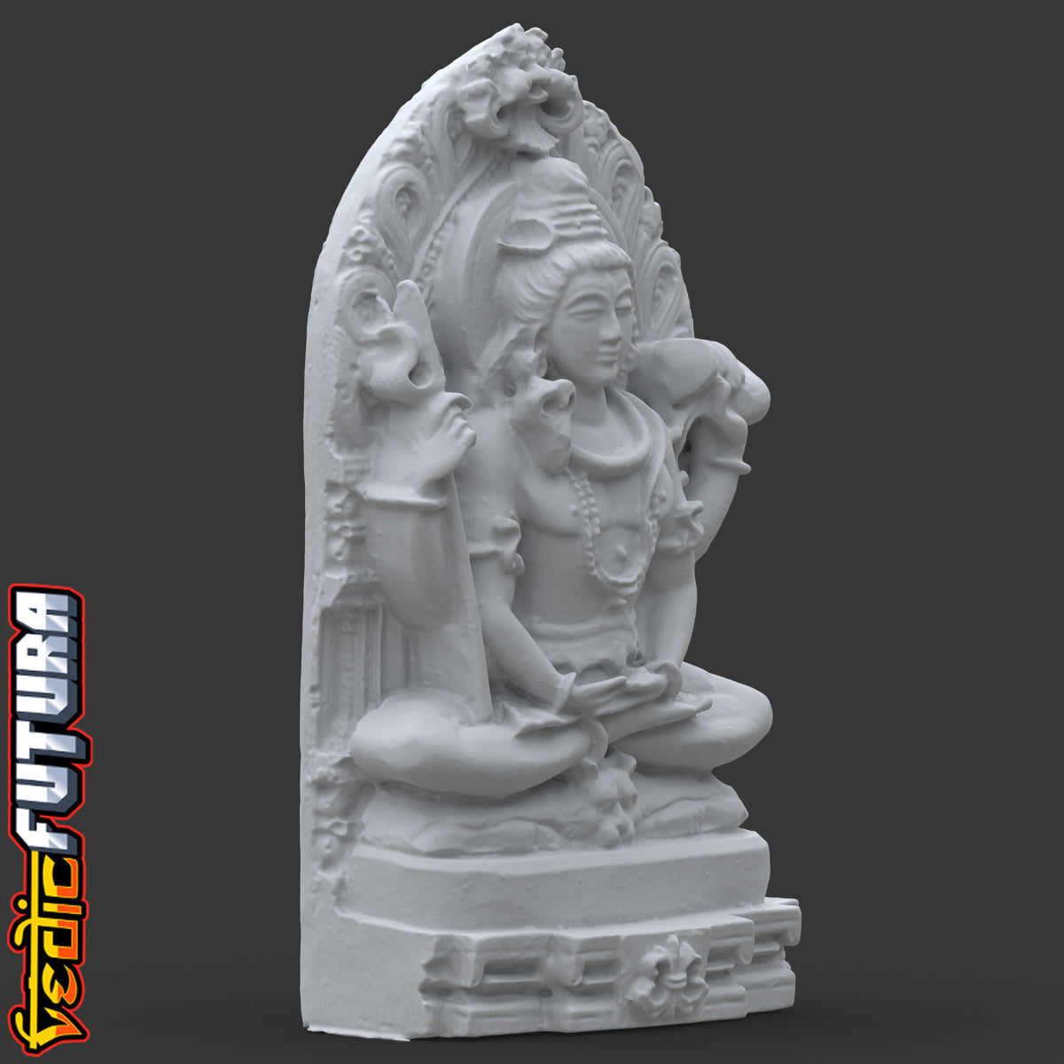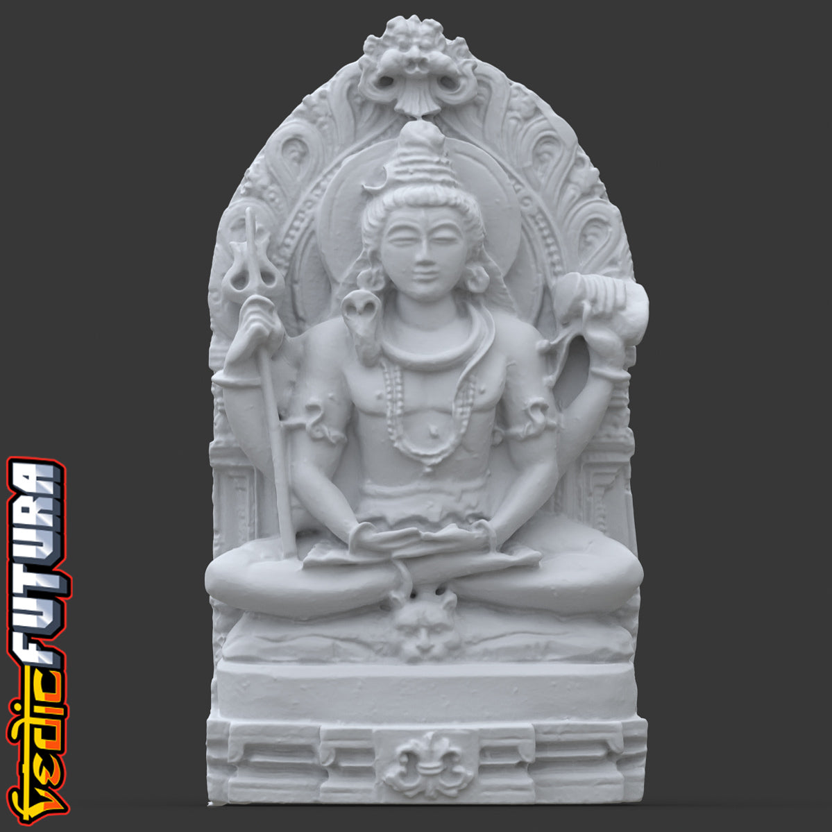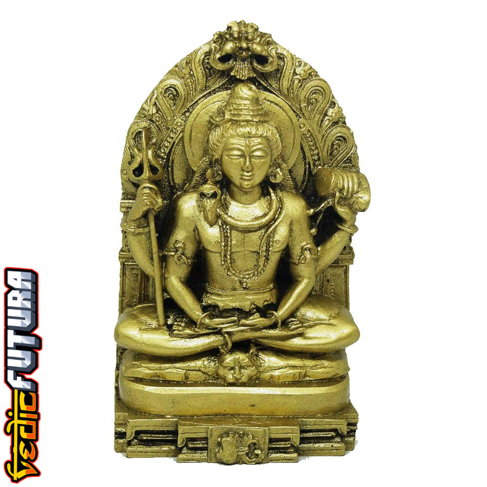 The sculpture of Lord Shiva depicts him in a serene and powerful posture. He is shown with four hands, each symbolizing different aspects of his divine nature. The two front hands are resting gently on his lap in the Dhyana mudra, indicating deep meditation and inner tranquility. In his upper right hand, Lord Shiva holds a trident, known as the Trishul, which represents the three fundamental aspects of creation, preservation, and destruction. This trident is a potent weapon and a symbol of his supreme power. In his upper left hand, he holds a damaru, a small hourglass-shaped drum. The damaru is associated with the rhythm of the universe and the cosmic dance of Lord Shiva, known as the Tandava. Lord Shiva is seated on a tiger skin, symbolizing his mastery over the instinctual and wild aspects of existence. The tiger skin also represents his role as the Lord of the animal kingdom, emphasizing his harmonious connection with nature.The sculpture is gracefully framed by a beautiful keerthimukam, also known as a Kirtimukha or "Face of Glory." This ornate and intricately designed element is commonly used in traditional Hindu art and architecture as a decorative motif. It resembles a fierce lion's face, displaying its teeth, and is believed to ward off evil and protect the sacred space.