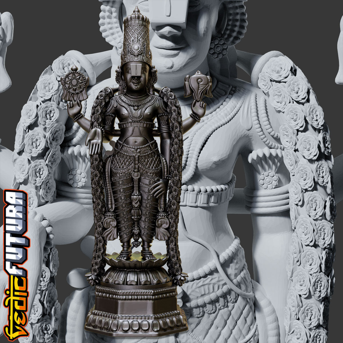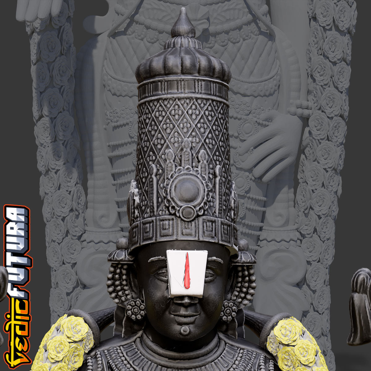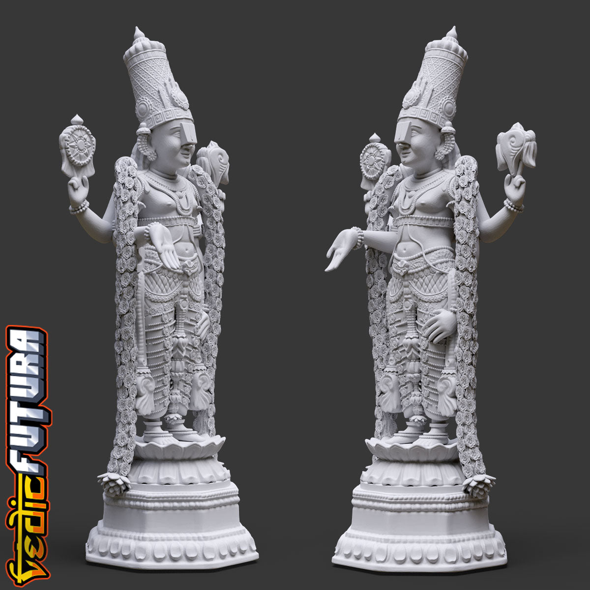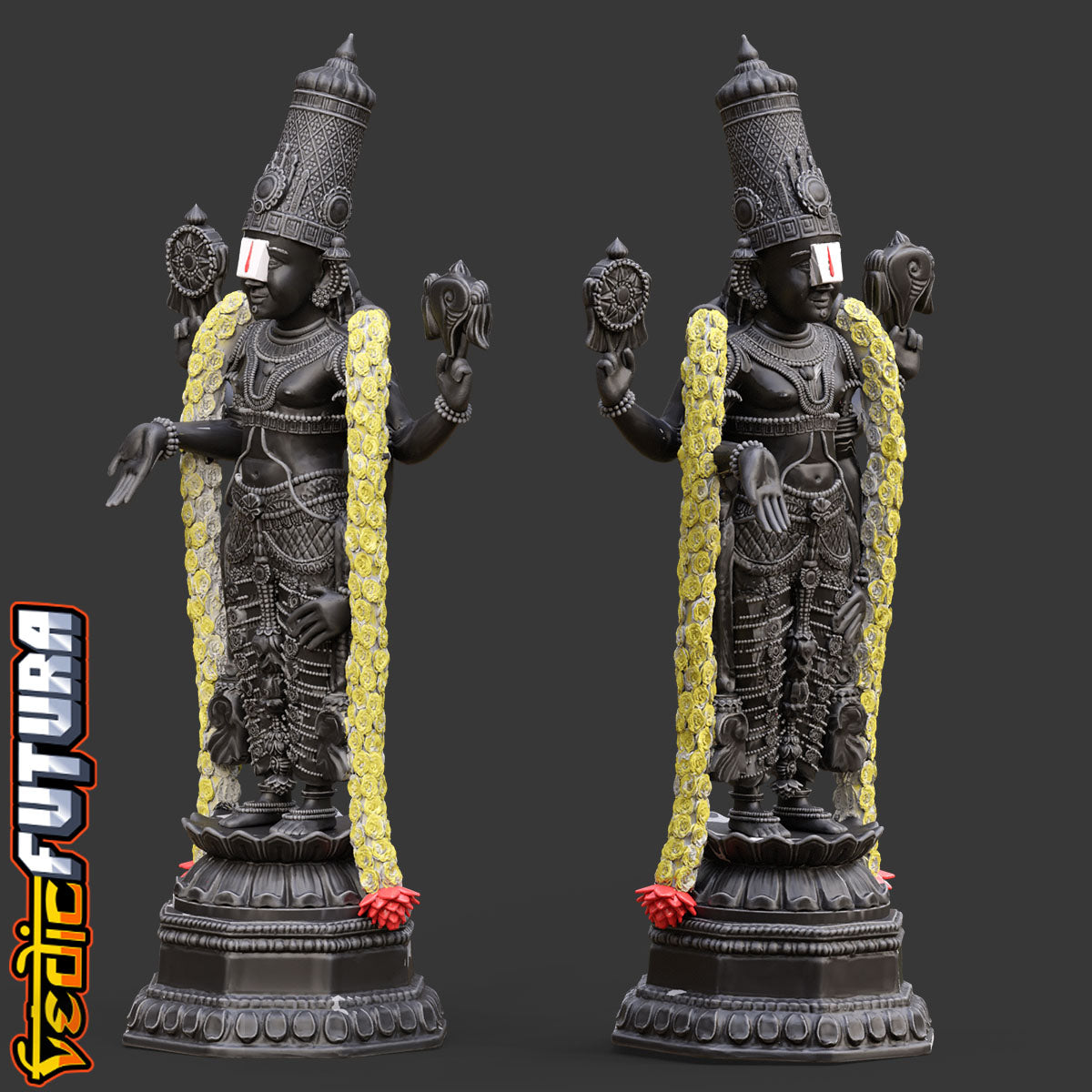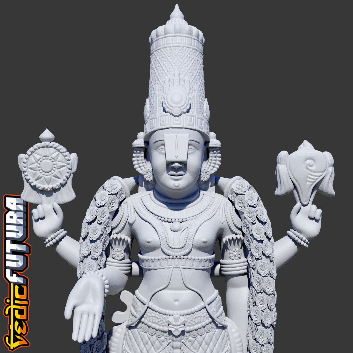 This sculpture depicts Lord Venkateswara, a revered form of Vishnu, standing in a majestic posture on a decorated pedestal. The figure is adorned with intricate jewelry, a tall cylindrical crown (kiritam), and cascading ornaments, symbolizing divine grandeur. His two upper hands hold the conch (Shankha) and discus (Chakra), traditional attributes of Vishnu, while his lower right hand is extended in the blessing (varada) mudra, offering grace to devotees. His lower left hand rests on his thigh, a gesture associated with calm and benevolence. Richly detailed with ornate drapery and embellishments, the sculpture embodies the grandeur and spiritual authority of Lord Venkateswara, central to the Tirupati temple tradition.