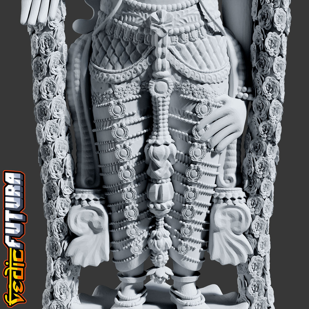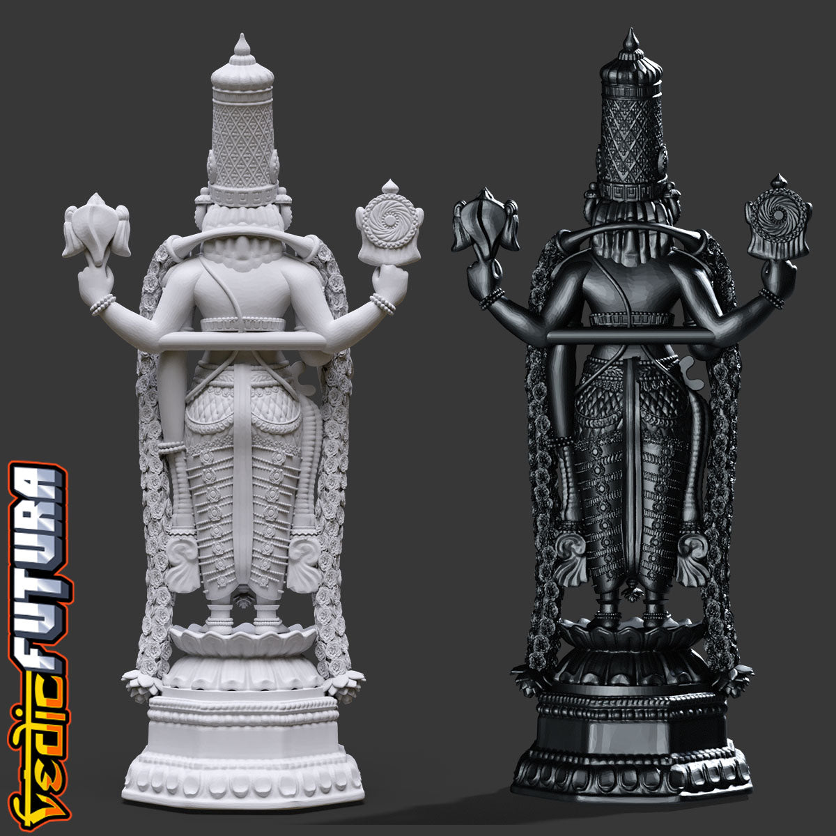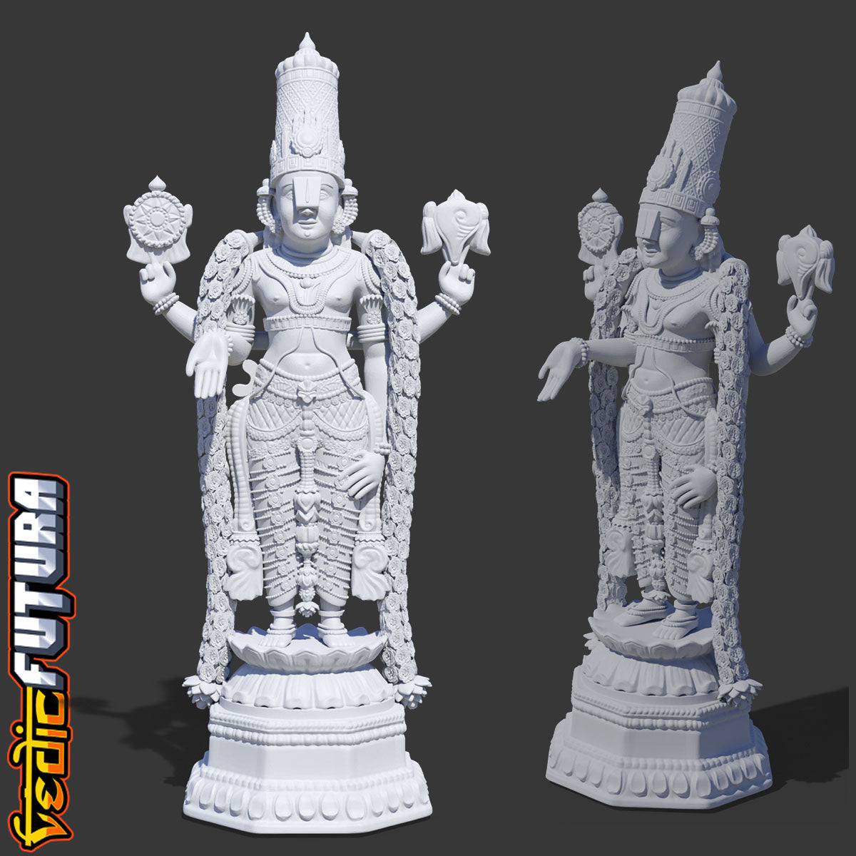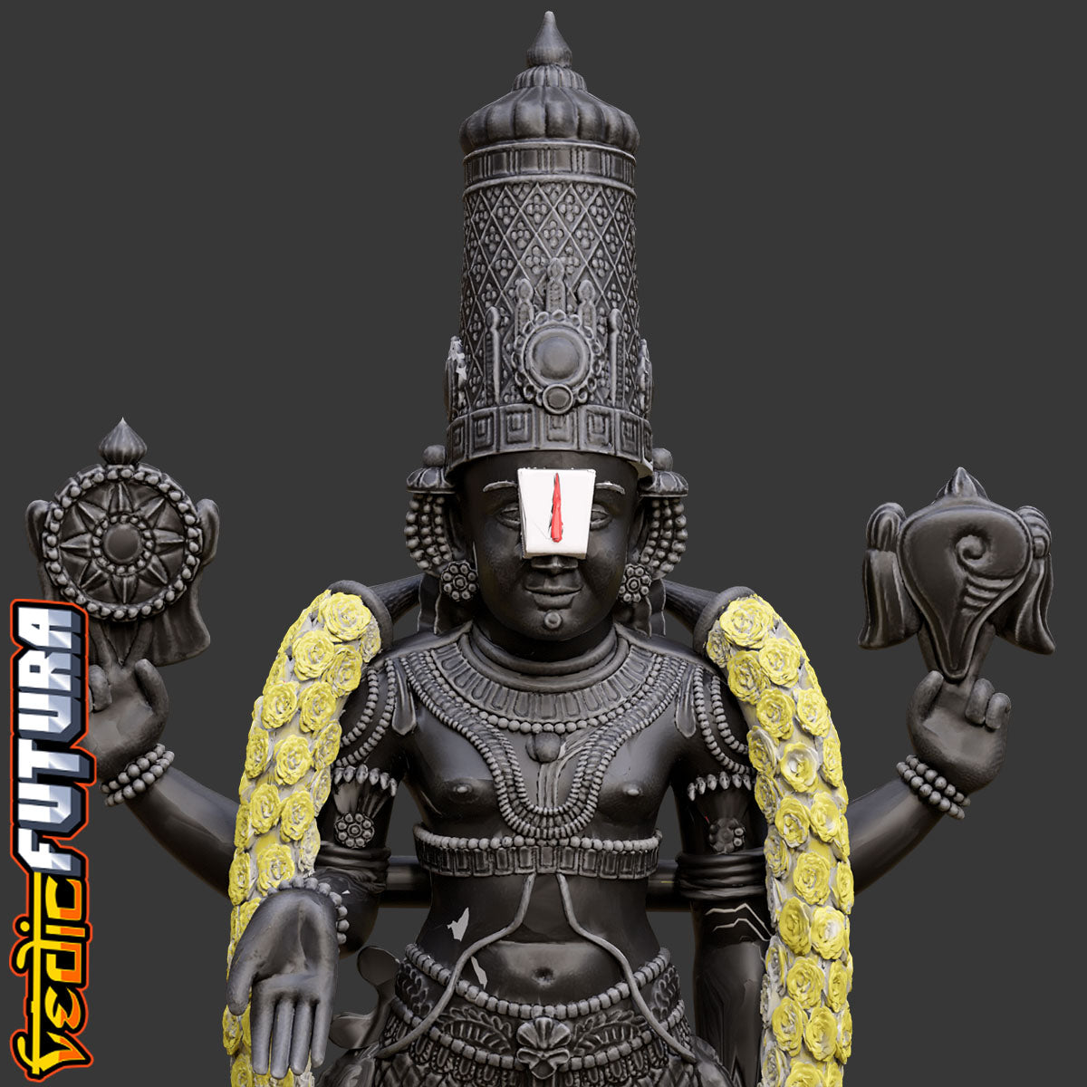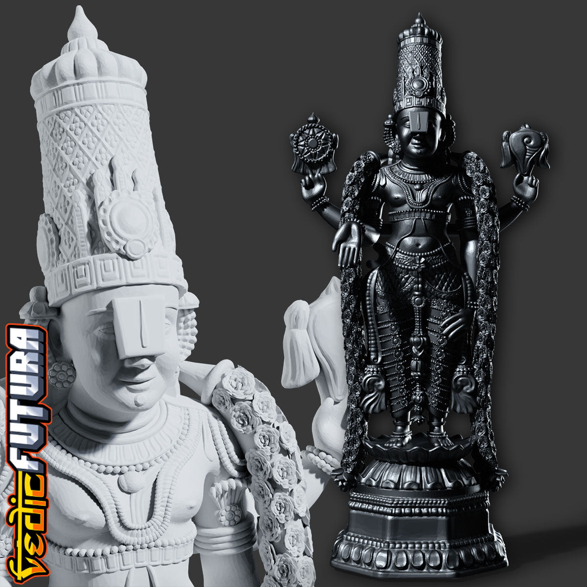 This sculpture depicts Lord Venkateswara, a revered form of Vishnu, standing in a majestic posture on a decorated pedestal. The figure is adorned with intricate jewelry, a tall cylindrical crown (kiritam), and cascading ornaments, symbolizing divine grandeur. His two upper hands hold the conch (Shankha) and discus (Chakra), traditional attributes of Vishnu, while his lower right hand is extended in the blessing (varada) mudra, offering grace to devotees. His lower left hand rests on his thigh, a gesture associated with calm and benevolence. Richly detailed with ornate drapery and embellishments, the sculpture embodies the grandeur and spiritual authority of Lord Venkateswara, central to the Tirupati temple tradition.