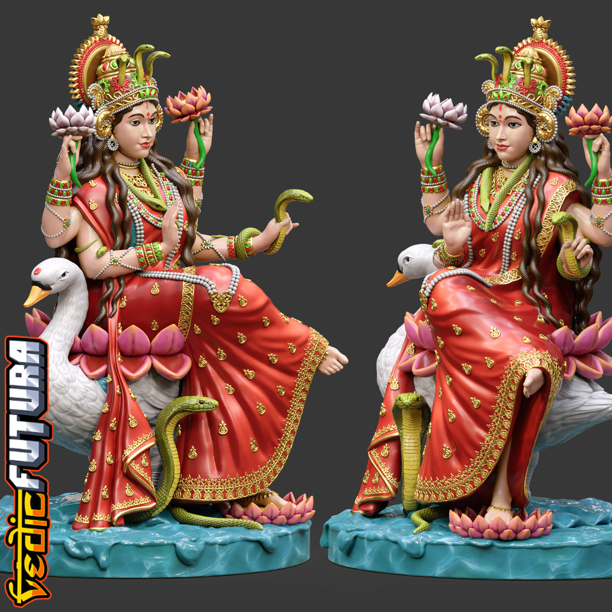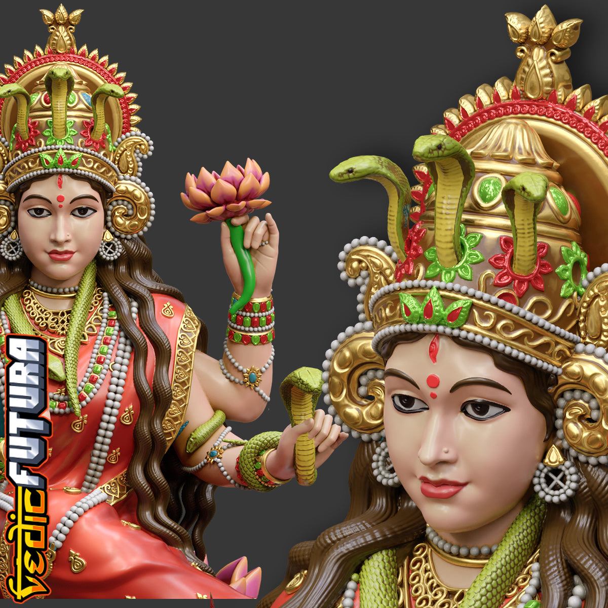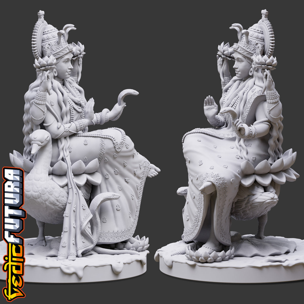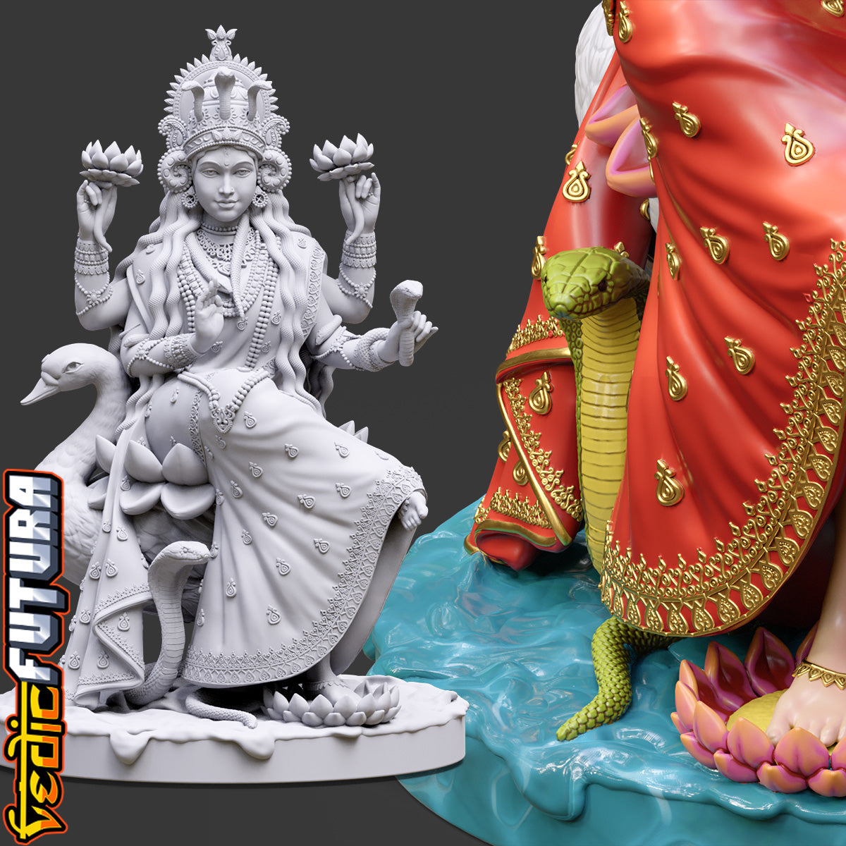 "This model depicts Manasa Devi, the serpent goddess, seated regally on her duck vahana. She holds lotuses and a vessel, with her lower right hand in abhaya mudra. A cobra rises at her feet while another coils around her arms, and her crown features a central snake motif, highlighting her dominion over serpents.