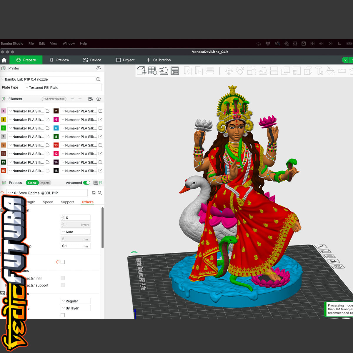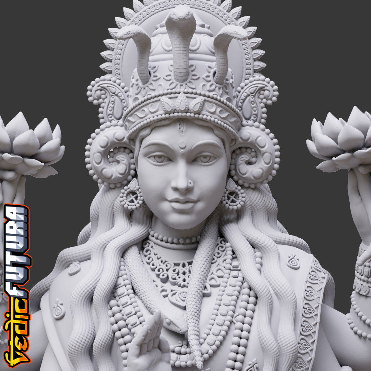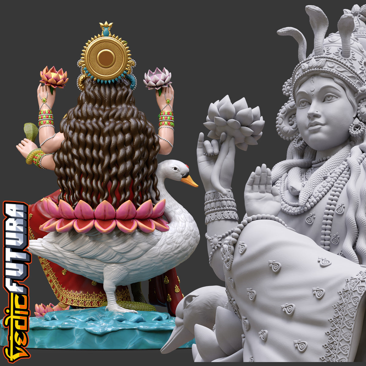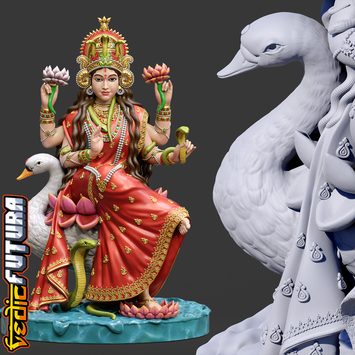 "This model depicts Manasa Devi, the serpent goddess, seated regally on her duck vahana. She holds lotuses and a vessel, with her lower right hand in abhaya mudra. A cobra rises at her feet while another coils around her arms, and her crown features a central snake motif, highlighting her dominion over serpents.