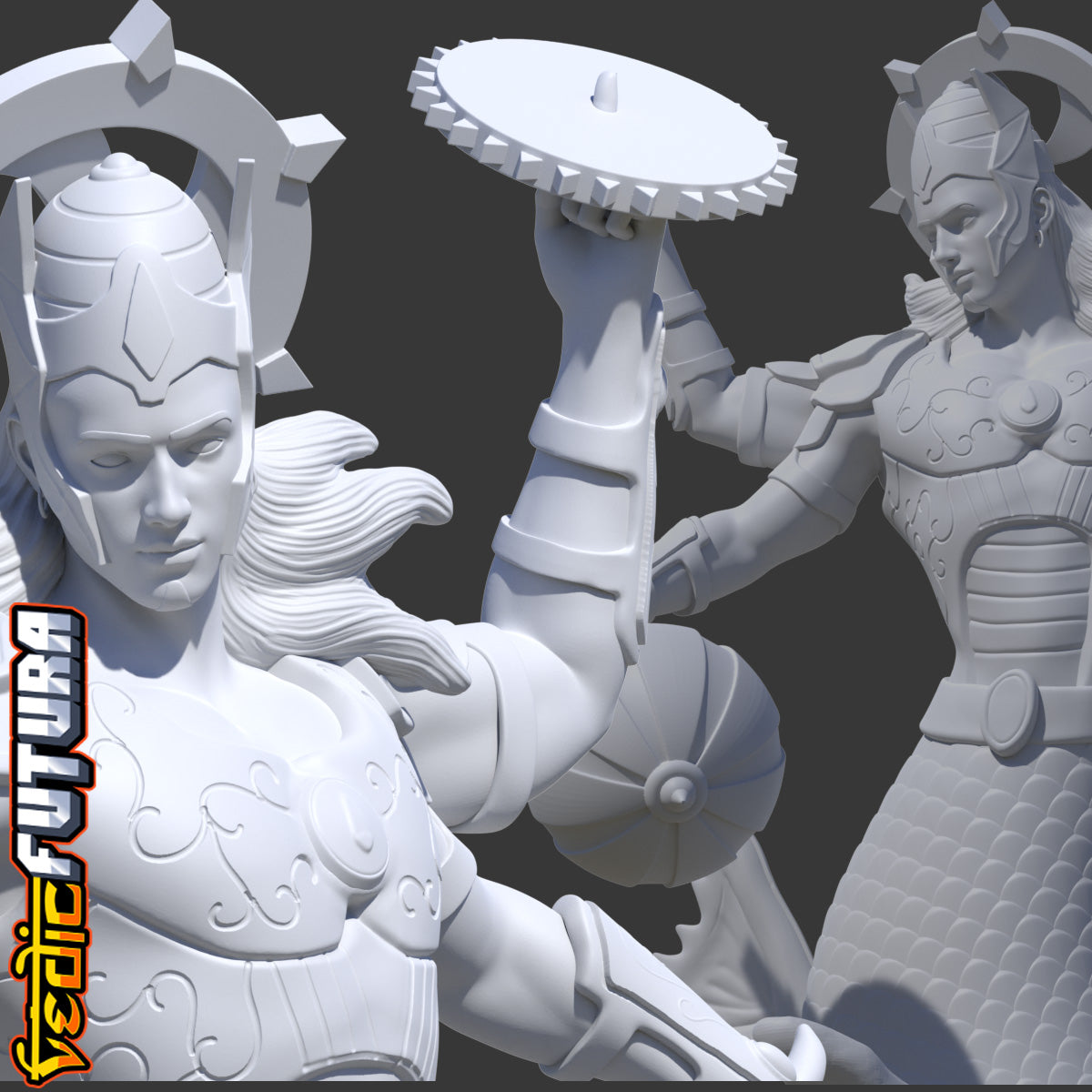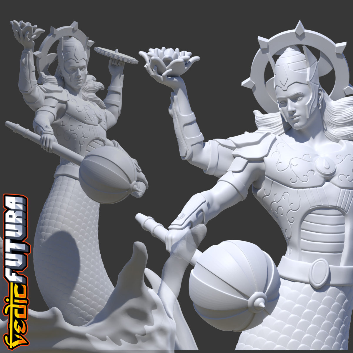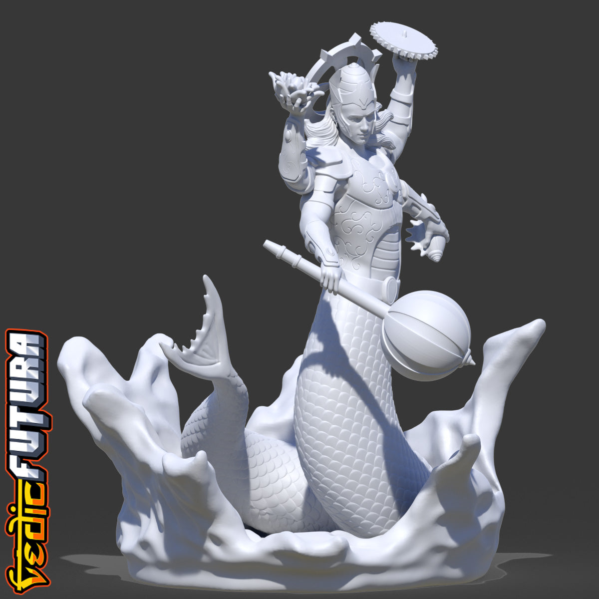 This striking sculpture is a contemporary interpretation of Matsya, the fish-avatar of the Hindu god Vishnu, depicted in a style heavily influenced by comic book art. Matsya is traditionally represented as a creature with the upper body of a human and the lower body of a fish, a form that symbolizes the first of Vishnu’s ten principal avatars (incarnations), which he assumes to save the world from destruction.