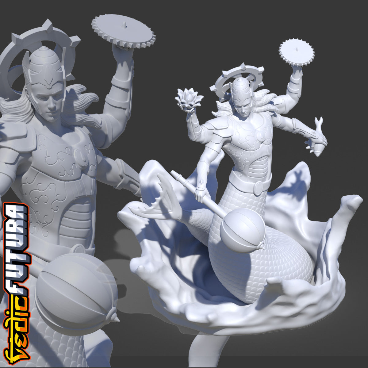 This representation of Matsya is reflective of the story where Vishnu transforms into this form to rescue the Vedas and a sage from a deluge that threatens the cosmic order, embodying the theme of divine intervention and the preservation of knowledge across epochs. This sculpture serves as a bridge between ancient mythology and modern artistic expression, inviting viewers to appreciate the fusion of cultural heritage with new-age artistry.