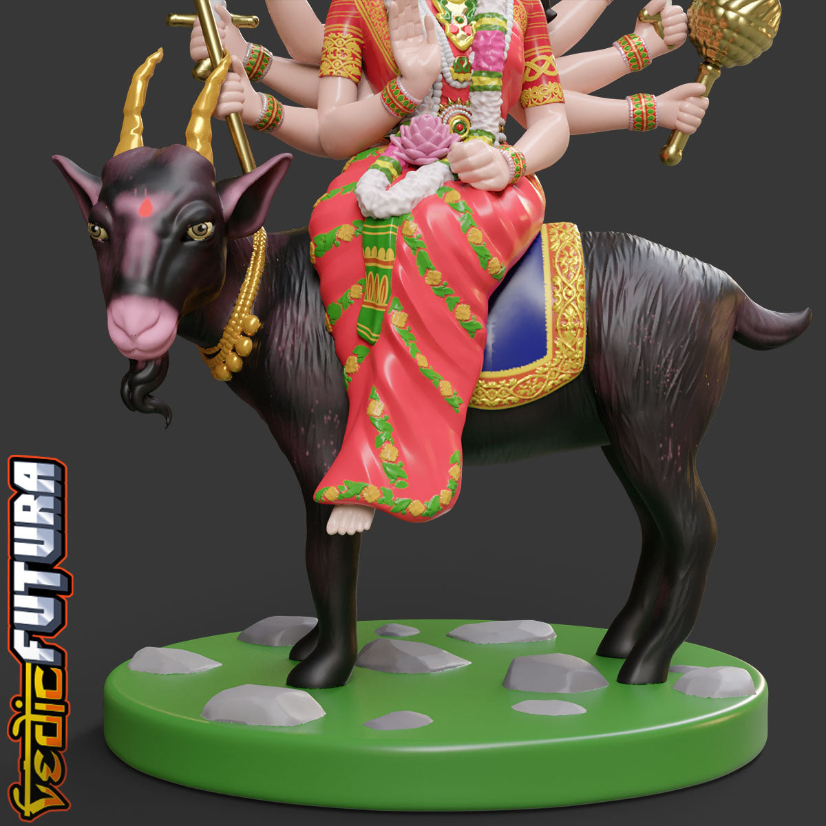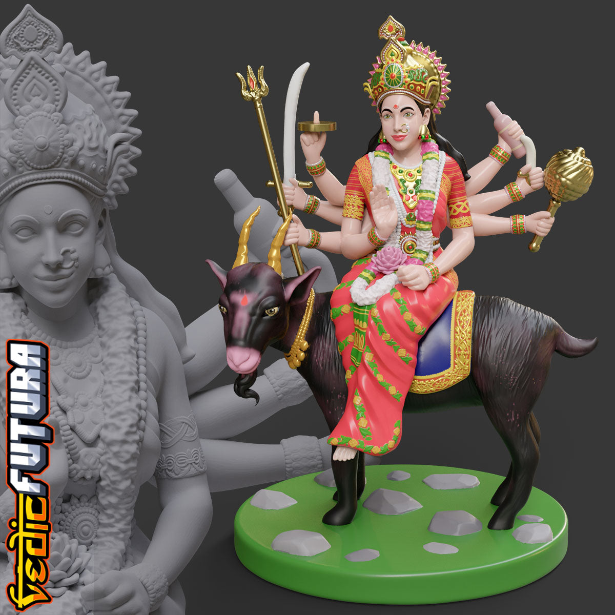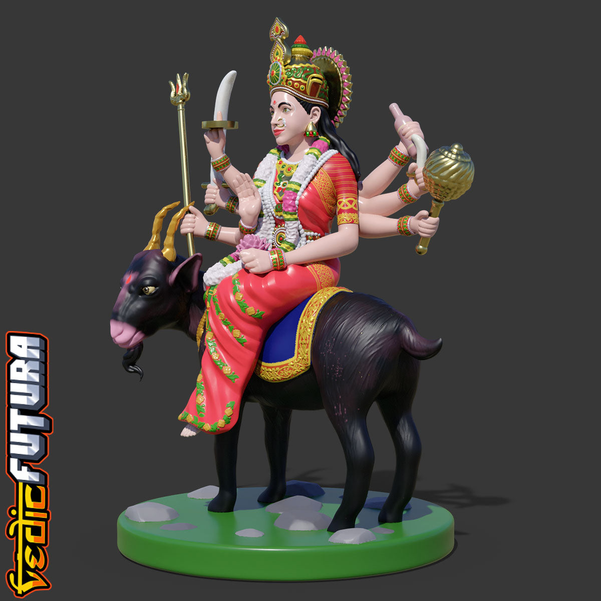 Meldi Mata is a Hindu goddess and household deity[1] who protects farmland.[2] A legend says that she can grant any wish. She is mainly famous in the western state of GujaratShe is a revered goddess for gujrati farming Hindus and people of Chunvalia Koli. Her vahana is a goat. She has eight hands which hold a variety of weapons. Mata Meldi has eight hands with different types of weapons. Mata holds a bottle in one hand, a dagger in the second, a trident in the third, a sword in the fourth, a mace in the fifth, a disc in the sixth, a lotus in the seventh, and the posture of abhay mudra in the eighth. All the tantric powers are sealed in the bottle in the hand of Meldi Mata.