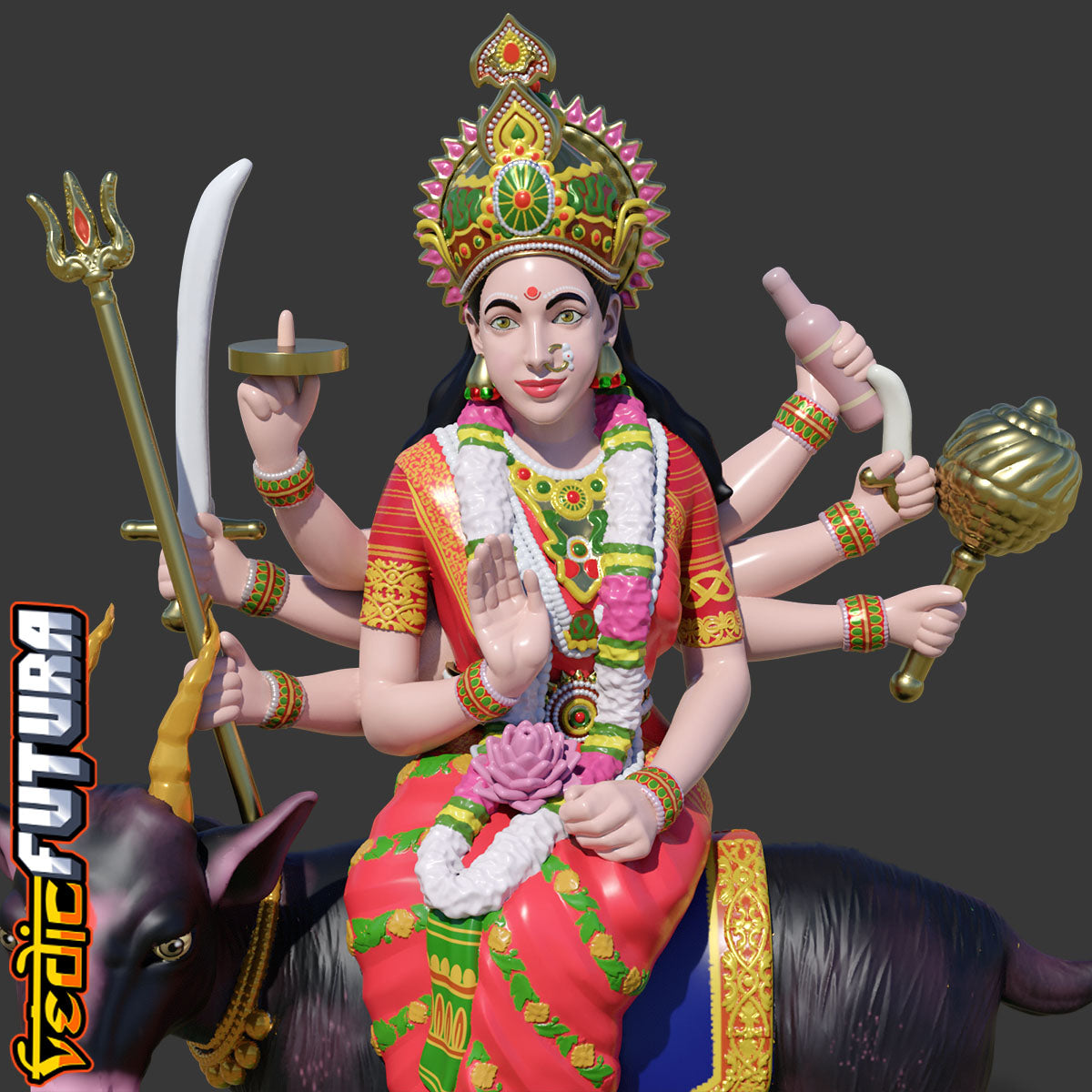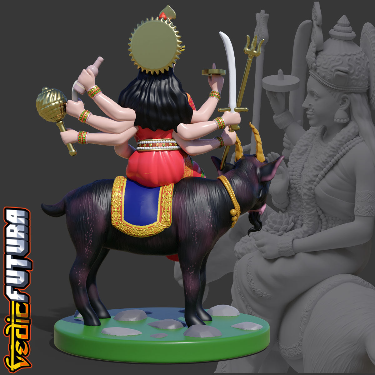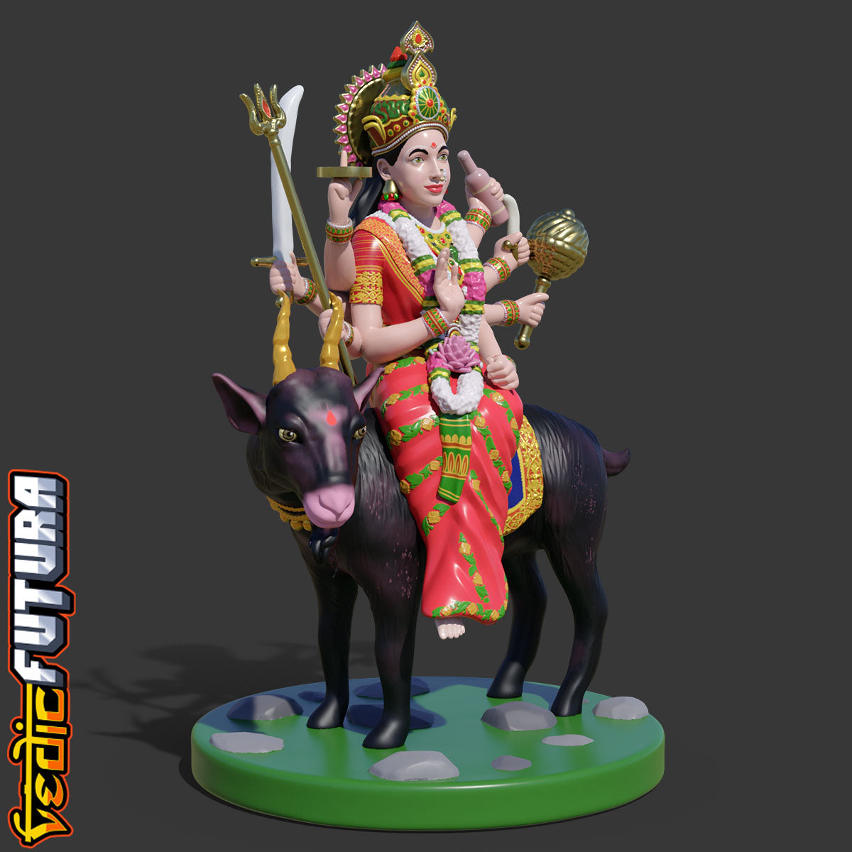 Meldi Mata is a Hindu goddess and household deity[1] who protects farmland.[2] A legend says that she can grant any wish. She is mainly famous in the western state of GujaratShe is a revered goddess for gujrati farming Hindus and people of Chunvalia Koli. Her vahana is a goat. She has eight hands which hold a variety of weapons. Mata Meldi has eight hands with different types of weapons. Mata holds a bottle in one hand, a dagger in the second, a trident in the third, a sword in the fourth, a mace in the fifth, a disc in the sixth, a lotus in the seventh, and the posture of abhay mudra in the eighth. All the tantric powers are sealed in the bottle in the hand of Meldi Mata.