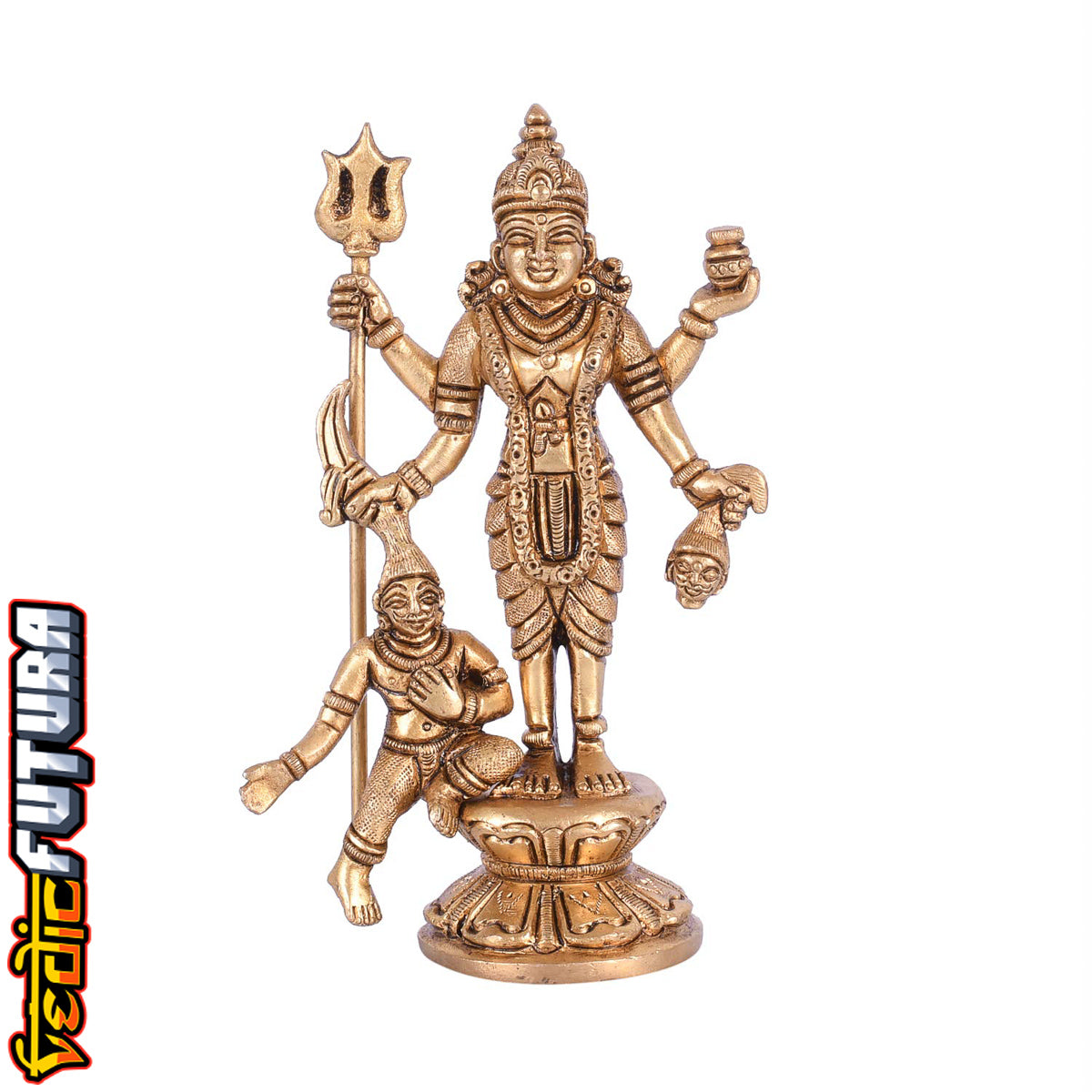 In the Mahalasa Narayani form, Mahalasa has four hands, carrying a Trishula, a sword, a severed head, and a drinking bowl. She also wears the yajnopavita (sacred thread), which is generally dedicated on male deities. She stands on a prostrate man or demon, as a tiger or lion licks blood dripping from the severed head.