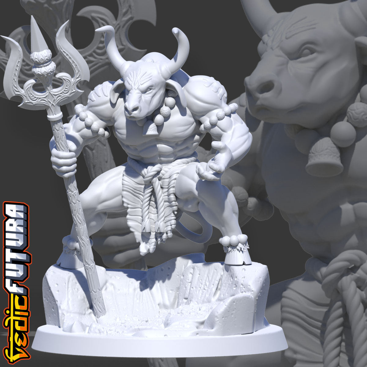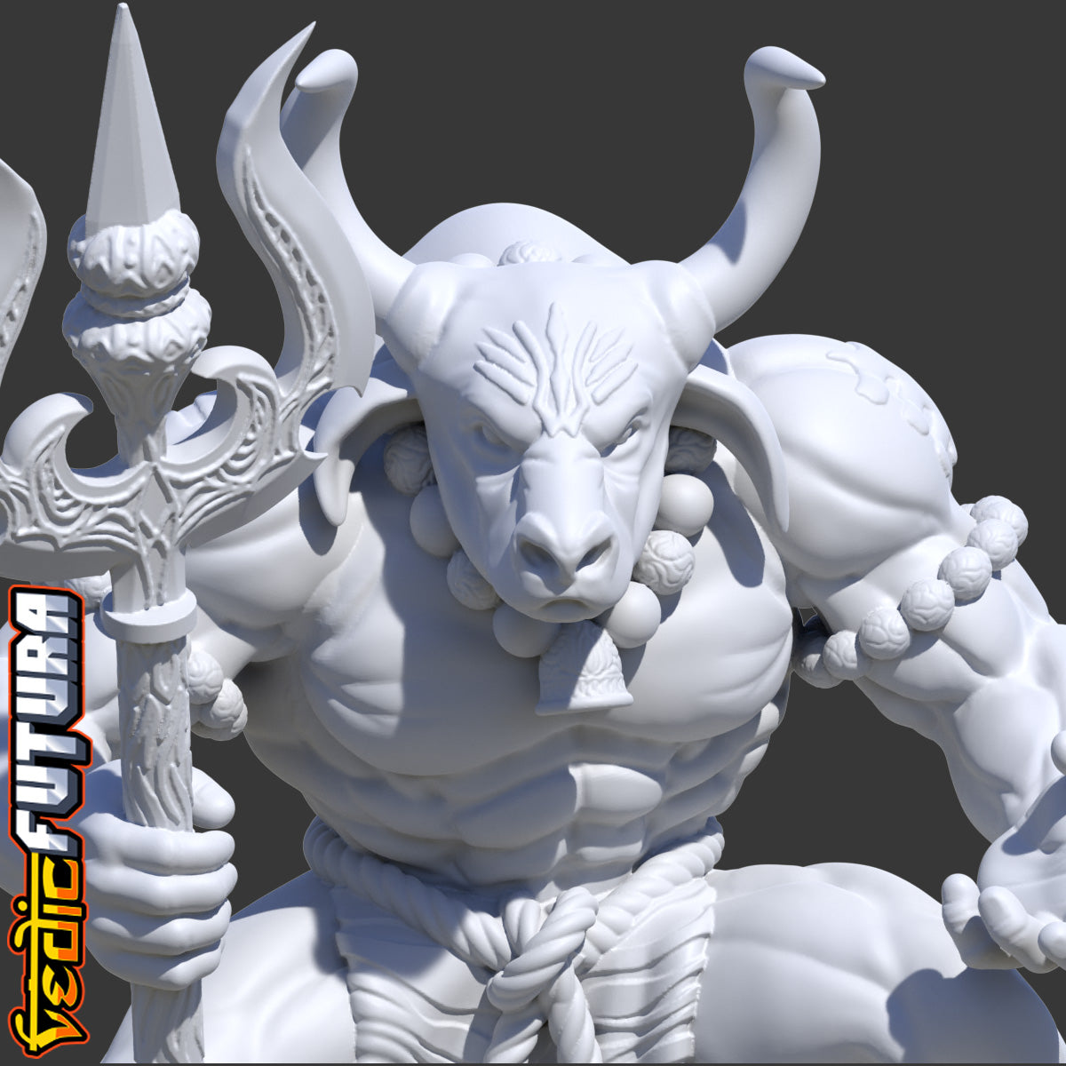 Adorned with rudraksha beads and marked with the three horizontal lines on his arms and forehead, symbols sacred to Shiva, Nandi's appearance underscores his divine connection and spiritual authority. Positioned ready for battle, this portrayal highlights Nandi's significance not just as a passive figure at the gates of Shiva temples, where a statue of him is traditionally placed, but as an active defender of the celestial realm. This modern representation blends ancient mythological elements with contemporary artistic styles, creating a powerful image of a timeless guardian.