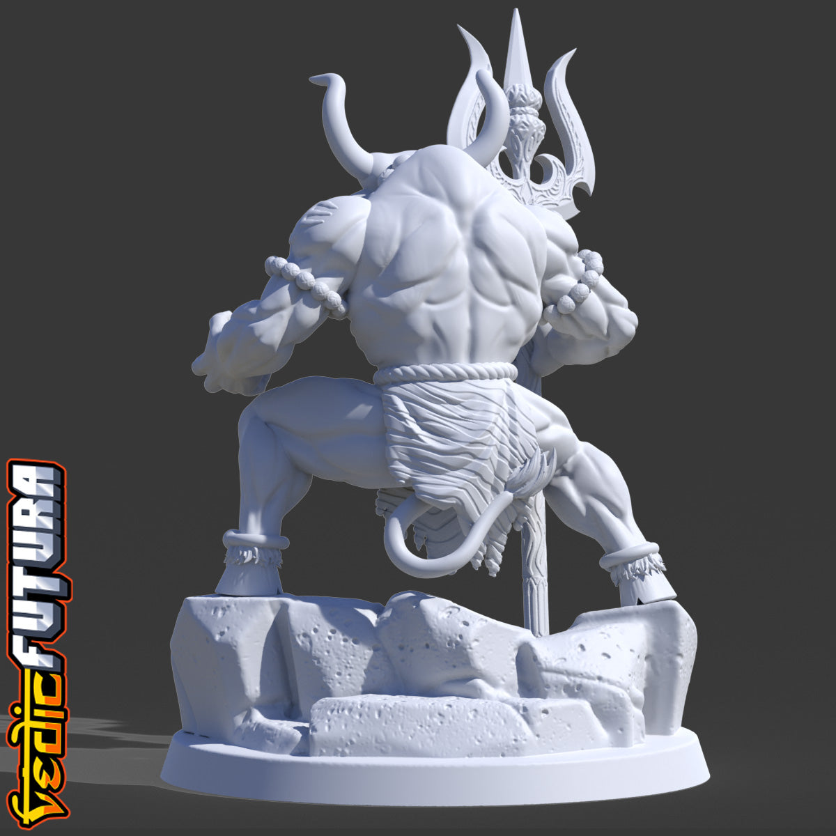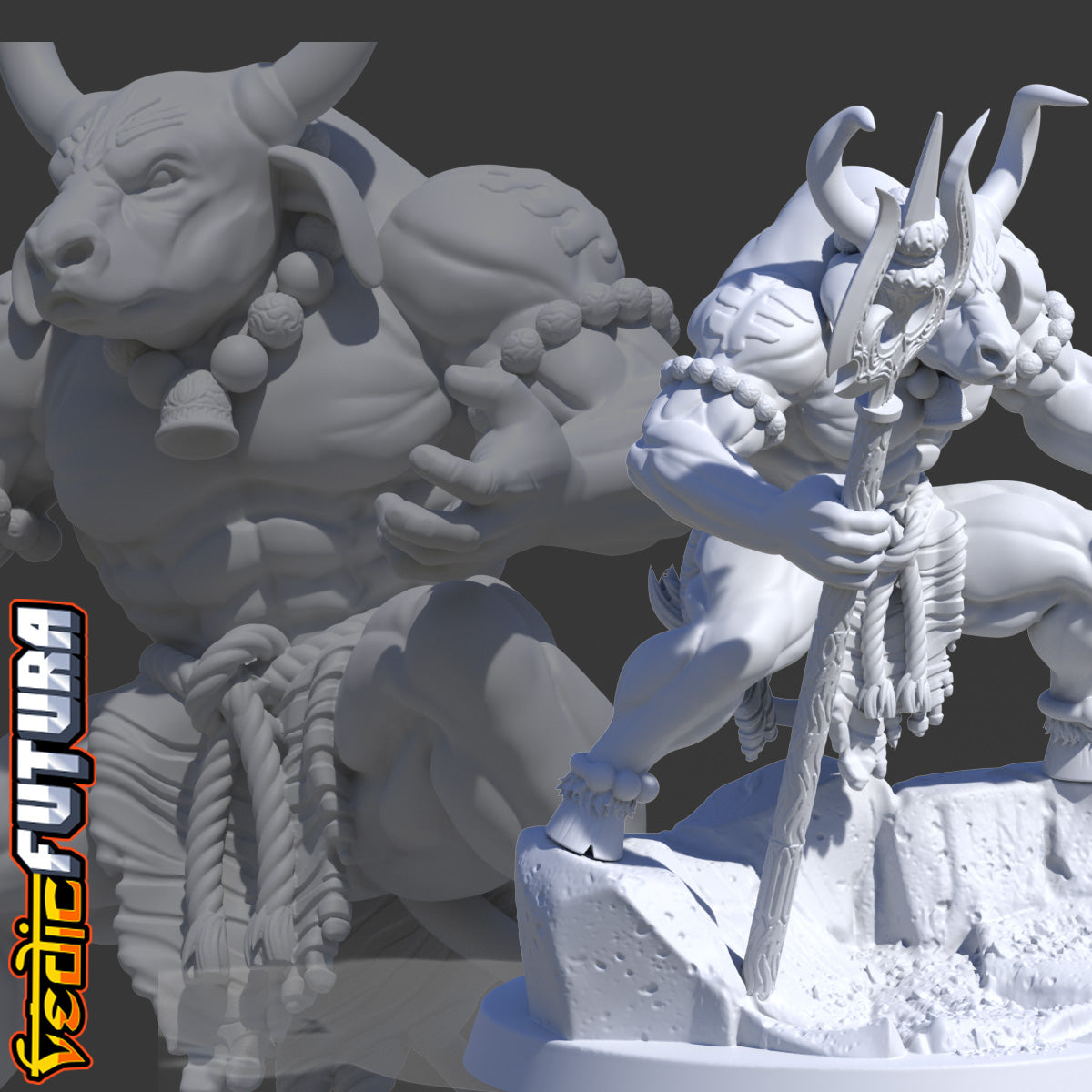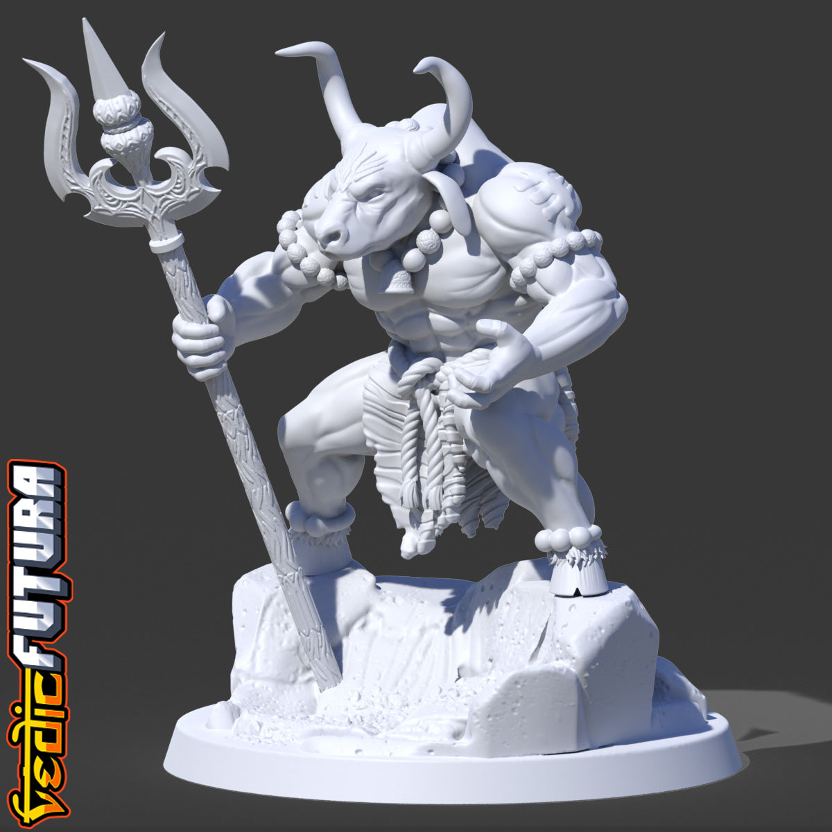 This sculpture offers a dynamic reinterpretation of Nandi, traditionally seen as Lord Shiva's mount and guardian of Shiva temples. Here, Nandi is depicted as a metahuman infused with superhero and manga influences, embodying both immense strength and a fierce warrior spirit. He holds a trident, signaling his devotion to Shiva and his role as a protector.