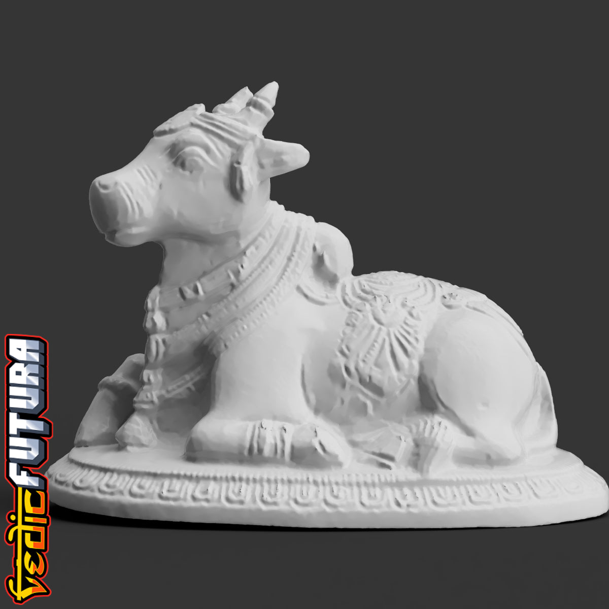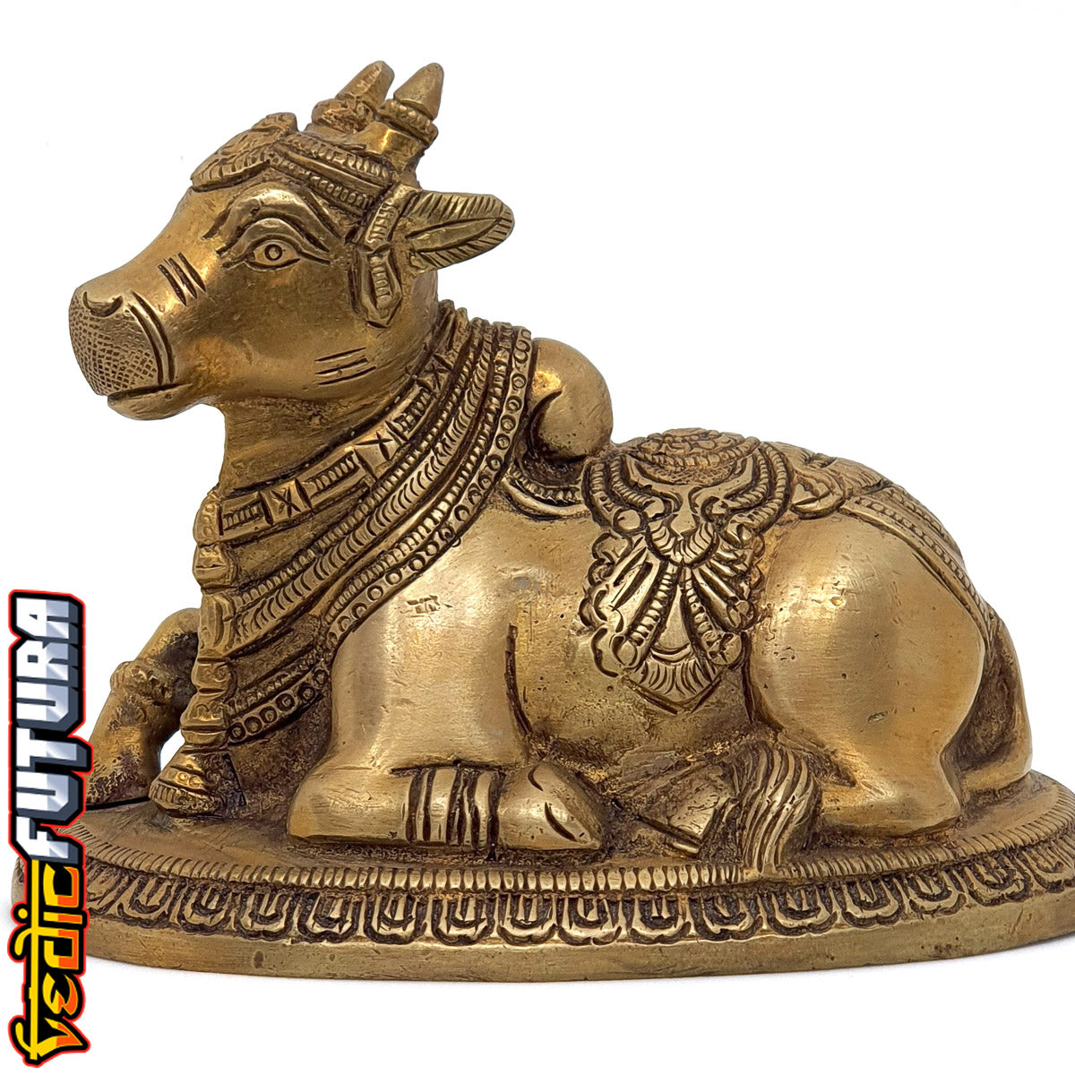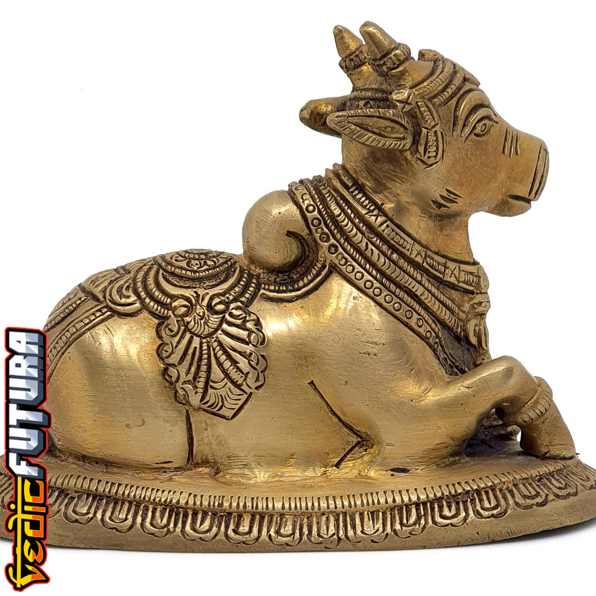 Nandi is the sacred bull calf, gatekeeper, and vehicle (vahana) of the Hindu god Shiva. Sculptures of Nandi are a common sight at Hindu temples dedicated to his master, and he is partly responsible for the Hindu reverence for living bulls even today. A statue of Nandi is present as a bull sitting on a plinth in front of most Hindu temples dedicated to Shiva. The bull is often dressed by worshippers with bells, clappers, and a necklace of flowers.