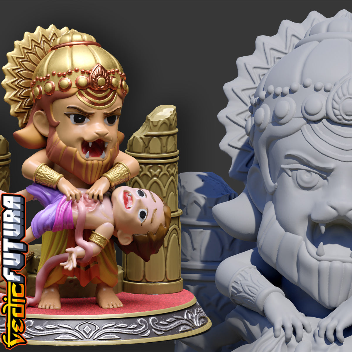 This model shows Lord Narasimha, in chibi form, emerging from a broken pillar and disemboweling the demon king Hiranyakashipu. Narasimha has a lion face, a crown, and clawed hands, while the demon lies across his lap with his chest torn open. Two broken pillars frame the scene, with Hiranyakashipu’s crown fallen beside him.