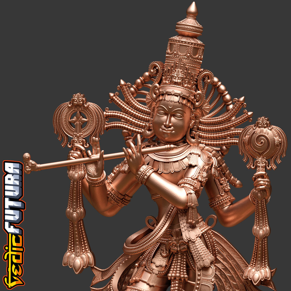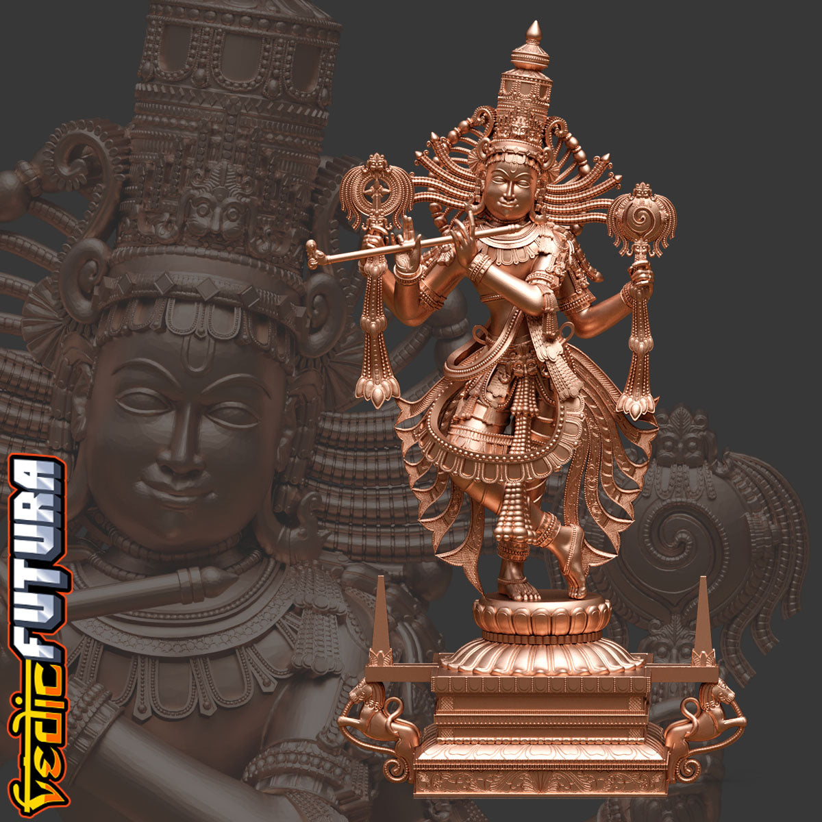 This intricate bronze sculpture depicts Venugopal, a synthesis of Krishna and Vishnu, blending the attributes of both deities—Krishna’s flute alongside Vishnu’s conch (shankha) and discus (chakra). Crafted in the ornate Hoysala style, the figure is adorned with detailed jewelry, flowing tassels, and a prominent cylindrical crown, or kiritamukuta. The base is richly carved on all sides and features two singhs (lions) supporting prongs, allowing for ceremonial transport during processions. This piece is a faithful recreation of the classic depiction of Krishna as Venugopal, capturing the elegance and devotional symbolism characteristic of South Indian bronze sculpture from the Chola era.