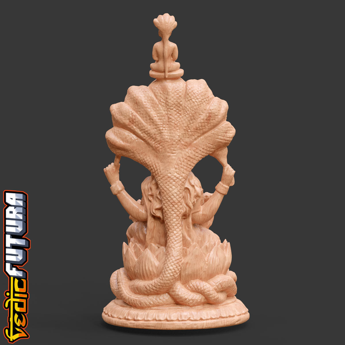 This statue depicts Padmavati Mata, revered as the consort of Lord Parshvanatha, the 23rd Tirthankara in Jainism. She is seated in a serene and dignified posture, holding symbolic items—a lotus, symbolizing purity and spiritual awakening, and other divine emblems that denote protection and abundance. The seven-headed serpent canopy behind her, with a figure of Parshvanatha above, signifies her connection to the Tirthankara, who is often depicted with a serpent canopy as his protector. The snake represents resilience, transformation, and protection in Jain and Hindu iconography. Padmavati Mata is venerated as a goddess of wisdom, fertility, and prosperity. In Jain tradition, she serves as a guardian deity, particularly invoked by devotees seeking success and the removal of obstacles. The intricately detailed crown and jewelry signify her divine status, while the calm expression reflects her role as a compassionate protector of devotees.