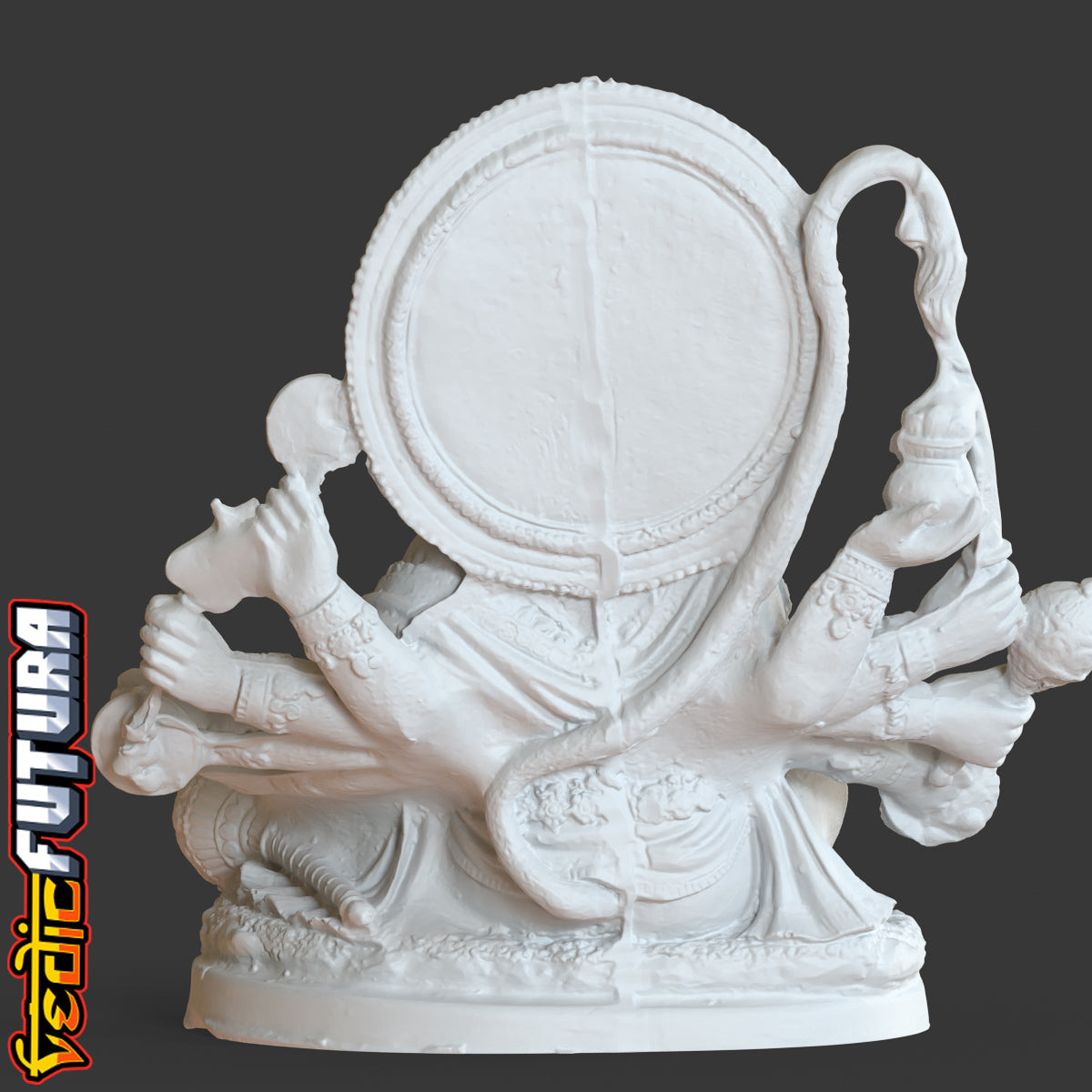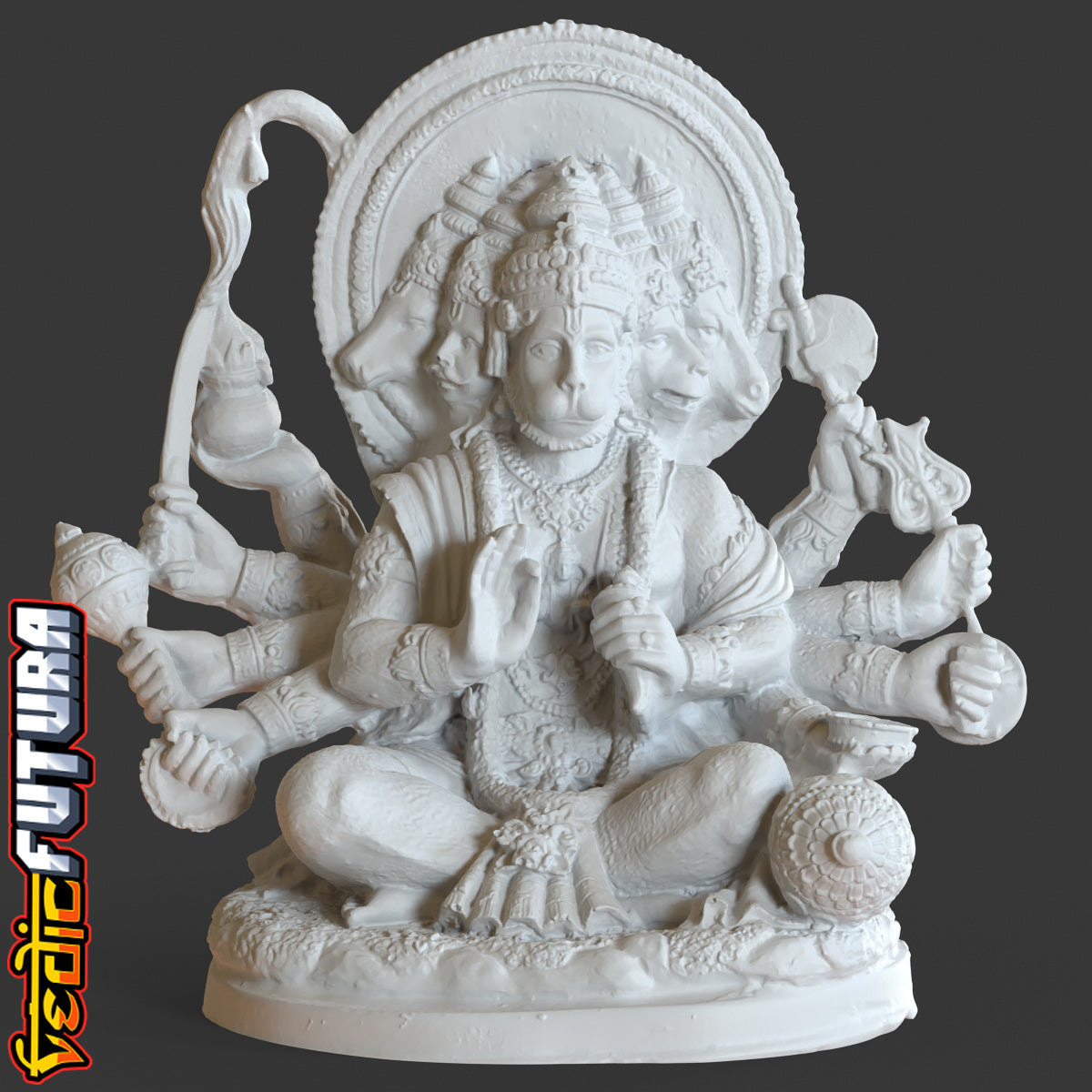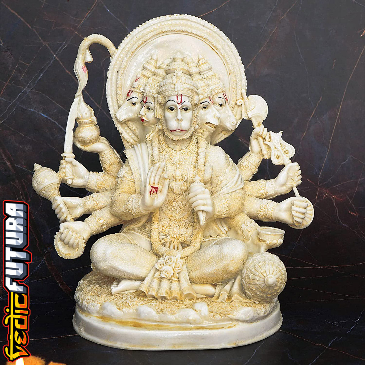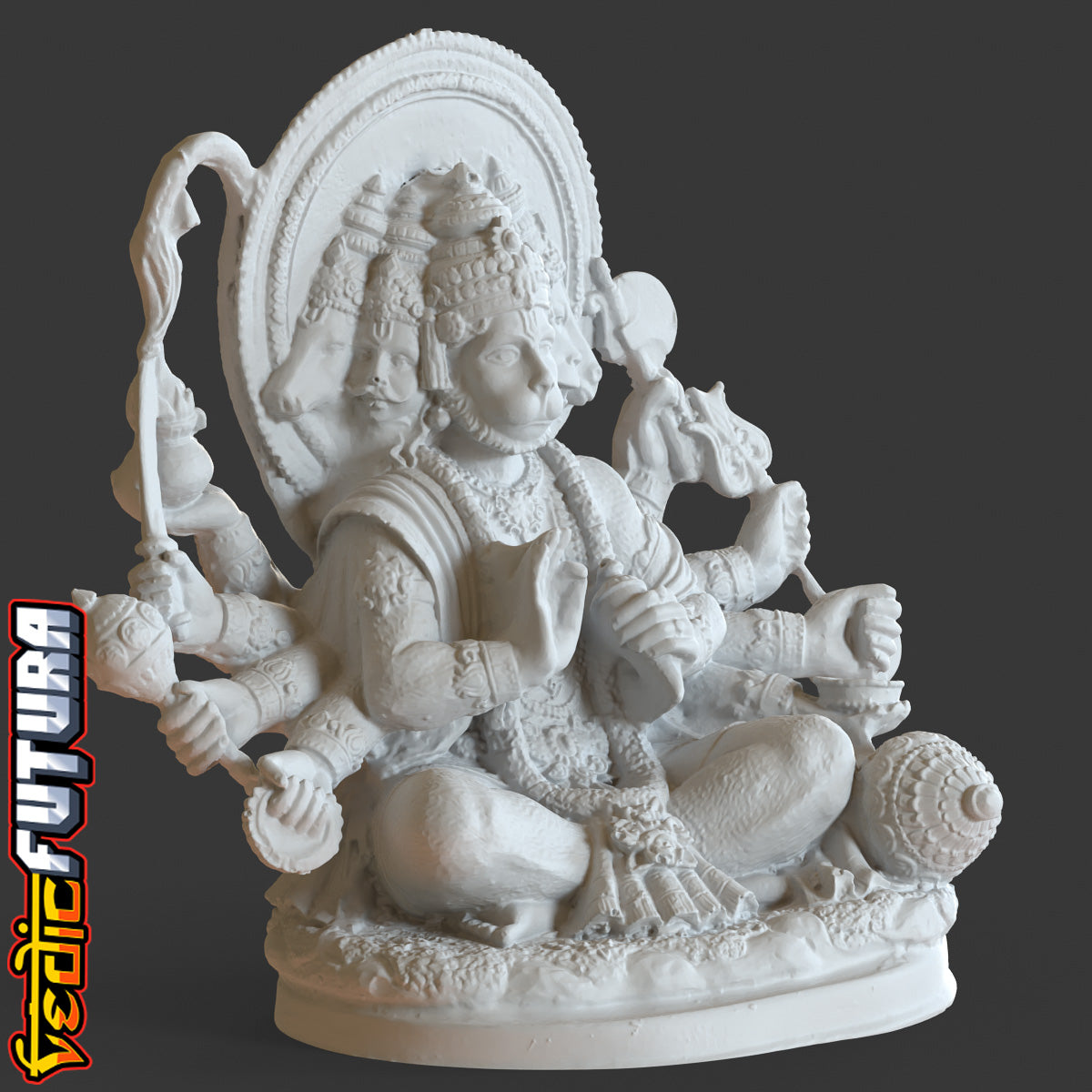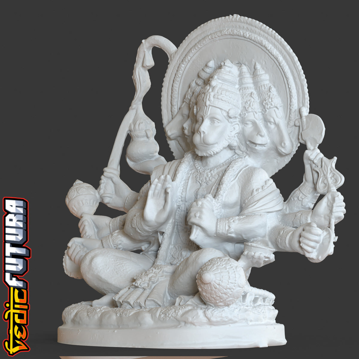 This image of Hanuman with five heads is considered as one of the powerful and sacred form of Hanuman and often worshipped by people for strength, wisdom, and devotion. In this specific representation, Hanuman is sitting down, which could symbolize his humility, devotion and focus. Each head is that of a deity associated with Vishnu, and is depicted to be facing a cardinal direction: Hanuman faces the east, Narasimha faces the south, Varaha faces the north, Garuda faces the west, and Hayagriva faces the sky.