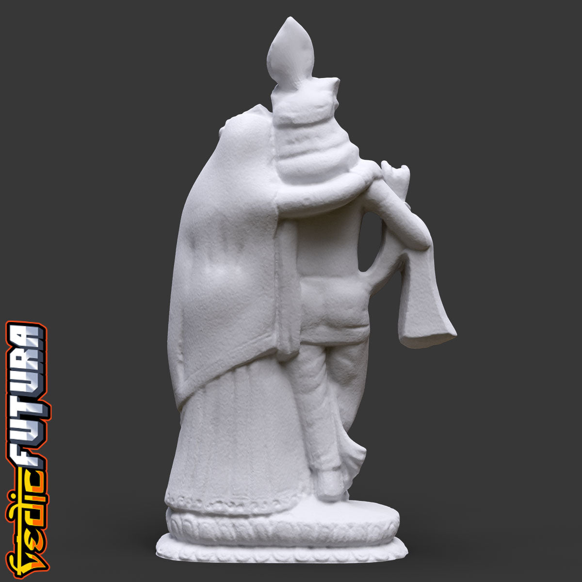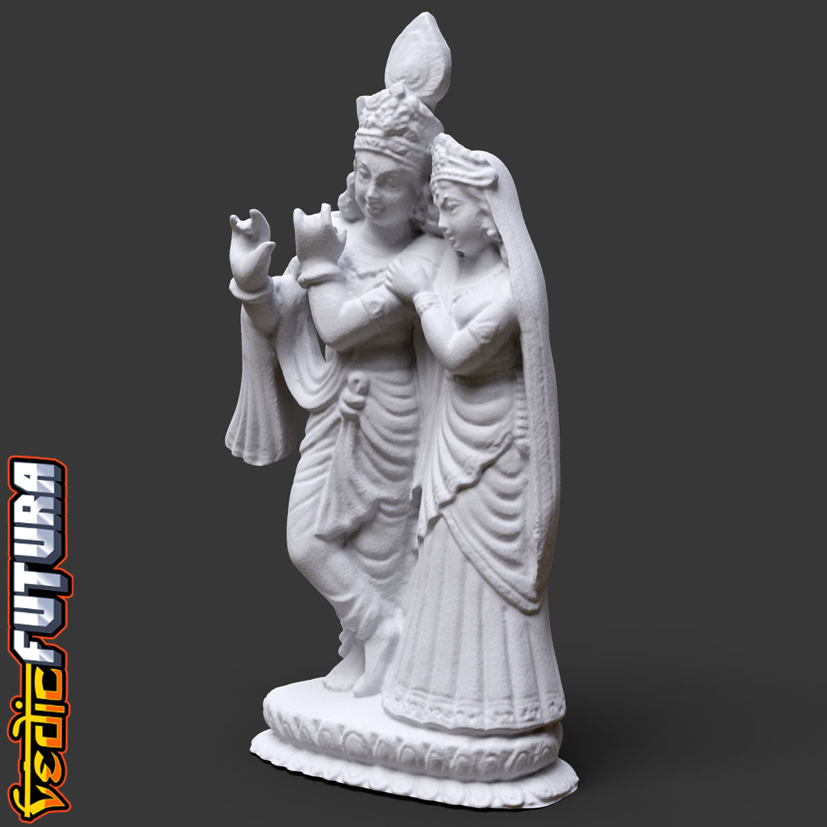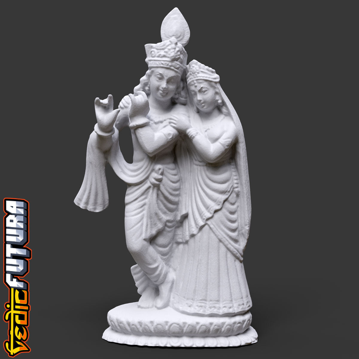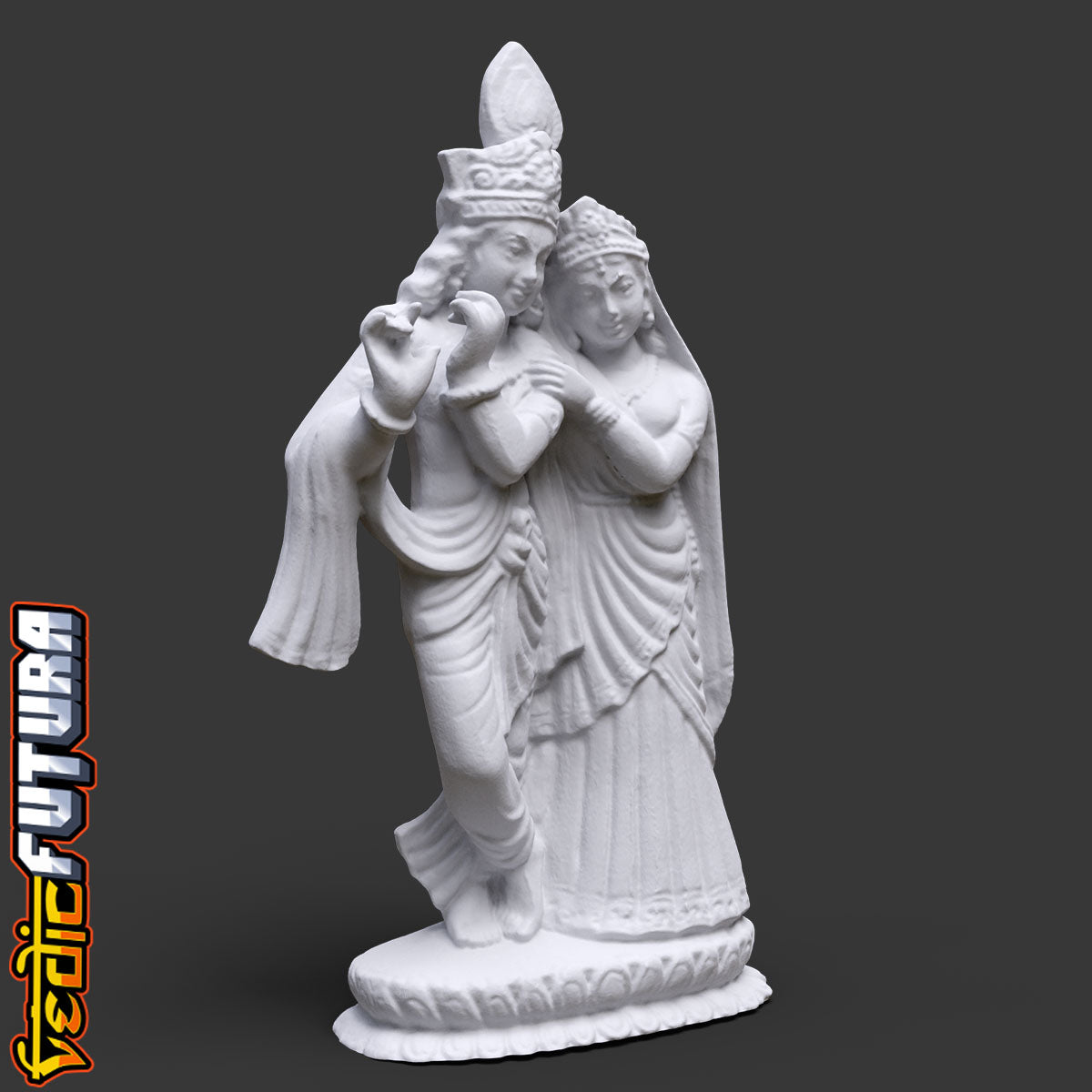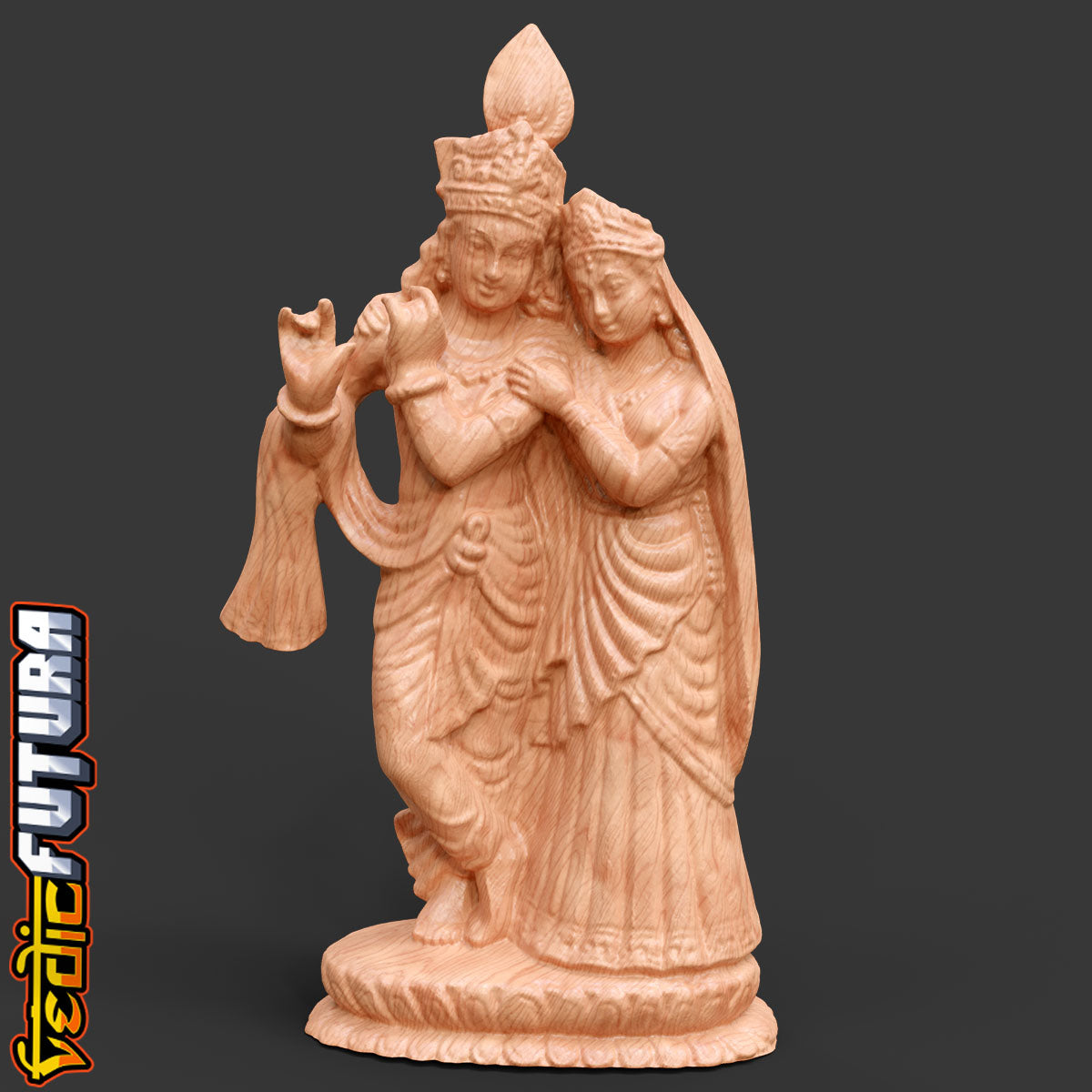 This statue presents Radha and Krishna in a poised, harmonious stance. Krishna is depicted playing the flute, his figure slightly angled as he stands on a round, lotus-adorned pedestal. Radha stands close beside him, her hand resting near his shoulder, embodying her devotion and grace. The sculpture showcases traditional details in their attire and adornments, reflecting classic iconography associated with Radha and Krishna. Together, they symbolize divine love, with Krishna’s flute symbolizing the enchanting call of the divine, and Radha’s presence embodying devoted reverence.