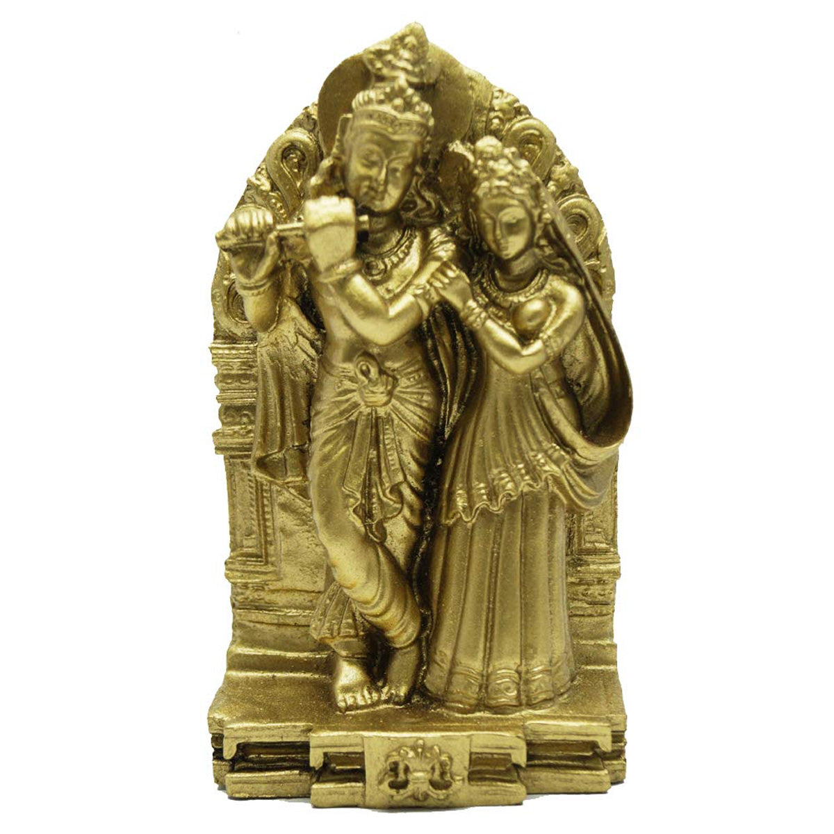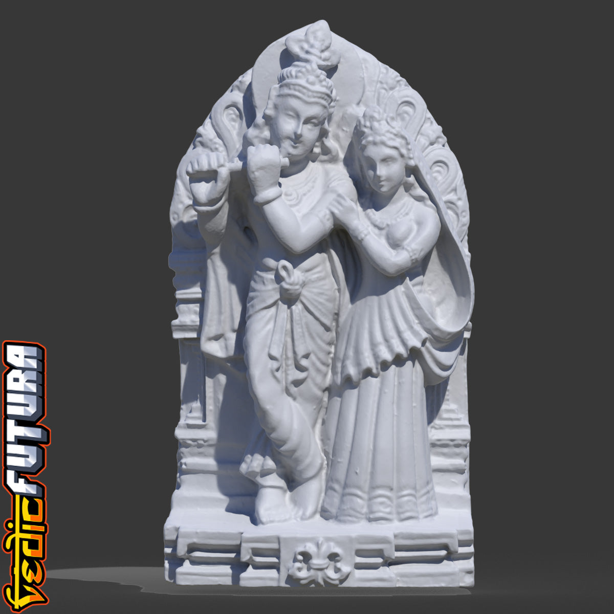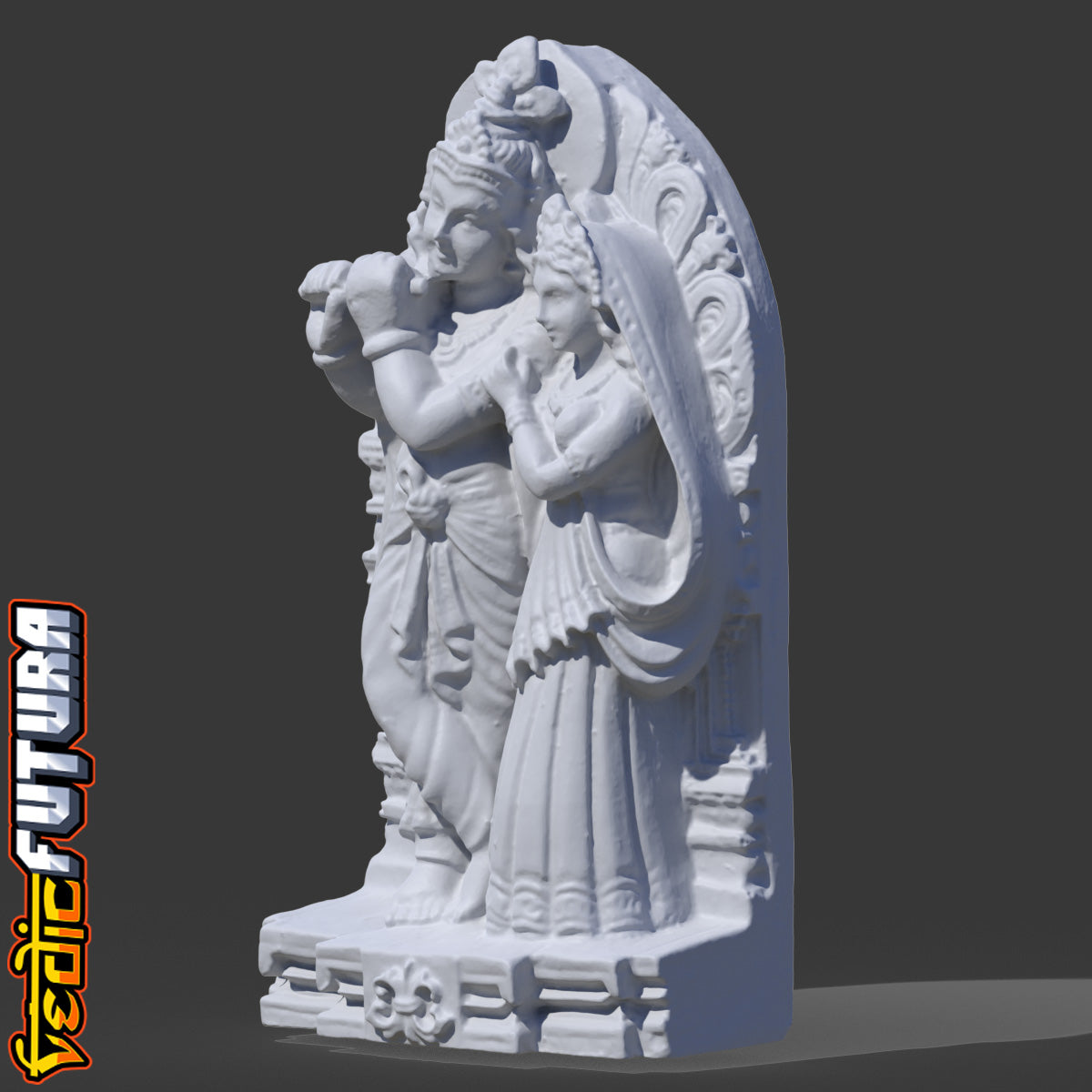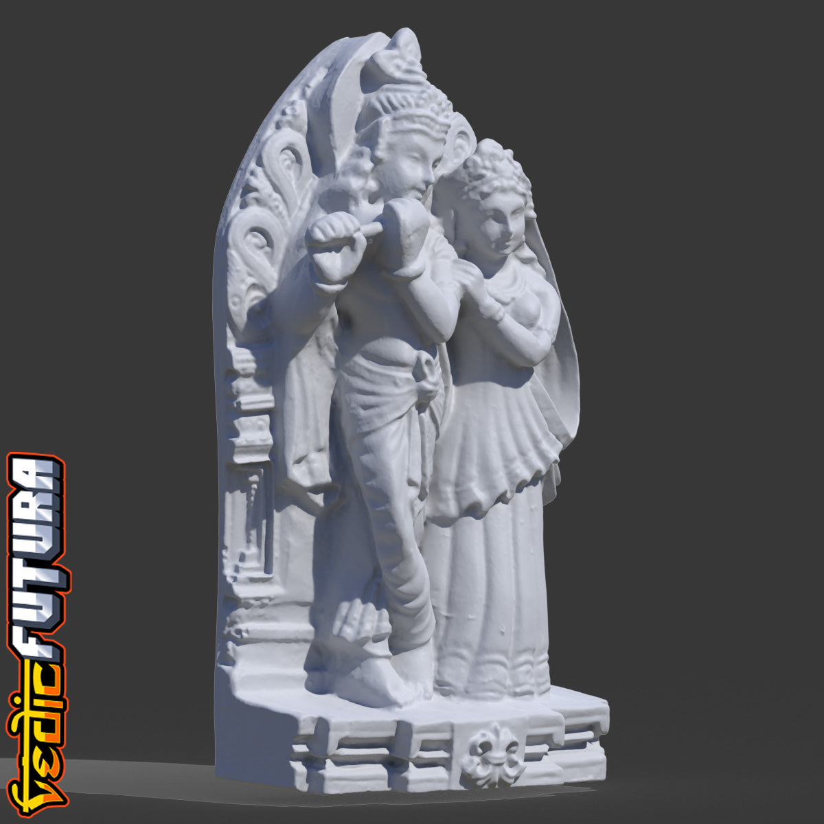 This sculpture poignantly captures the divine love between Radha and Krishna, two of the most celebrated figures in Hindu spirituality. Krishna, depicted in his iconic pose with a flute to his lips, symbolizes divine joy and cosmic music. Standing beside him is Radha, leaning tenderly on Krishna's shoulder, embodying the devotion and love that she is revered for. This intimate gesture highlights their inseparable bond and mutual affection.