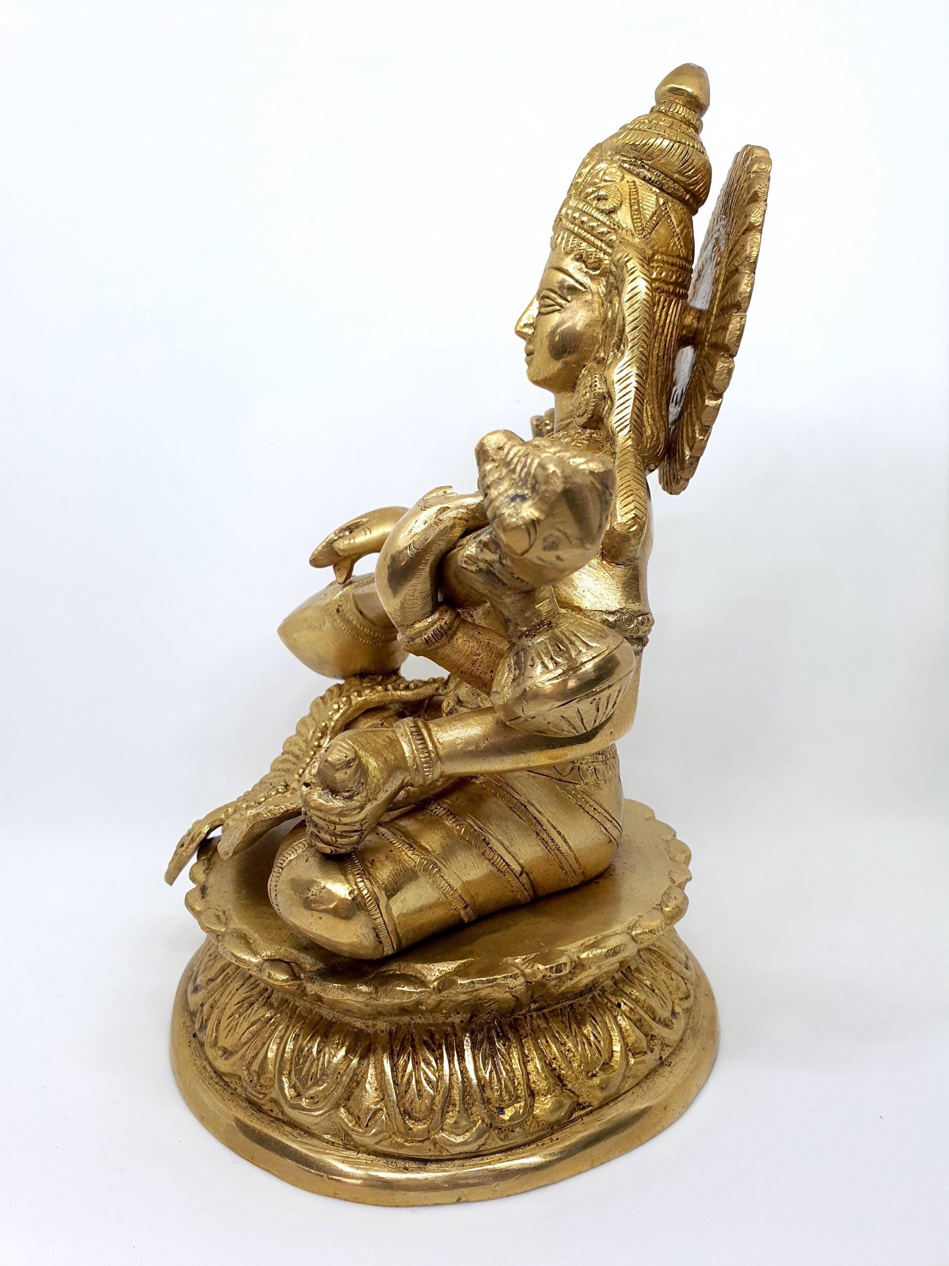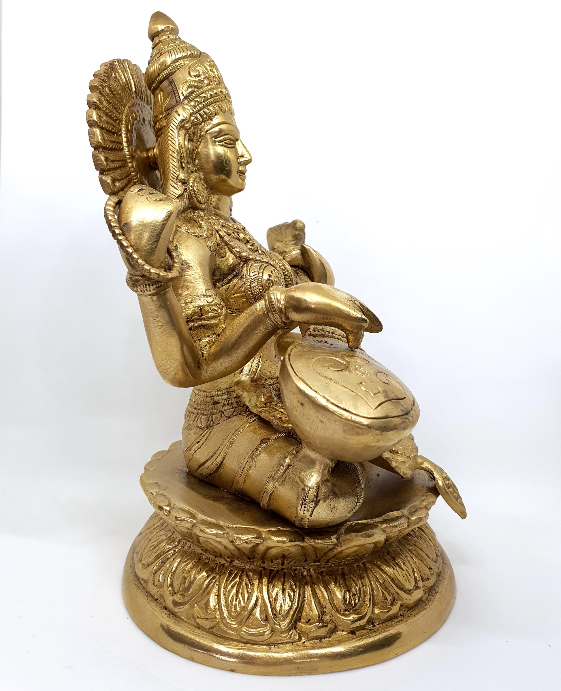 The most famous feature on Saraswati is a musical instrument called a veena, represents all creative arts and sciences, and her holding it symbolizes expressing knowledge that creates harmony. Saraswati is also associated with anurāga, the love for and rhythm of music, which represents all emotions and feelings expressed in speech or music.