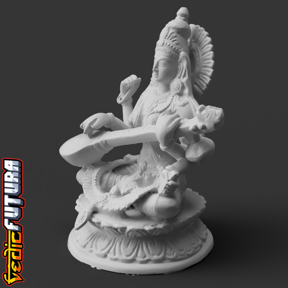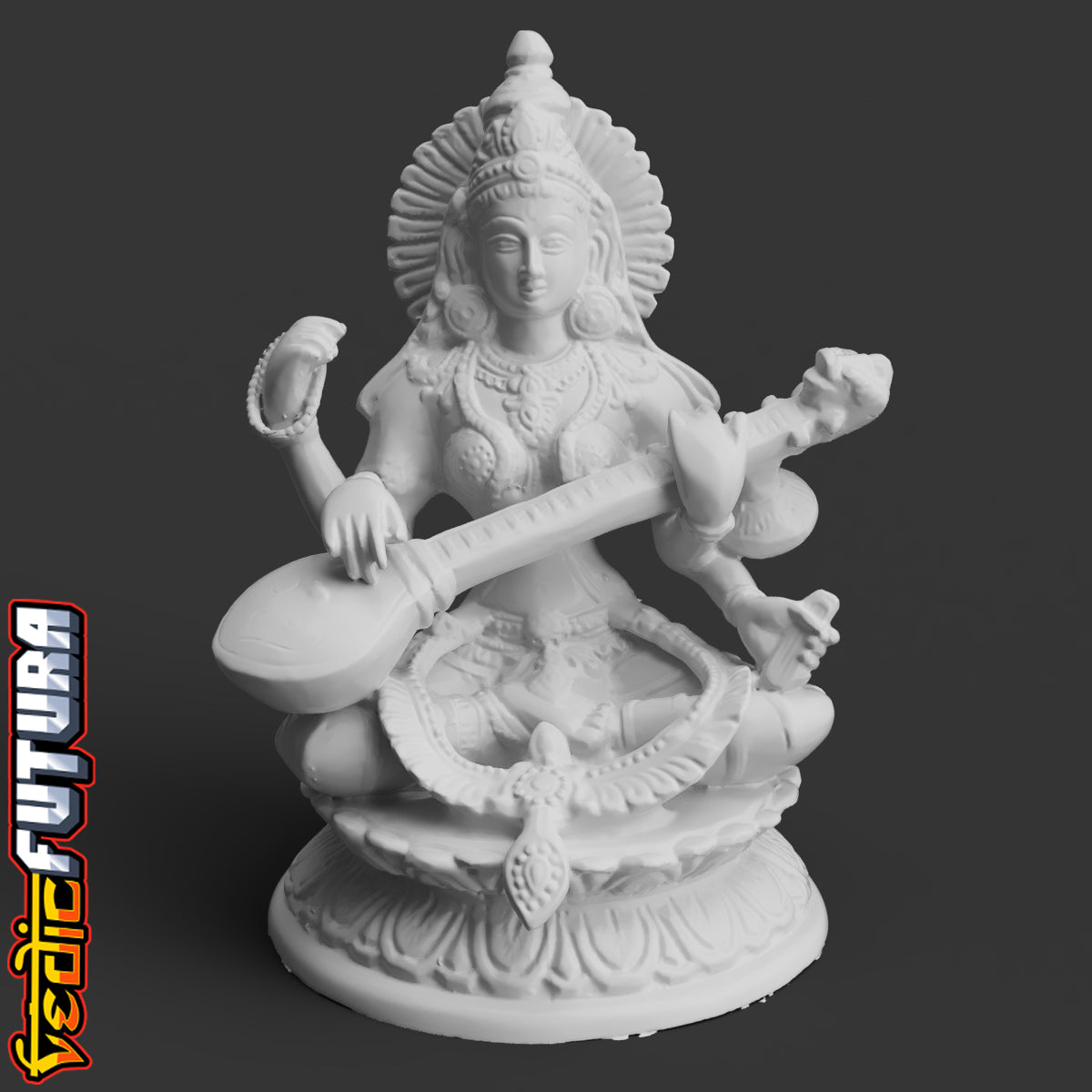 Saraswati (IAST: Sarasvatī) is the Hindu goddess of knowledge, music, art, speech, wisdom, and learning. She is generally shown to have four arms. The four hands hold items with symbolic meaning. The book she holds symbolizes the Vedas representing the universal, divine, eternal, and true knowledge as well as all forms of learning. A mālā of crystals, representing the power of meditation, inner reflection, and spirituality.