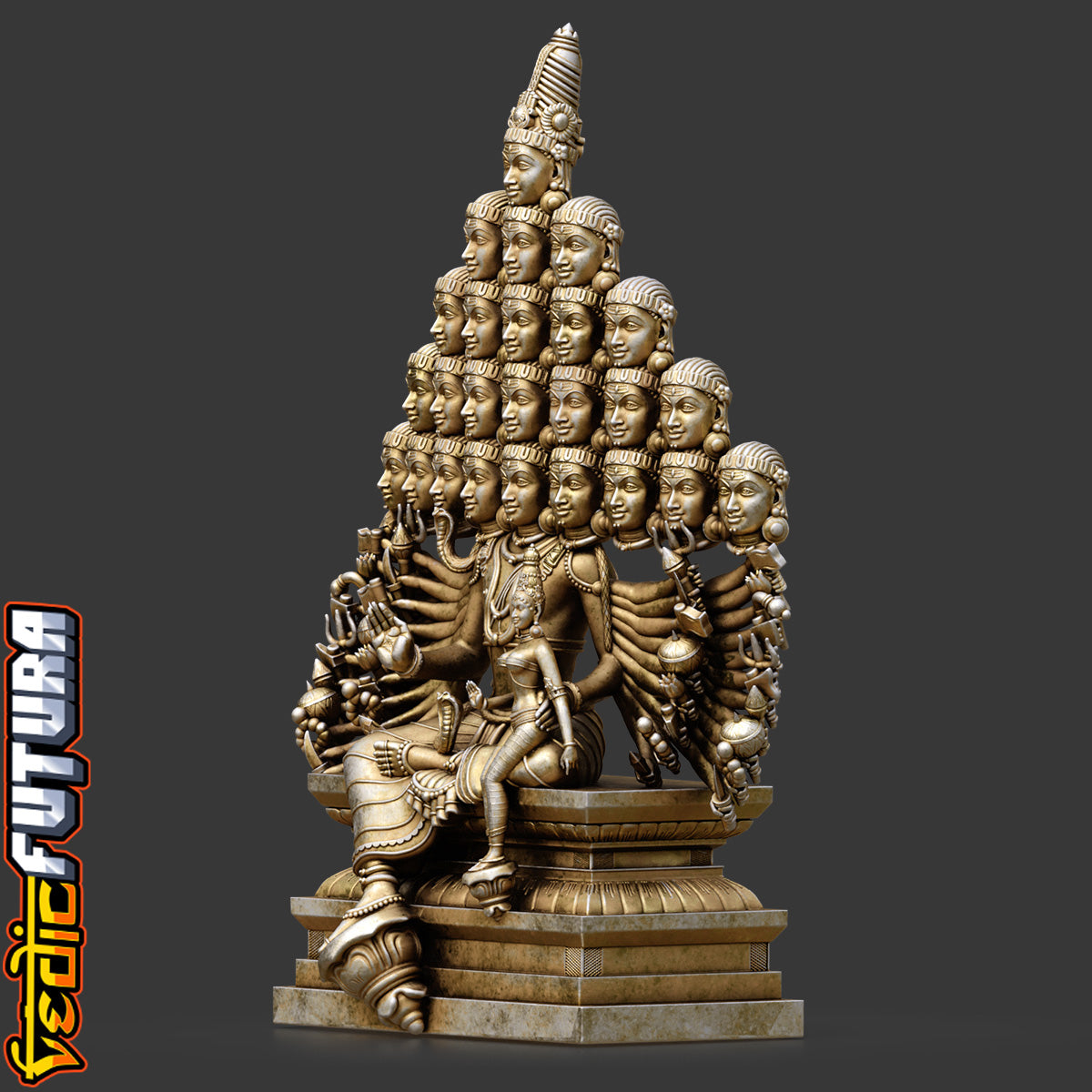 "This intricately sculpted 3D model represents Maha SadaShiva, one of the most esoteric and expansive forms of Shiva from the 64 Maheshwara Murtams. With 25 heads, 75 eyes, and 50 arms, this form symbolizes the totality of the cosmos—creation, preservation, and dissolution unified in divine expression.