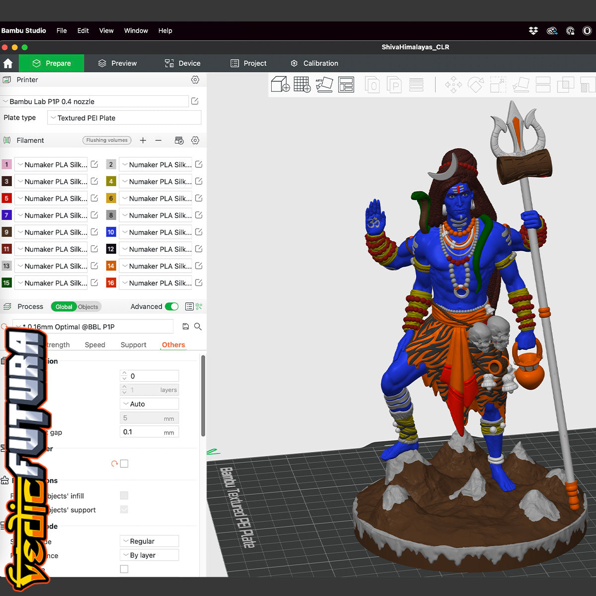 "This model presents Lord Shiva in a commanding pose, one foot resting atop the sacred Mount Kailash. He is depicted with traditional iconography: wearing a tiger skin, adorned with rudraksha beads, a crescent moon in his matted locks, and a serpent coiled around his neck. In one hand he holds a trident (trishula), while another displays the abhaya mudra of protection.