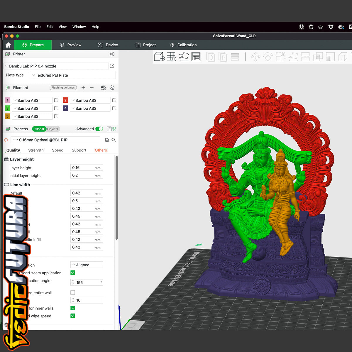 This hand-painted wooden sculpture recreation shows Lord Shiva and Goddess Parvati seated in intimate repose on an elaborately carved throne. Parvati rests gracefully on Shiva’s lap, both adorned in rich jewelry and garments. Above them, a keerthimukha—the protective demon face—crowns the arch, symbolizing divine guardianship.