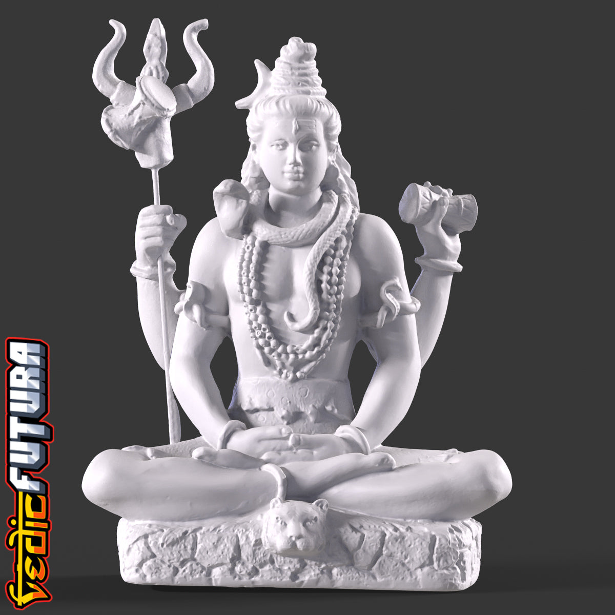 Two front arms rest gracefully on his lap, the palms facing upwards in the Dhyana Mudra, symbolizing meditation and inner peace. Two rear arms each hold distinct objects: a trident (Trishula), representing his control over cosmic forces, and a small, hourglass-shaped drum (Dumroo or Damaru), symbolizing the rhythm of creation.