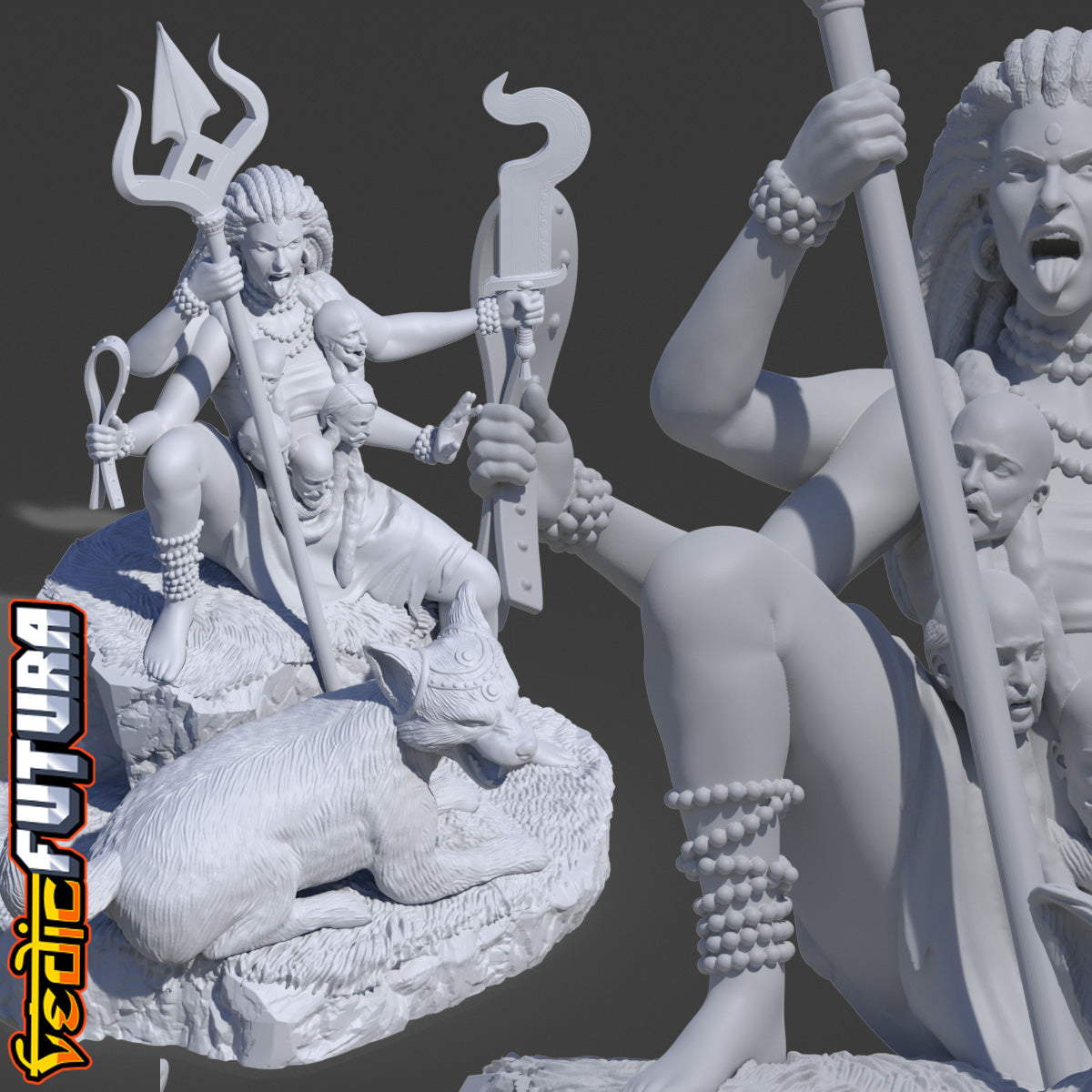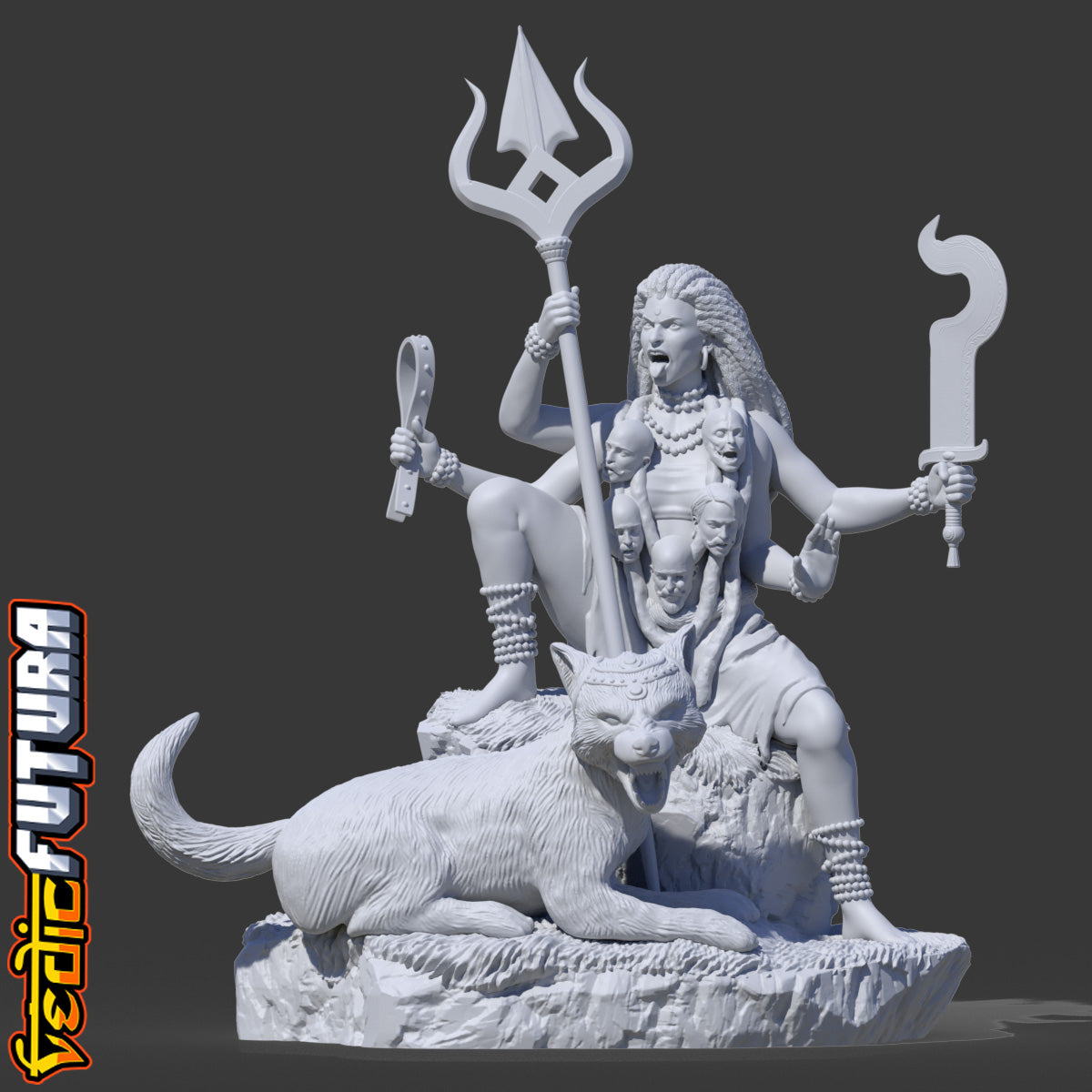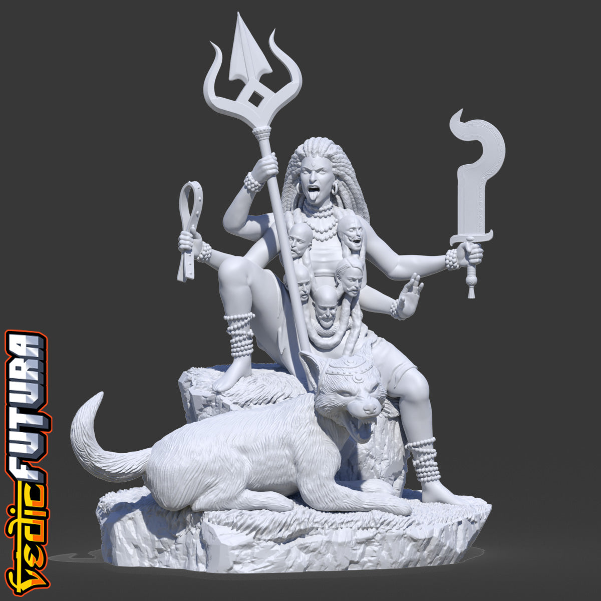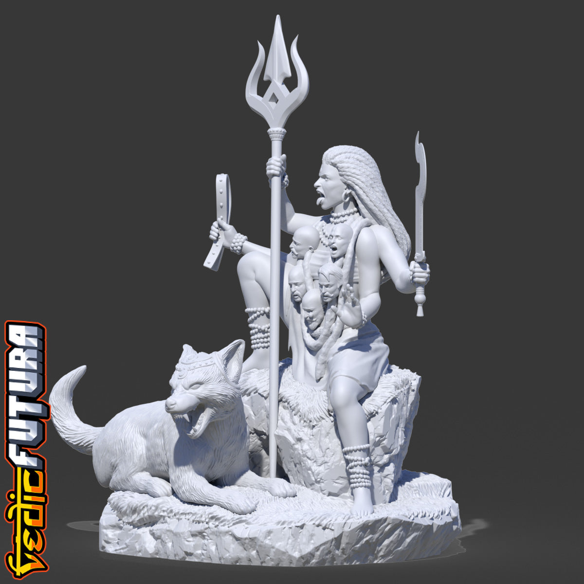Crafted with a comic book aesthetic, the sculpture portrays Shivaduti with a dark and fierce appearance. She is depicted with four arms, each bearing a symbol of her divine power: a trident, a scimitar, a severed head, and one hand in the abhaya mudra, offering protection and fearlessness to her devotees. Her matted hair and the garland of human heads around her neck underscore her warrior aspect. A jackal, her faithful vahana, crouches at her feet, enhancing her wild and formidable presence.