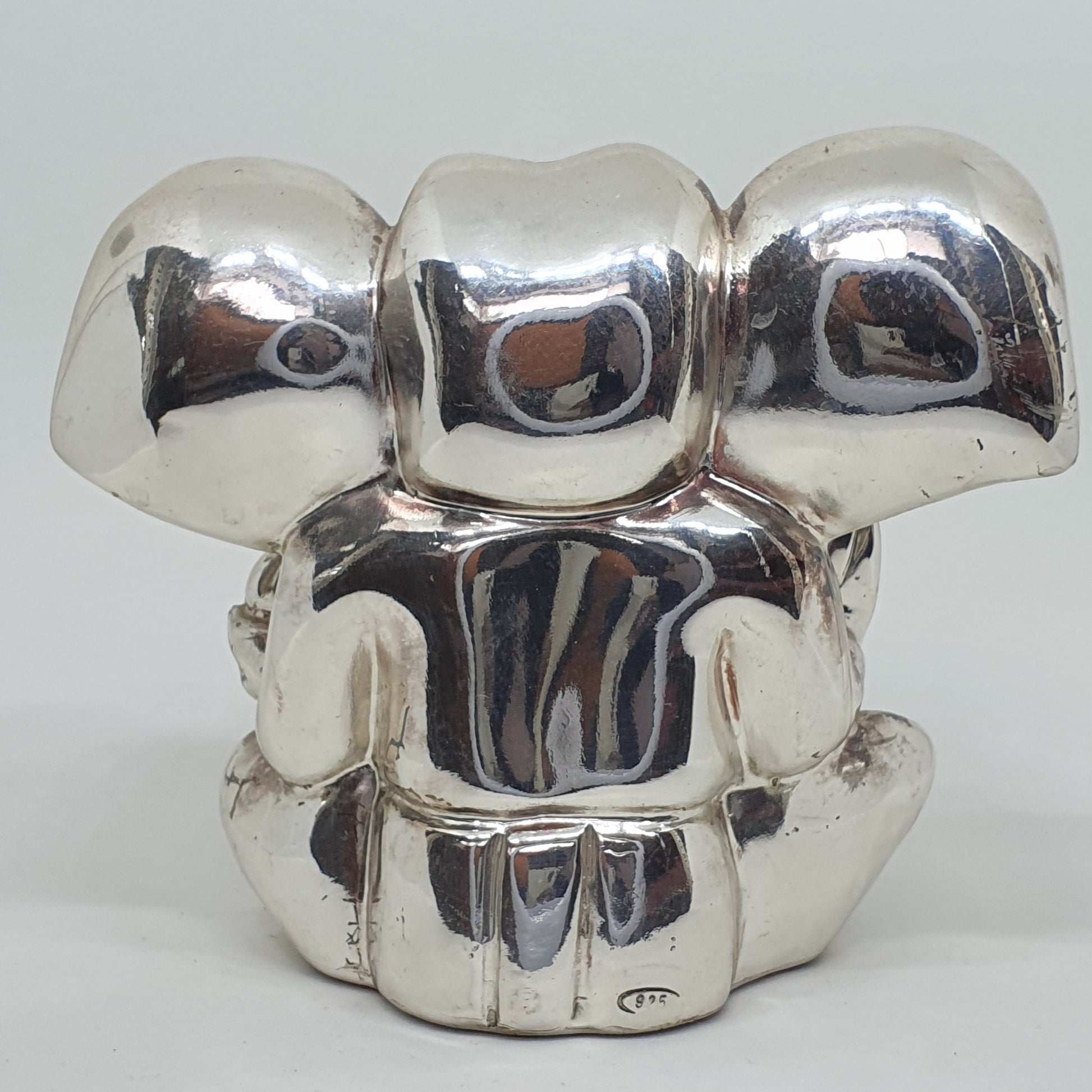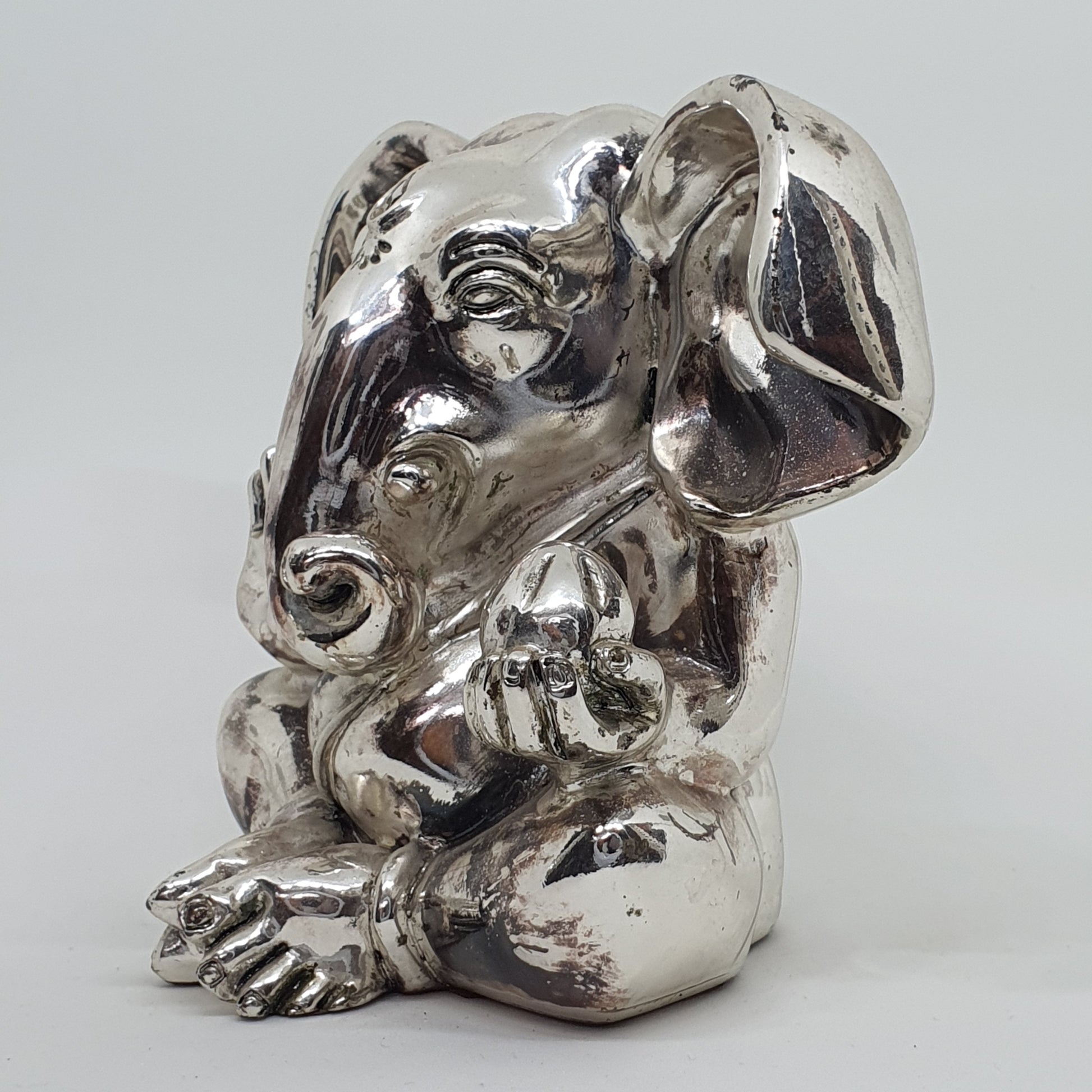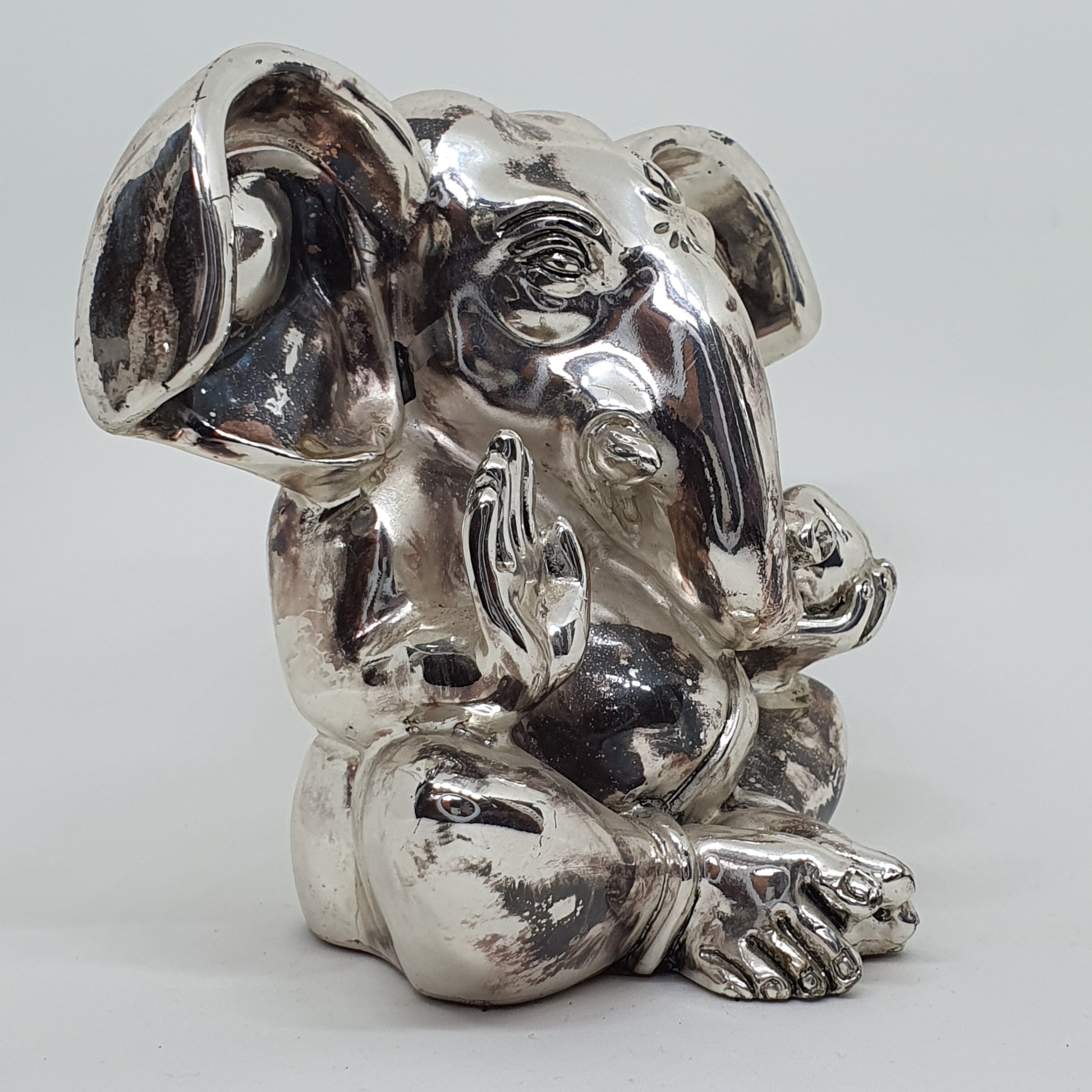 Ganesha has the head of an elephant and a big belly. This statue has two arms. He holds in his lower-right hand a delicacy, which he samples with his trunk. The motif of Ganesha turning his trunk sharply to his left to taste a sweet in his lower-left hand is a particularly archaic feature. His right hand is in the Abhaya Mudra, a gesture of reassurance, blessing and protection.
