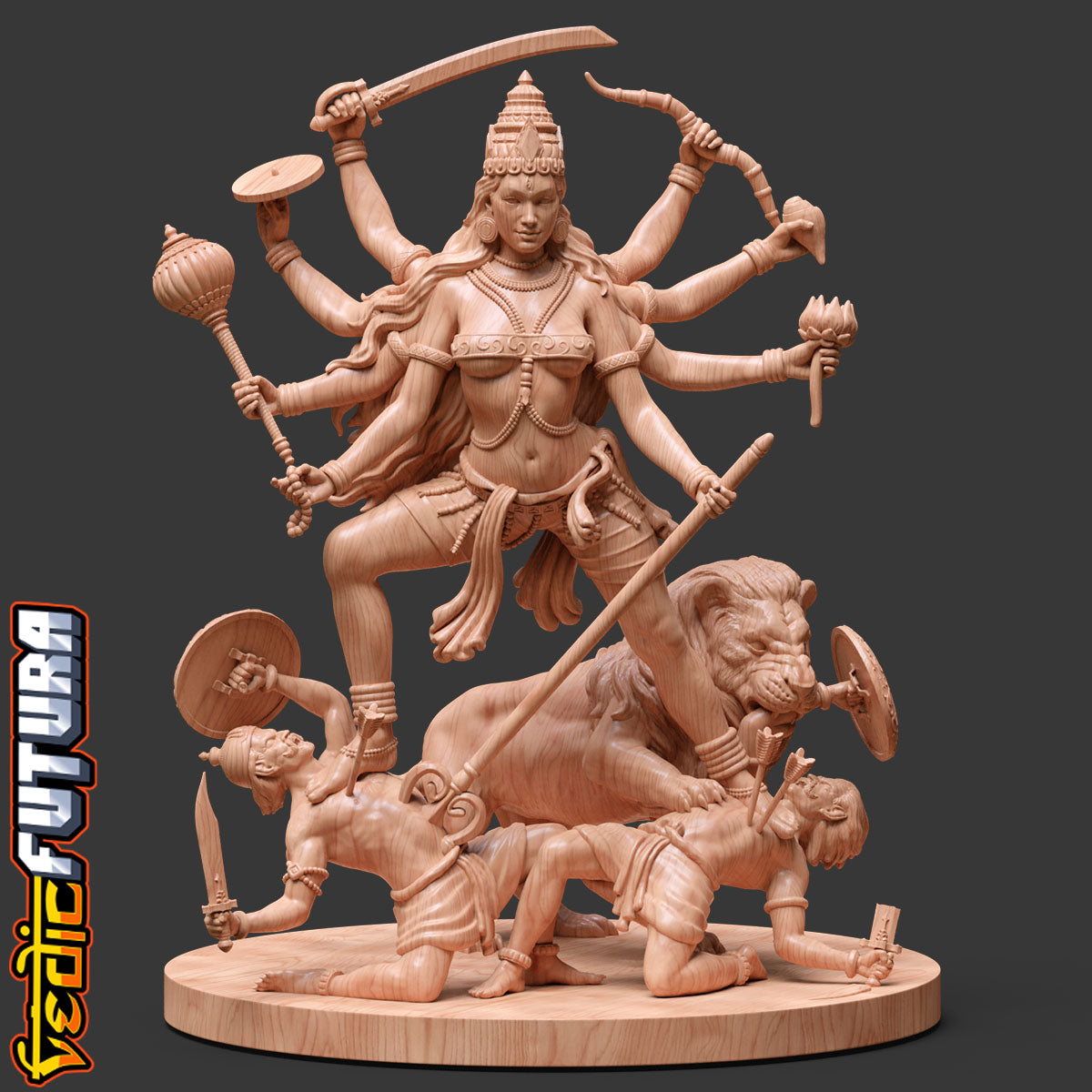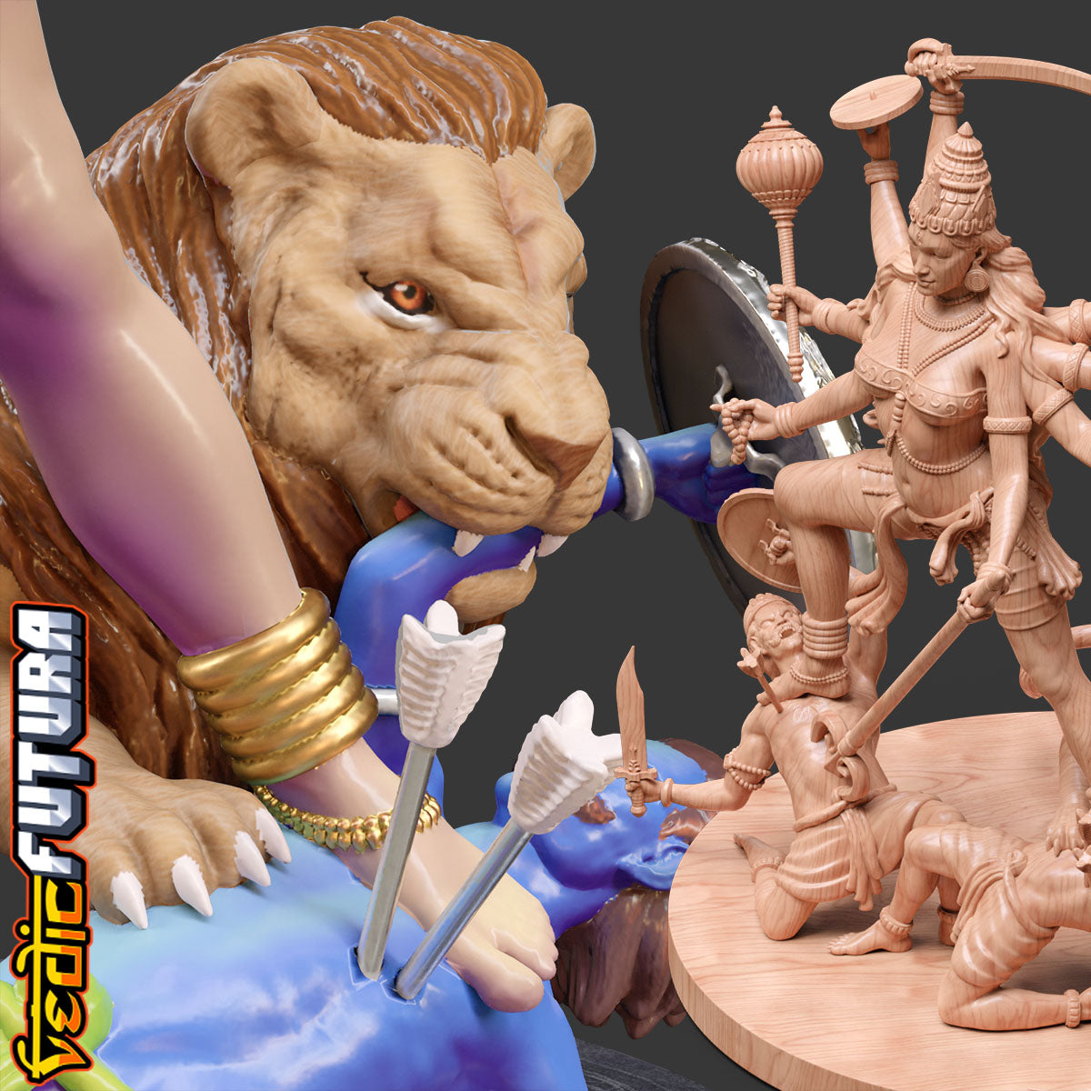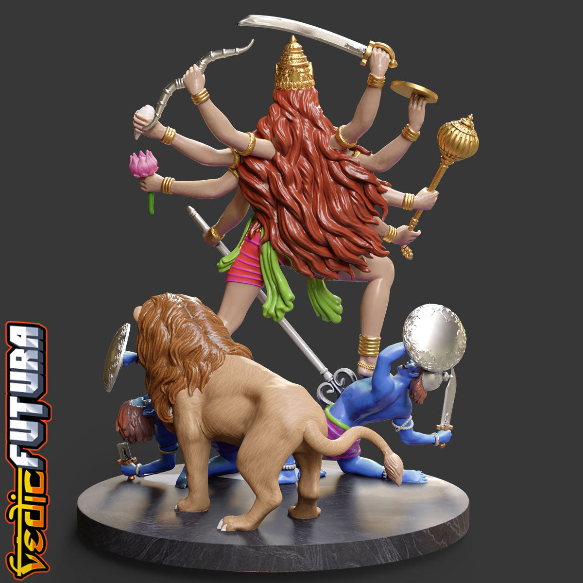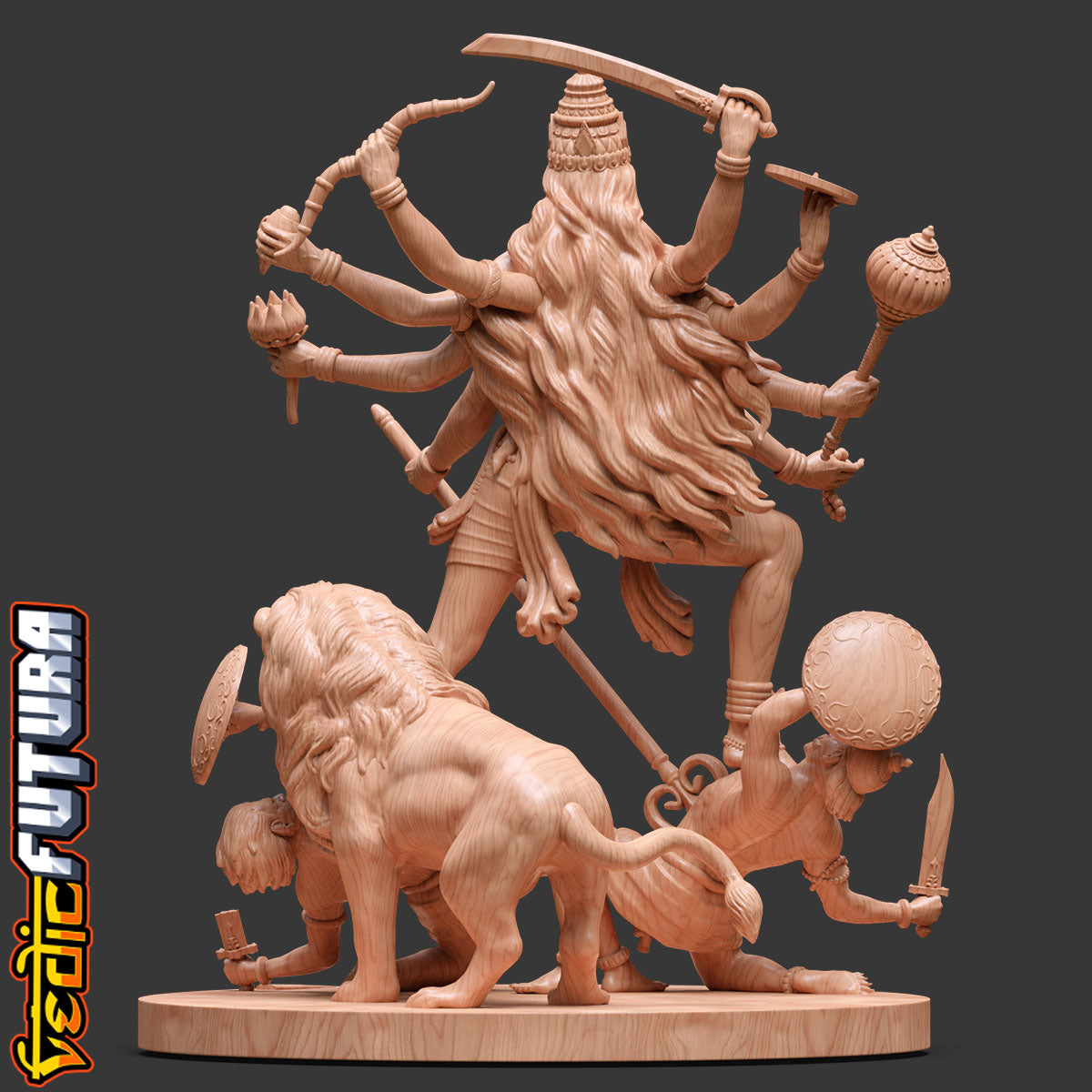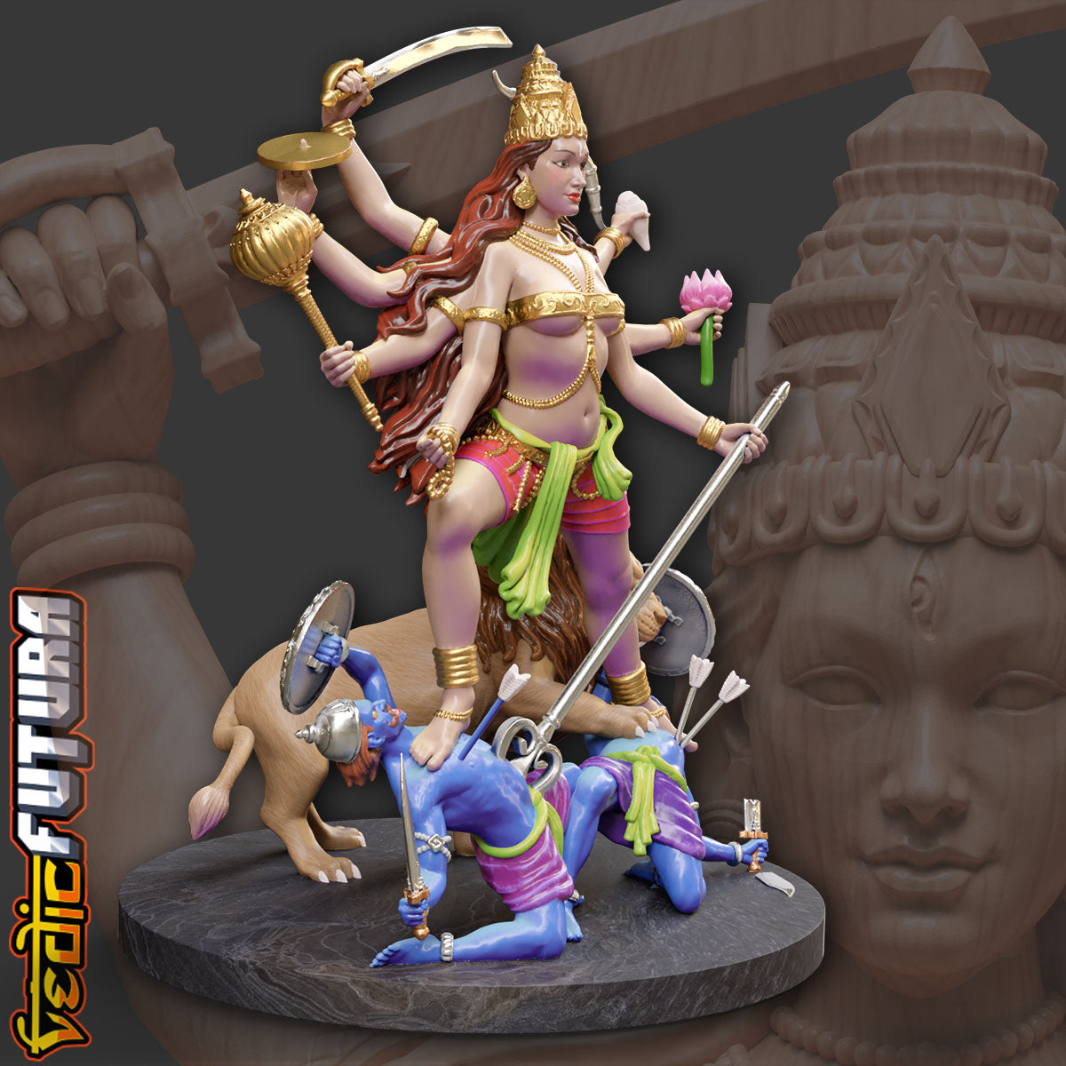 This powerful artwork captures Goddess Durga in the midst of battle, vanquishing two rakshasas (demons) with her lion mount poised behind her. Durga is depicted with multiple arms, each bearing divine weapons gifted by various gods, symbolizing the collective strength bestowed upon her to defeat the buffalo demon Mahishasura. Among these weapons are Vishnu’s discus, Shiva’s trident, and Indra’s thunderbolt, each held gracefully yet firmly, emphasizing her formidable power. Durga’s pose exudes both grace and dominance, standing balanced yet ready for combat. Her serene expression remains undisturbed amidst the chaos, embodying her divine composure and unwavering focus in the face of adversity. This scene illustrates Durga’s role as the ultimate protector, embodying strength, grace, and divine resolve.