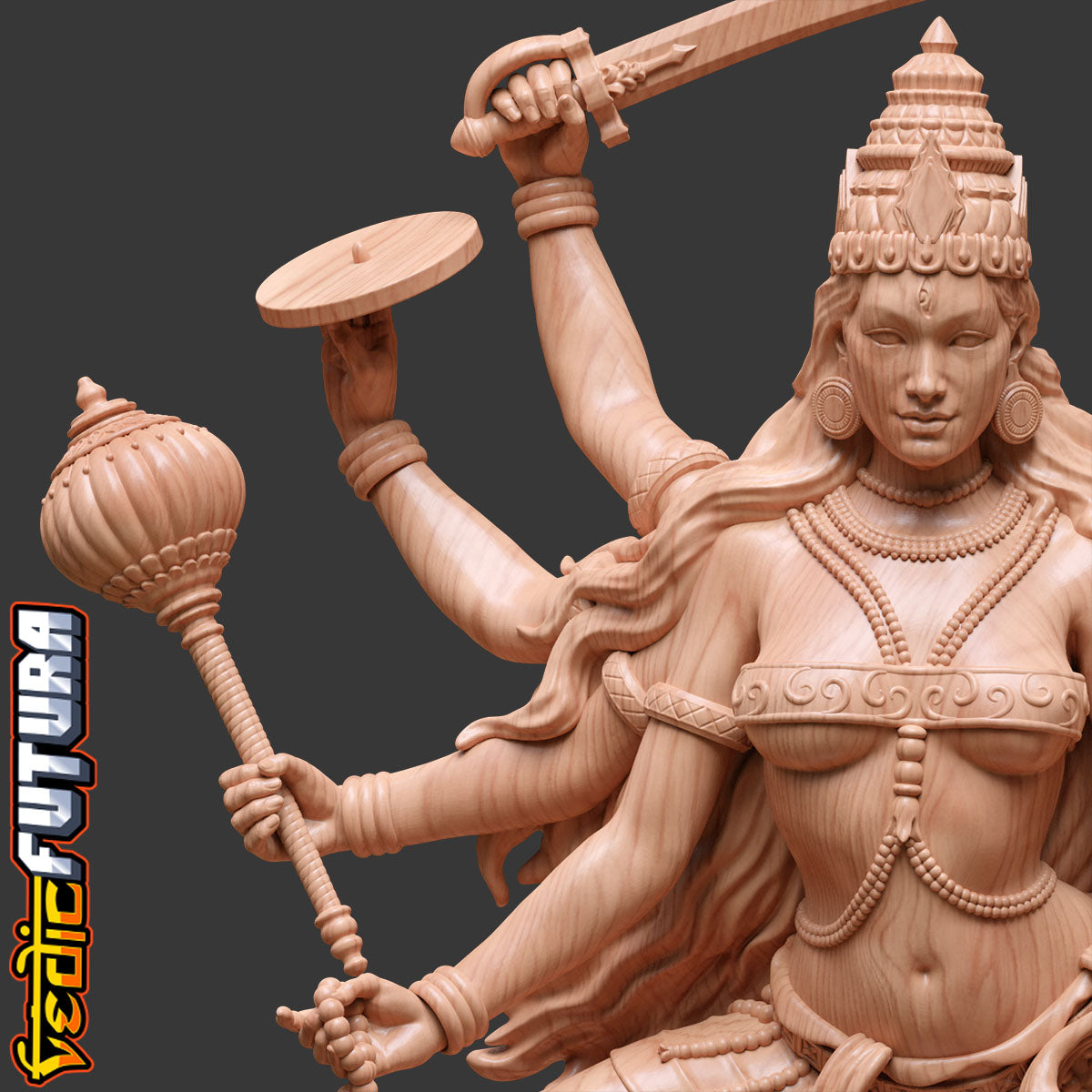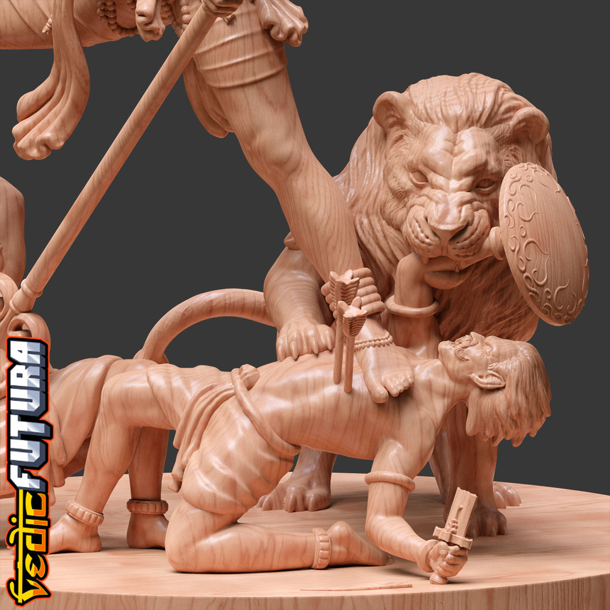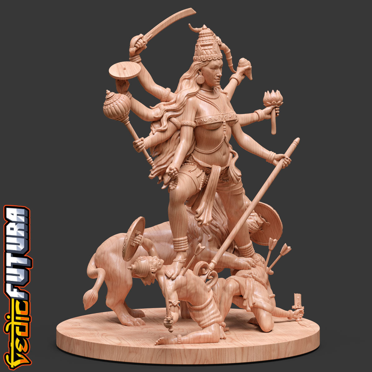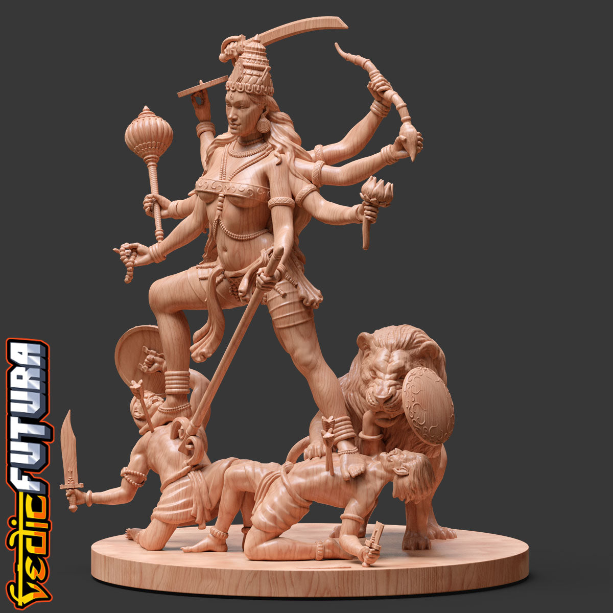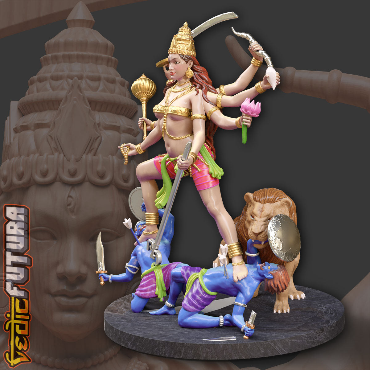 This powerful artwork captures Goddess Durga in the midst of battle, vanquishing two rakshasas (demons) with her lion mount poised behind her. Durga is depicted with multiple arms, each bearing divine weapons gifted by various gods, symbolizing the collective strength bestowed upon her to defeat the buffalo demon Mahishasura. Among these weapons are Vishnu’s discus, Shiva’s trident, and Indra’s thunderbolt, each held gracefully yet firmly, emphasizing her formidable power. Durga’s pose exudes both grace and dominance, standing balanced yet ready for combat. Her serene expression remains undisturbed amidst the chaos, embodying her divine composure and unwavering focus in the face of adversity. This scene illustrates Durga’s role as the ultimate protector, embodying strength, grace, and divine resolve.