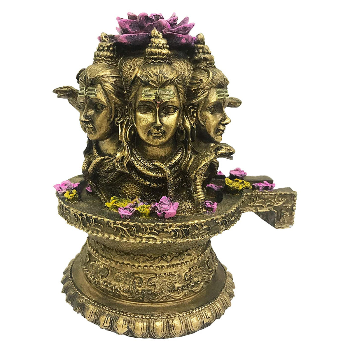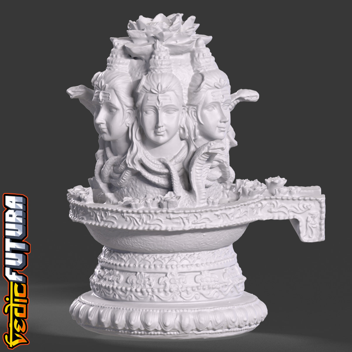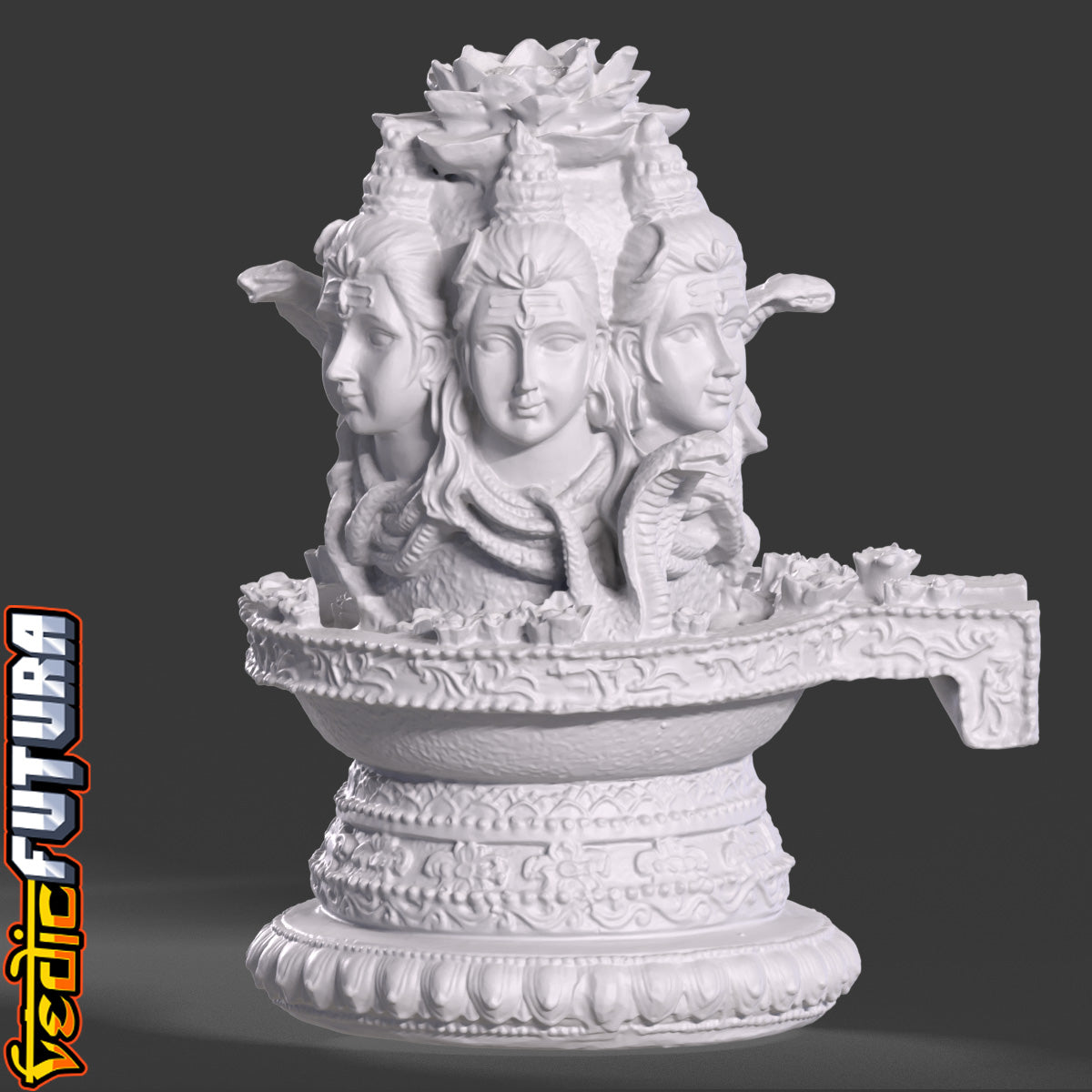 The three faces of Shiva displayed on the sculpture are indicative of his omnipresence and multifaceted persona. Each face likely represents different aspects of his divine attributes: creation, preservation, and destruction, encapsulating his cyclical and all-encompassing nature. The central face is serene and meditative, typical of Shiva’s commonly depicted state, suggesting his role as the ascetic yogi. The other faces might express his wrathful and benevolent forms, illustrating his versatile powers and emotional depth.