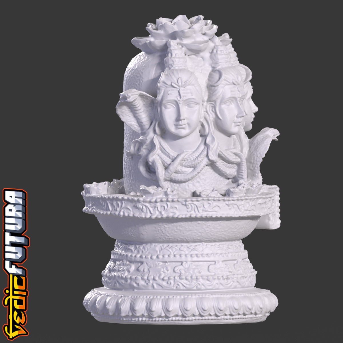 Artistically, the sculpture is crafted with intricate detailing and a textured finish that highlights the divine craftsmanship. The faces are adorned with traditional ornaments, such as headgear and earrings, enhancing their regal and sacred appearance. The base of the Lingam is ornately decorated with a series of reliefs and designs.