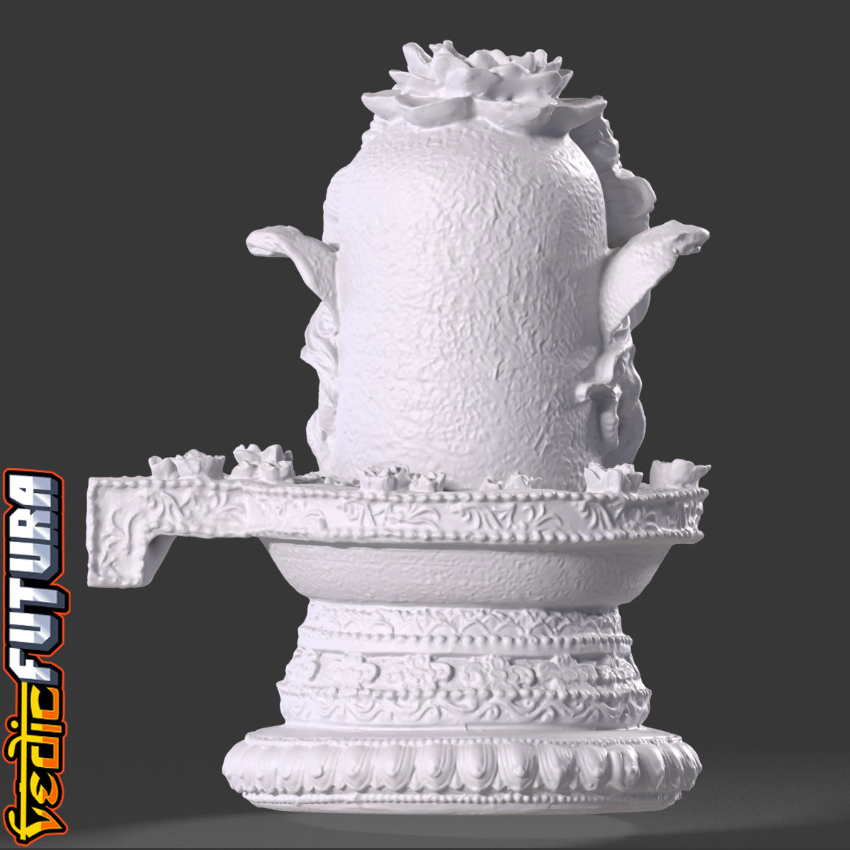 This compelling sculpture of the Shiv Ling presents a deeply symbolic representation of Lord Shiva, blending traditional Linga worship with the anthropomorphic depiction of the deity. The Shiv Ling, or Lingam, is a quintessential emblem of Shiva, traditionally understood as a symbol of divine generative energy, embodying the essence of Shiva as the progenitor of the Universe. The integration of Shiva's three faces into the upper part of the Lingam in this sculpture adds layers of meaning and iconography, reflecting his complex nature and roles within Hindu theology.