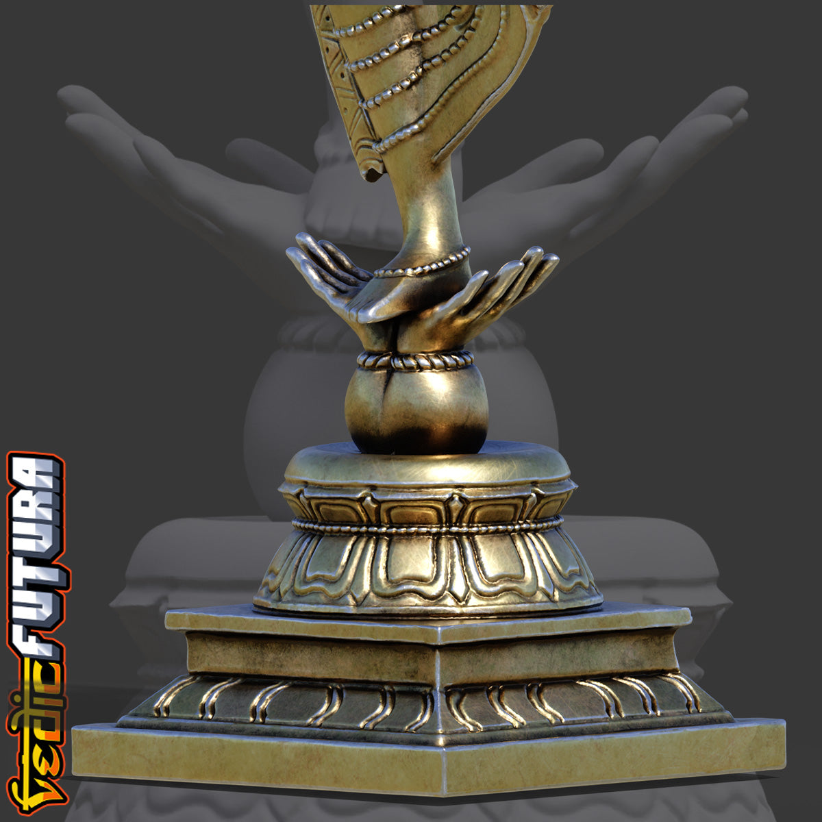 This exquisite bronze sculpture recreation captures Vamana, the fifth avatar of Vishnu, in a rare and dynamic pose—dancing atop the outstretched hands of King Mahabali, with one leg raised high, the dhoti’s folds elegantly sweeping upward. This is the climactic moment in the Vamana legend, when the humbled Mahabali offers his head for the final step. Instead, Vamana, embodying divine grace, chooses to step on his hands, honoring the king’s repentance.