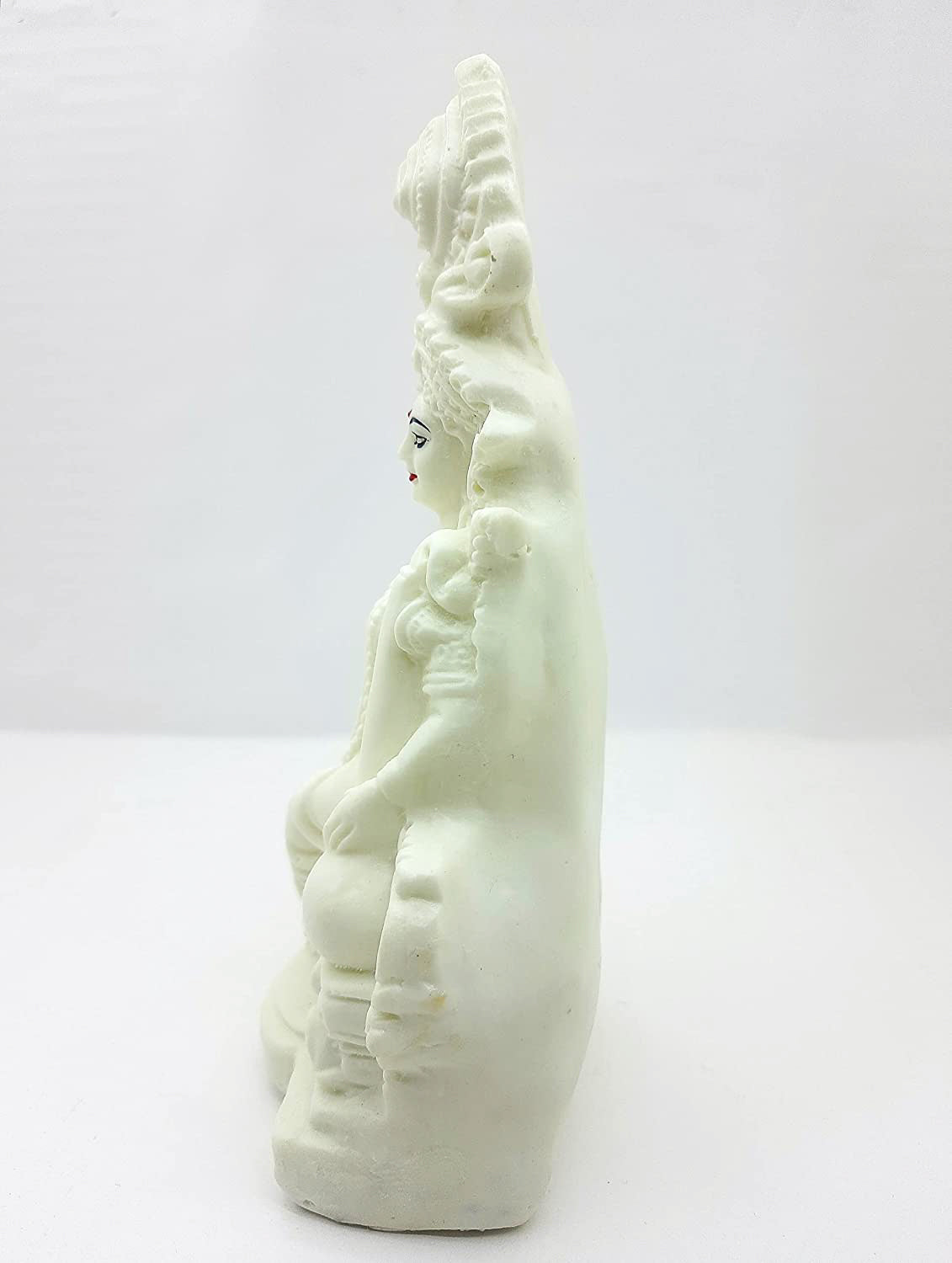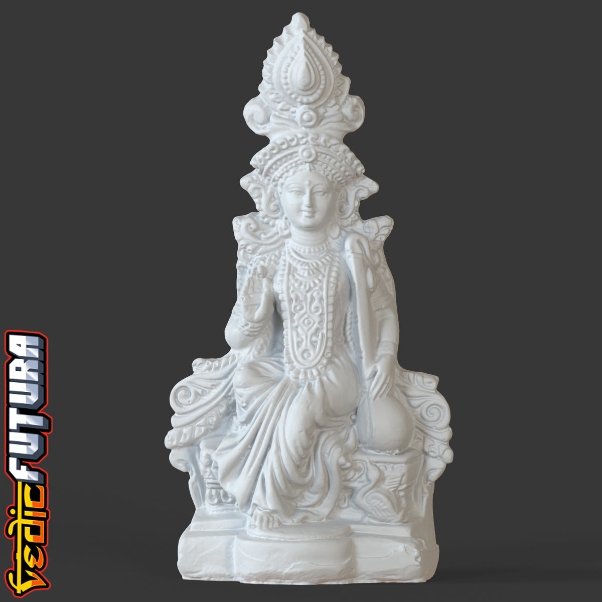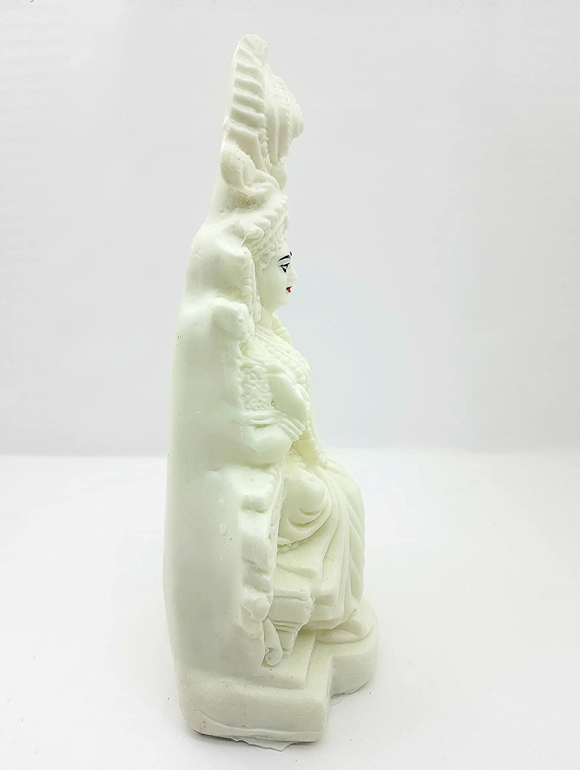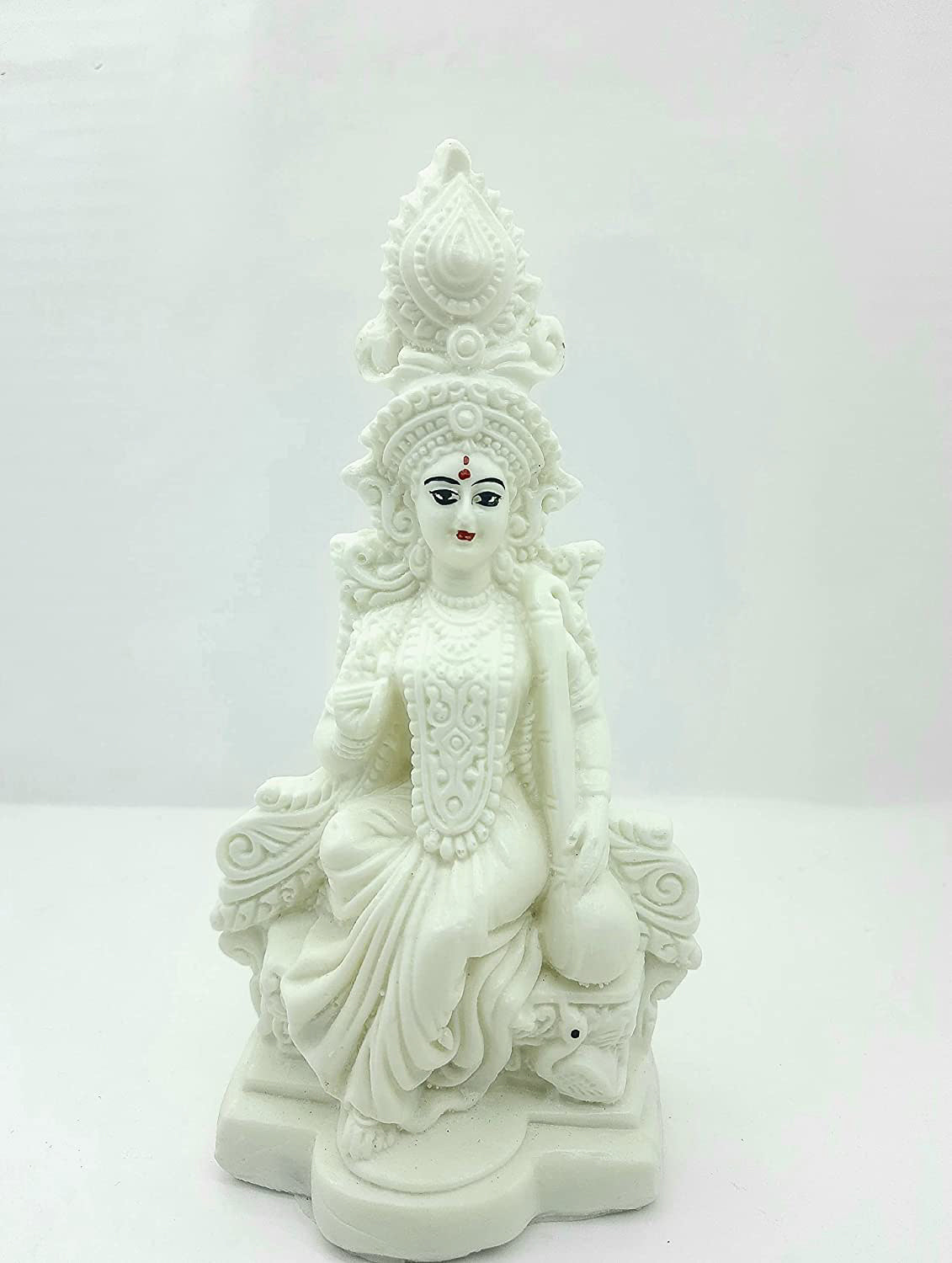 In Bengali iconography, Goddess Saraswati is often depicted as seated on a throne, wearing a tall and beautiful crown, and holding an upright veena, the traditional stringed musical instrument associated with her. She is typically depicted as serene, peaceful, and knowledgeable, embodying the Hindu ideals of music, arts, and learning. The swan is often depicted as her mount or companion, and is said to symbolize her ability to separate the pure from the impure, much like a swan can separate milk from water. Saraswati sitting on a throne, with her crown and veena, and surrounded by her swan, conveys a sense of royalty, grace, and wisdom, and is considered a powerful symbol of knowledge and learning in Hindu culture.