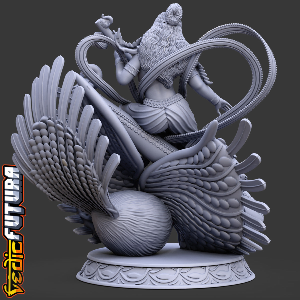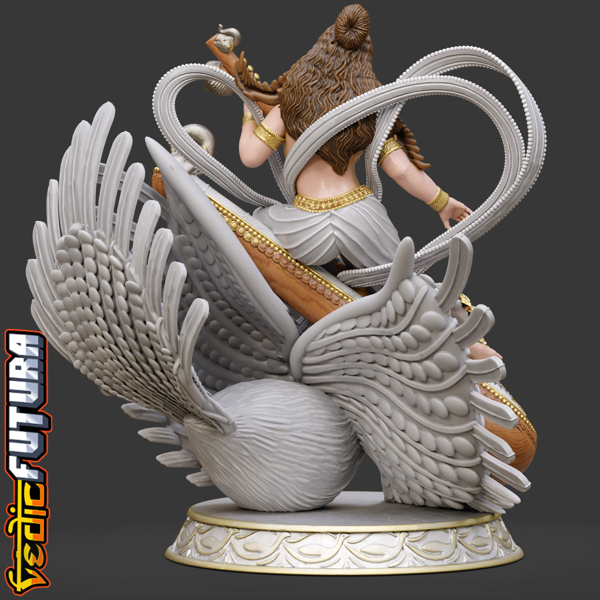 "This imaginative contemporary sculpture of Goddess Saraswati reinterprets classical iconography with dynamic elegance. Here, the goddess—traditionally associated with wisdom, learning, and the arts—is shown seated atop a giant veena, which itself becomes both her mount and her throne. The veena is gracefully supported by a majestic swan, her vahana (vehicle), whose upward gaze conveys reverence and devotion.