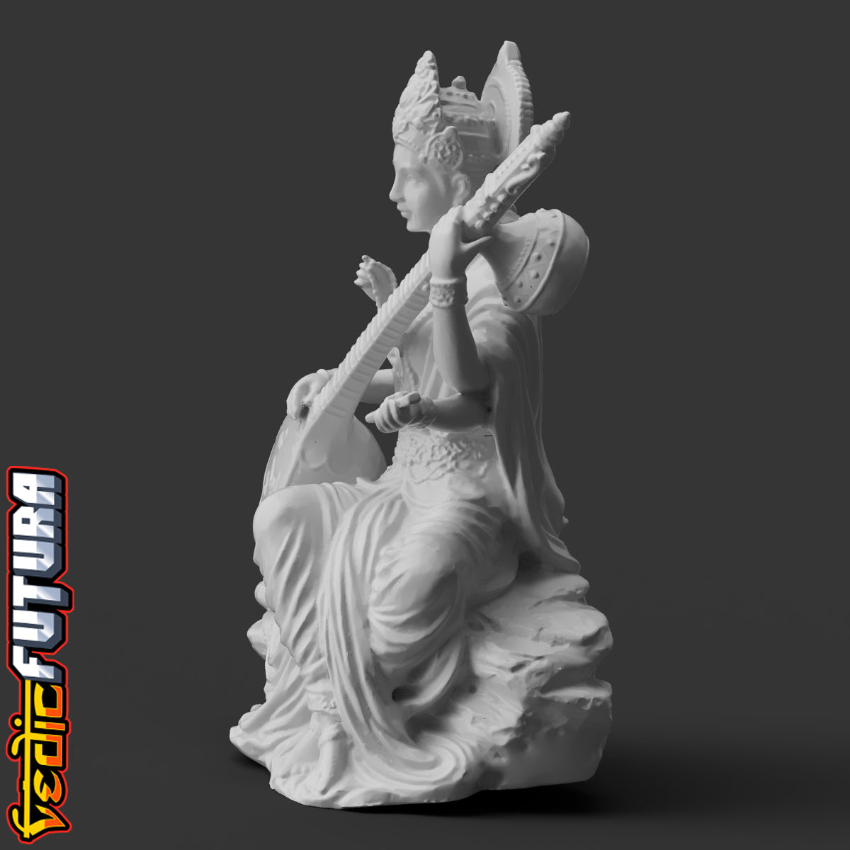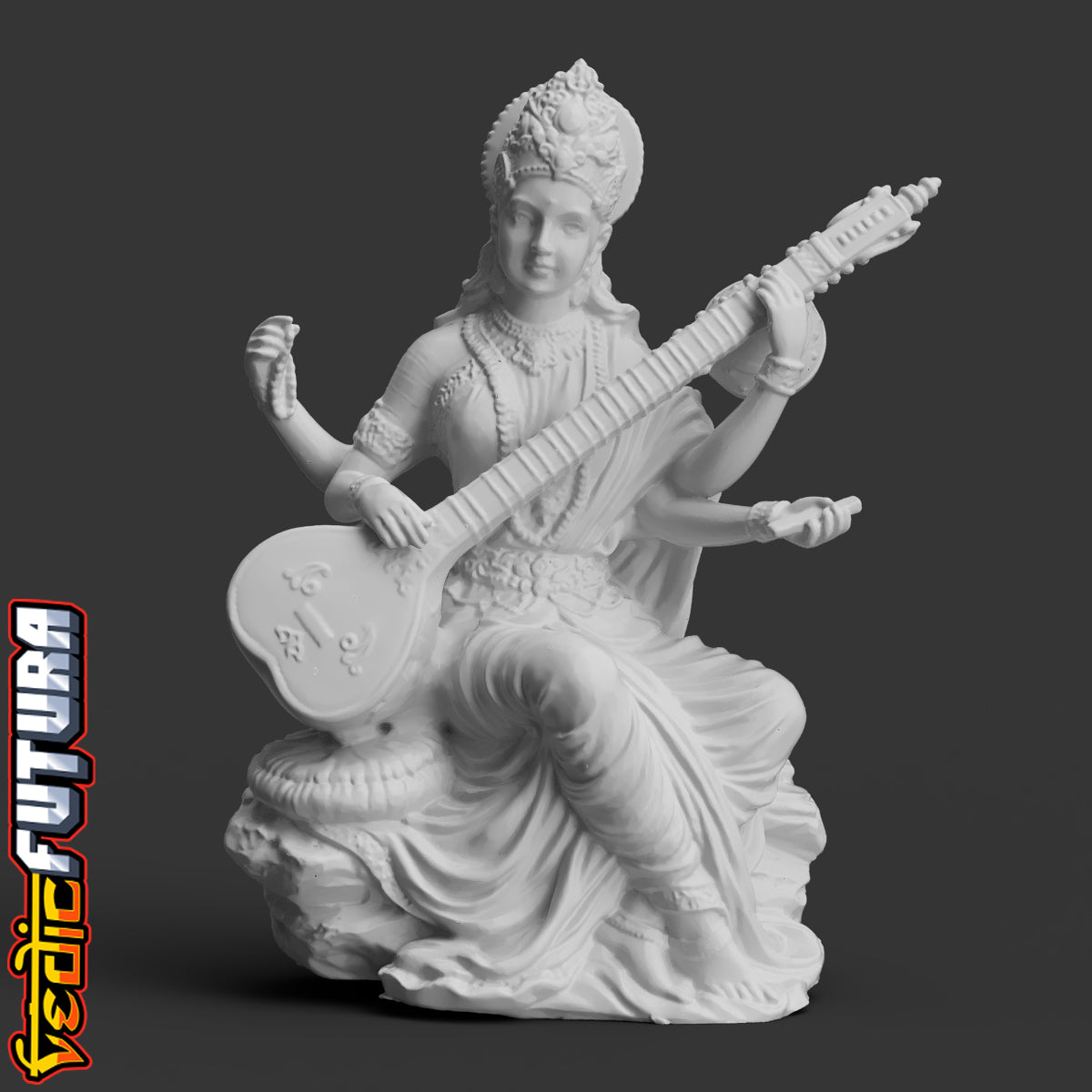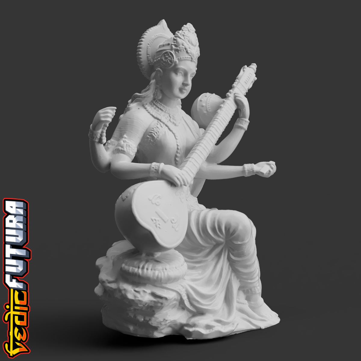 Saraswati, also known as Veenavadini (Goddess who plays Veena, the musical instrument) is the Hindu goddess of knowledge, music, art, speech, wisdom, and learning. She is a part of the tridevi of Saraswati, Lakshmi, and Parvati. She is generally shown to have four arms, holding a book, a rosary, a water pot and a musical instrument called Veena. Each of these items have symbolic meaning in Hinduism. She is usually depicted near a flowing river or another body of water, which depiction may constitute a reference to her early history as a river goddess.