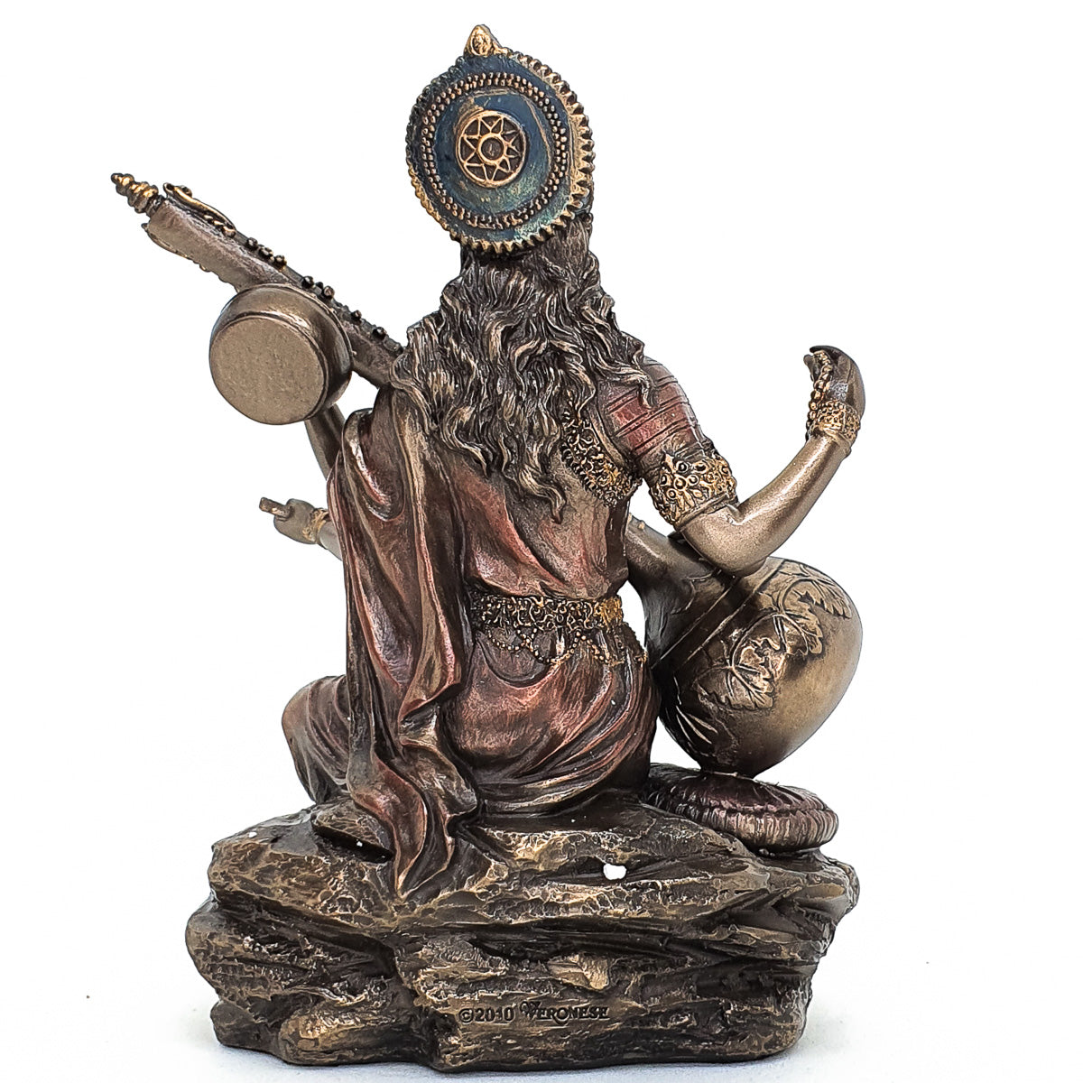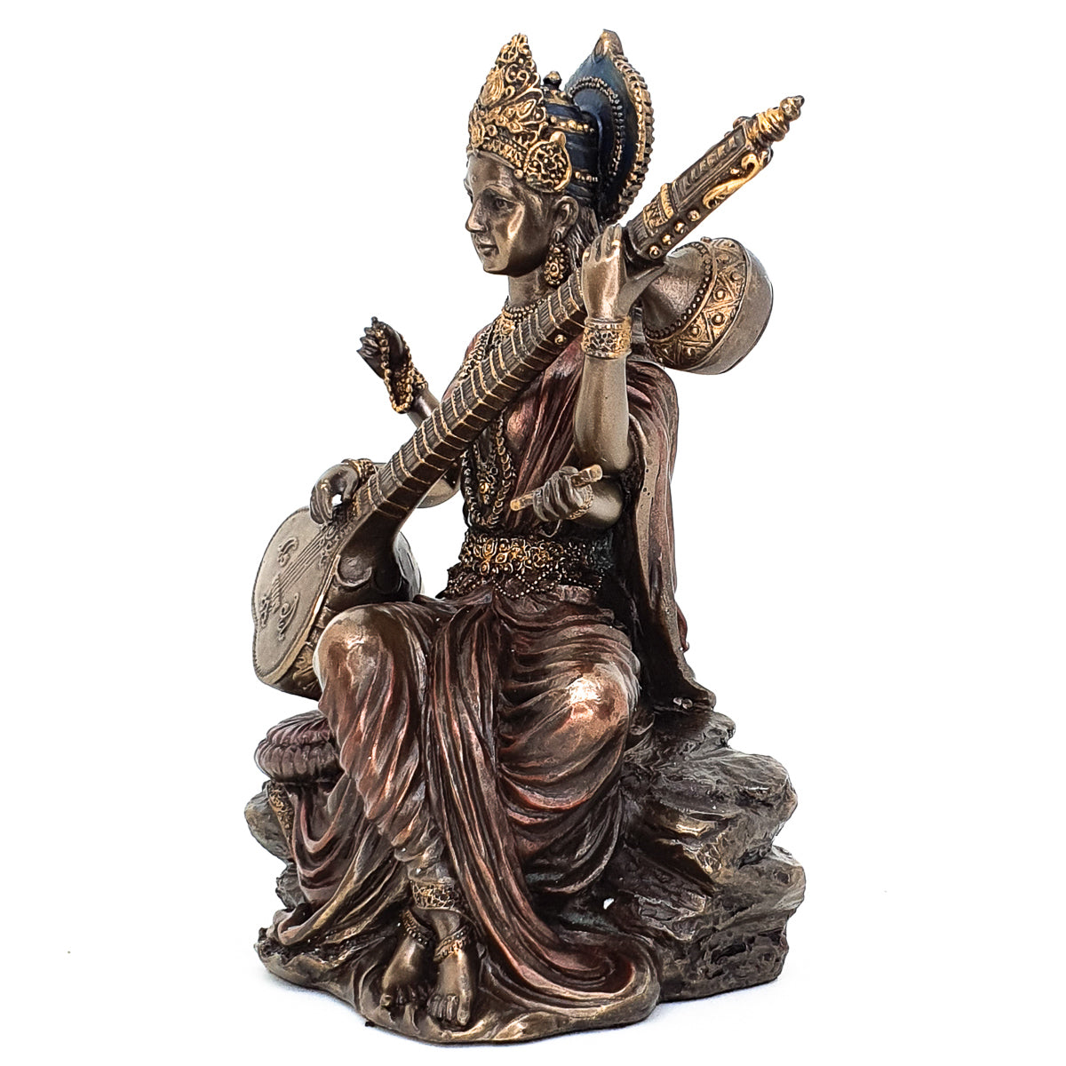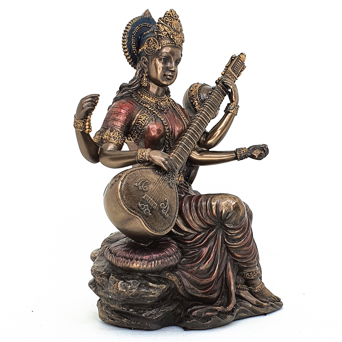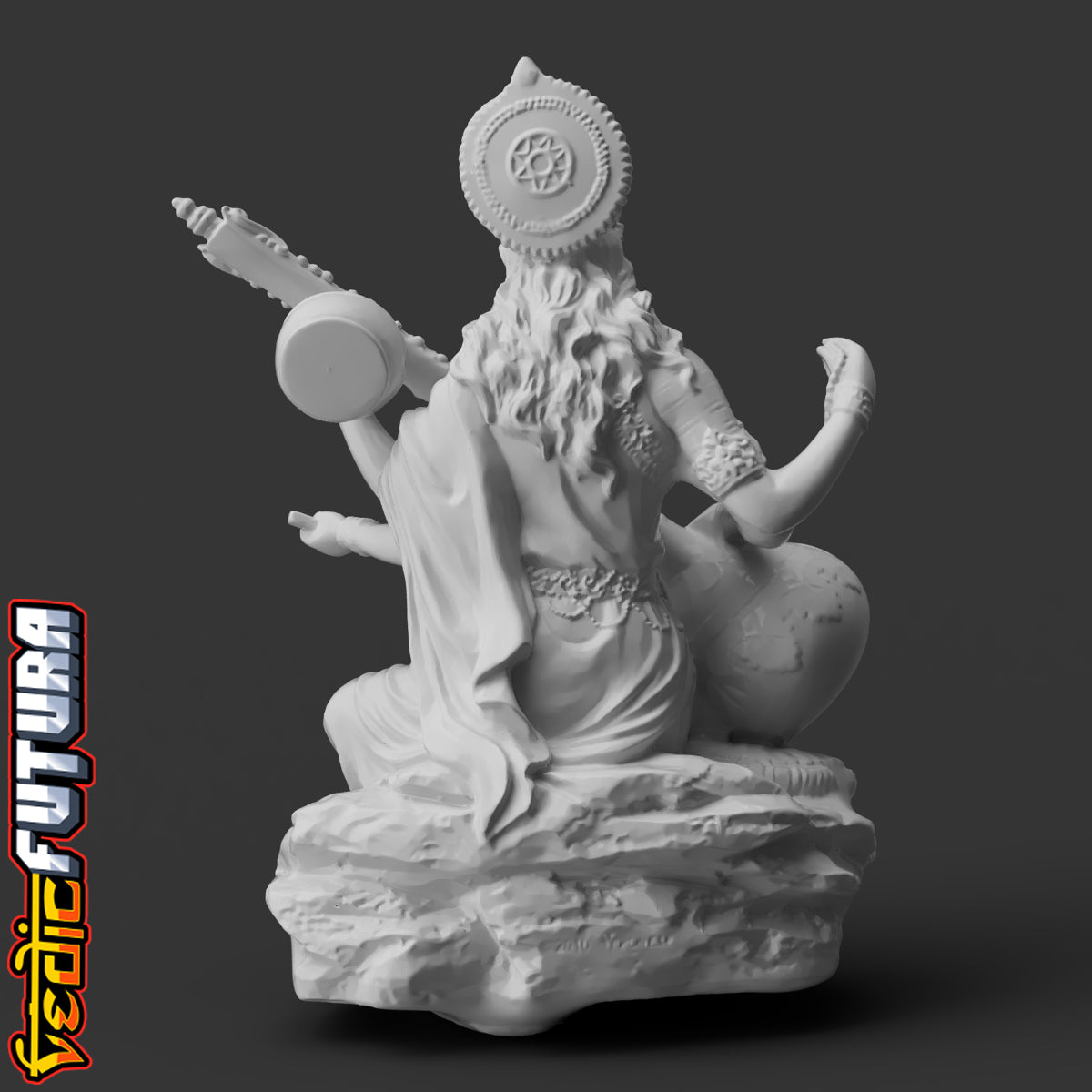 Saraswati, also known as Veenavadini (Goddess who plays Veena, the musical instrument) is the Hindu goddess of knowledge, music, art, speech, wisdom, and learning. She is a part of the tridevi of Saraswati, Lakshmi, and Parvati. She is generally shown to have four arms, holding a book, a rosary, a water pot and a musical instrument called Veena. Each of these items have symbolic meaning in Hinduism. She is usually depicted near a flowing river or another body of water, which depiction may constitute a reference to her early history as a river goddess.