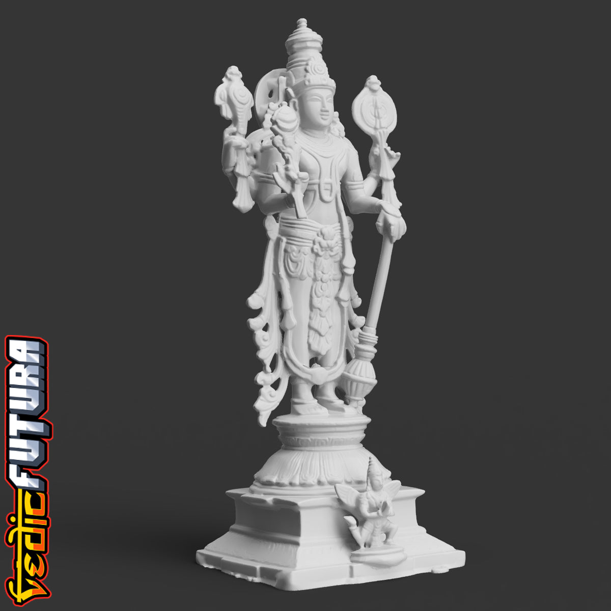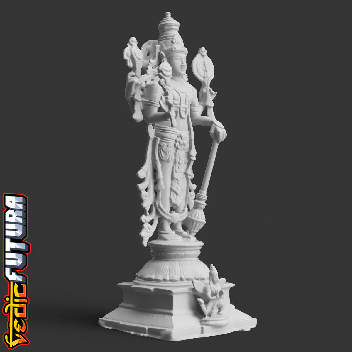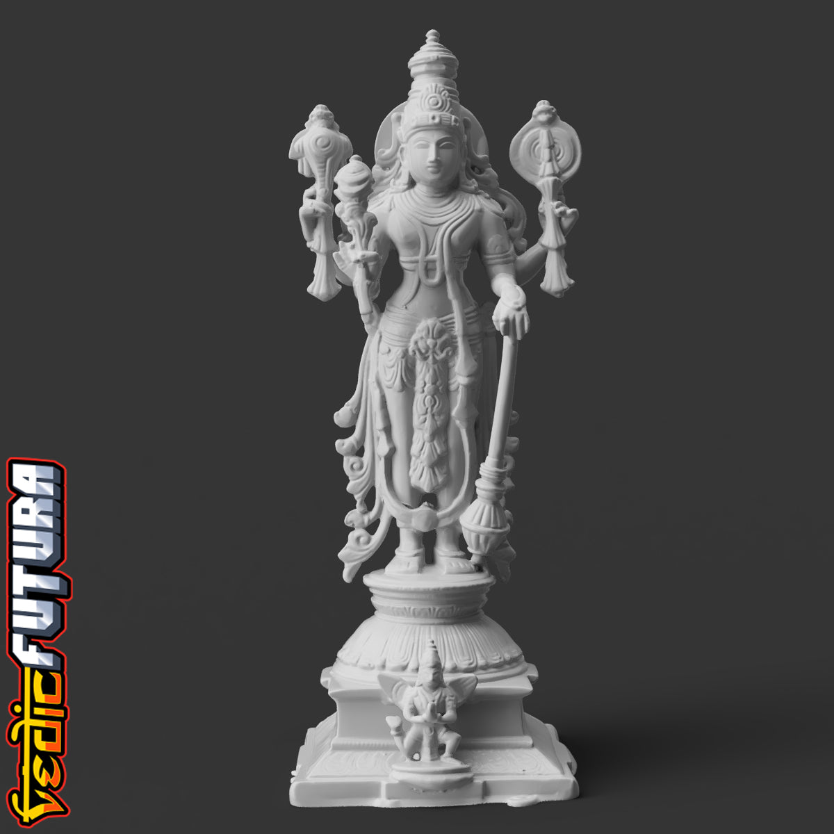 Vishnu is the one of the three principal deities of Hinduism - Brahma the Creator, Vishnu the Preserver and Shiva the destroyer. Vishnu is the god of Preservation, the great maintainer who often appears in various incarnations (avatar) to provide salvation for humanity. His appearances are innumerable; he is often said to have ten avatars—but not always the same ten. Vishnu’s vahana, his vehicle in the world, is the eagle Garuda;Seen here sitting at his feet ready to carry his master through the heavens.