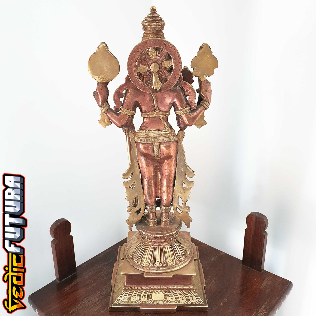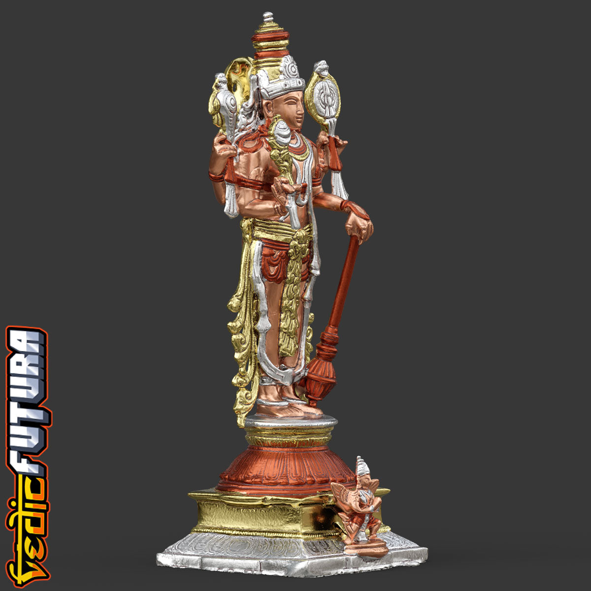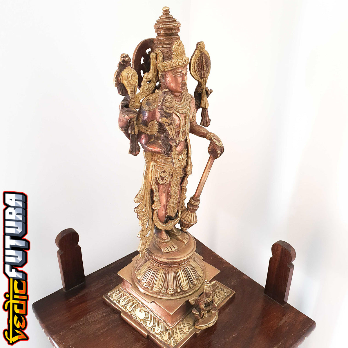 Vishnu is the one of the three principal deities of Hinduism - Brahma the Creator, Vishnu the Preserver and Shiva the destroyer. Vishnu is the god of Preservation, the great maintainer who often appears in various incarnations (avatar) to provide salvation for humanity. His appearances are innumerable; he is often said to have ten avatars—but not always the same ten. Vishnu’s vahana, his vehicle in the world, is the eagle Garuda;Seen here sitting at his feet ready to carry his master through the heavens.