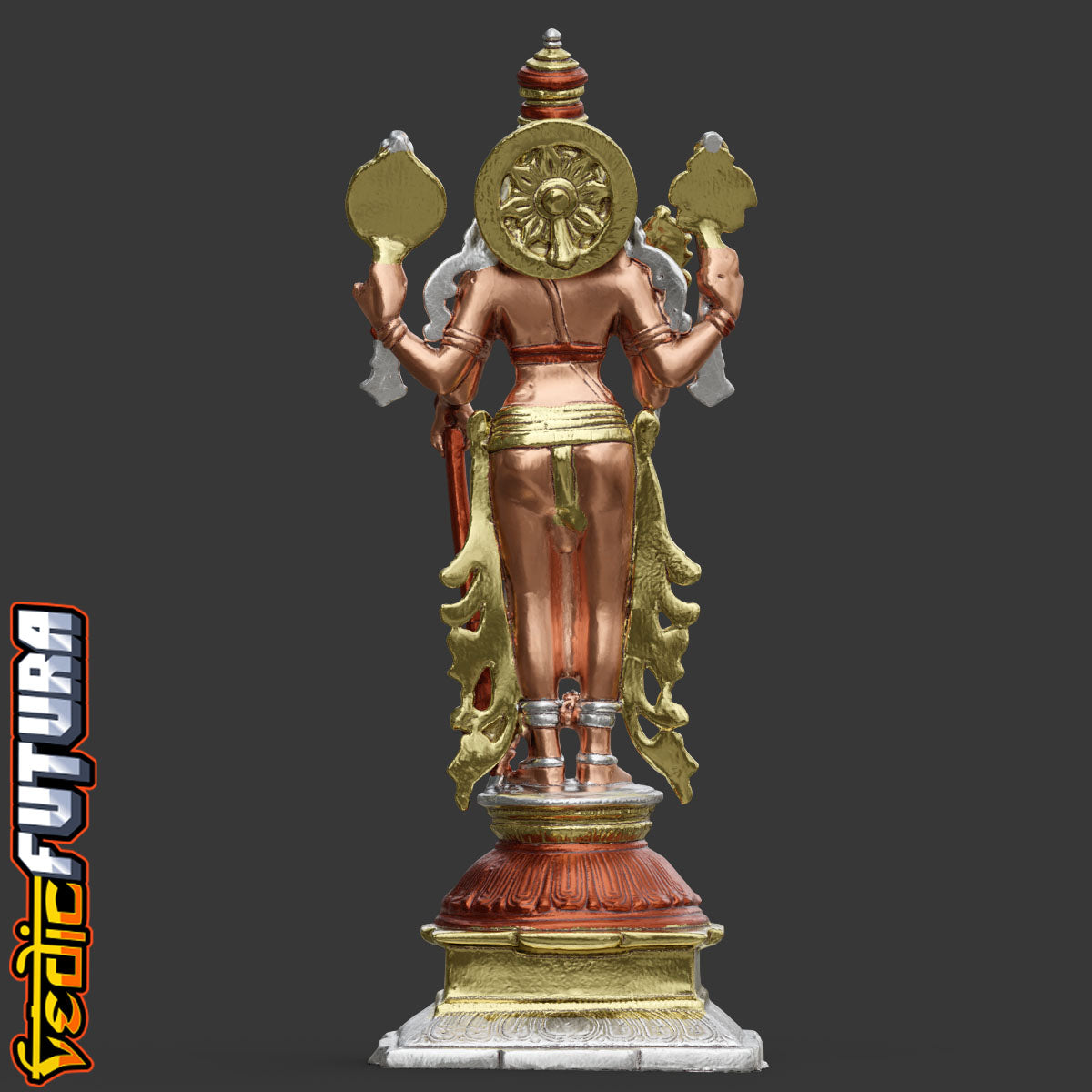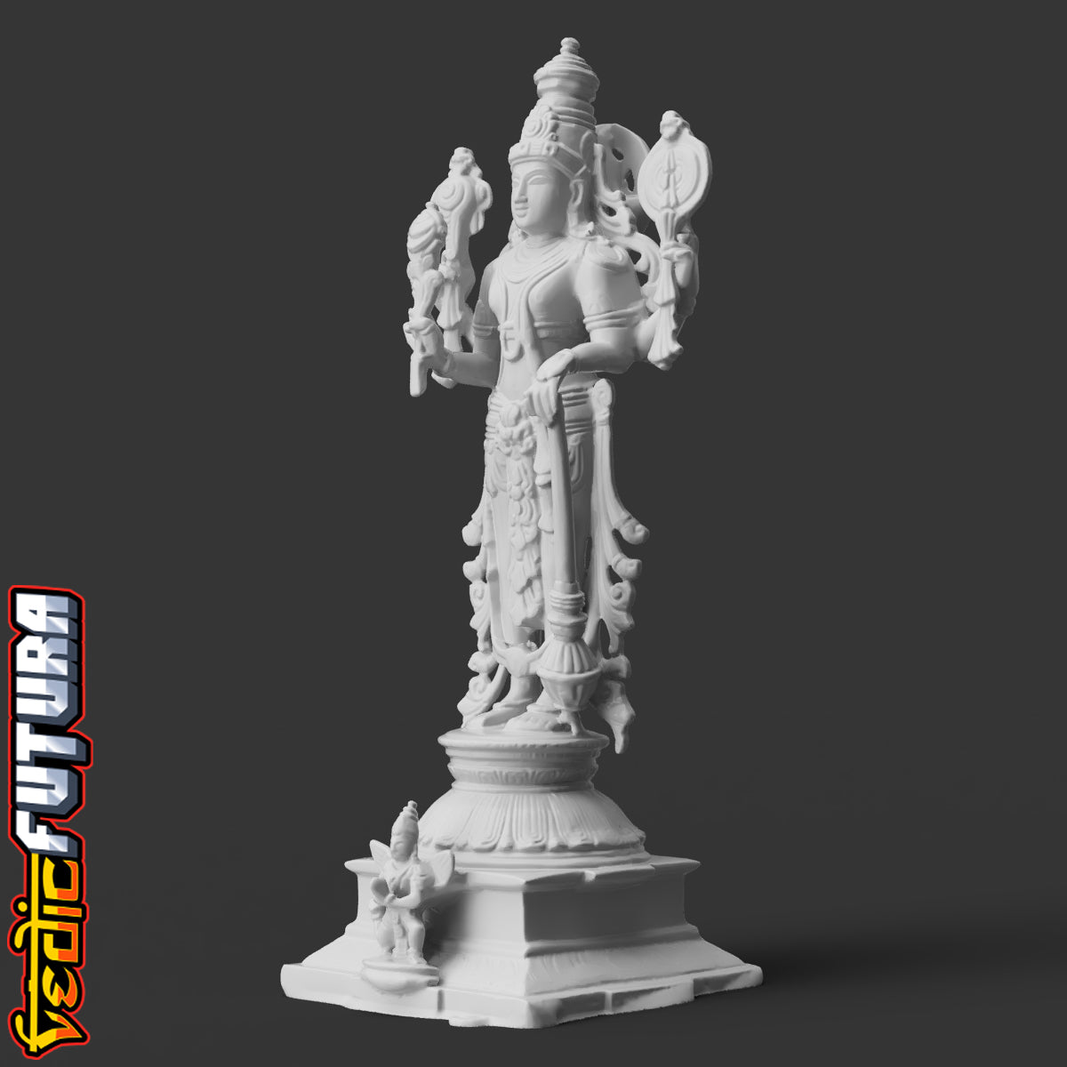 As a kingly figure, Vishnu is adorned with an elaborate crown and jewellery, including a necklace, earrings, armbands and a girdle.