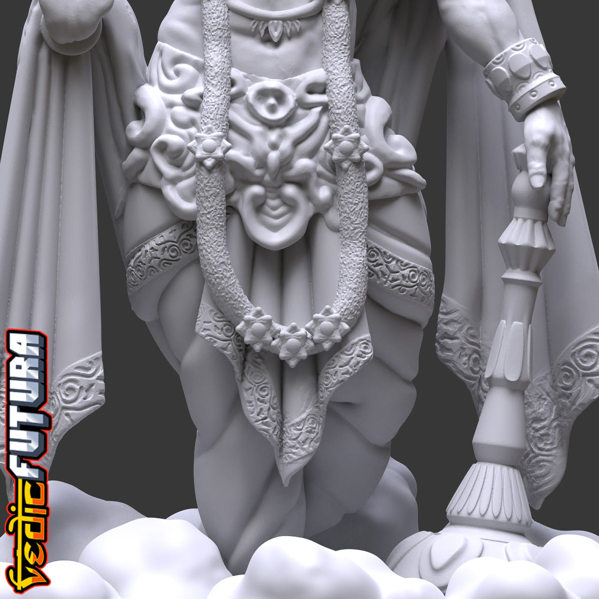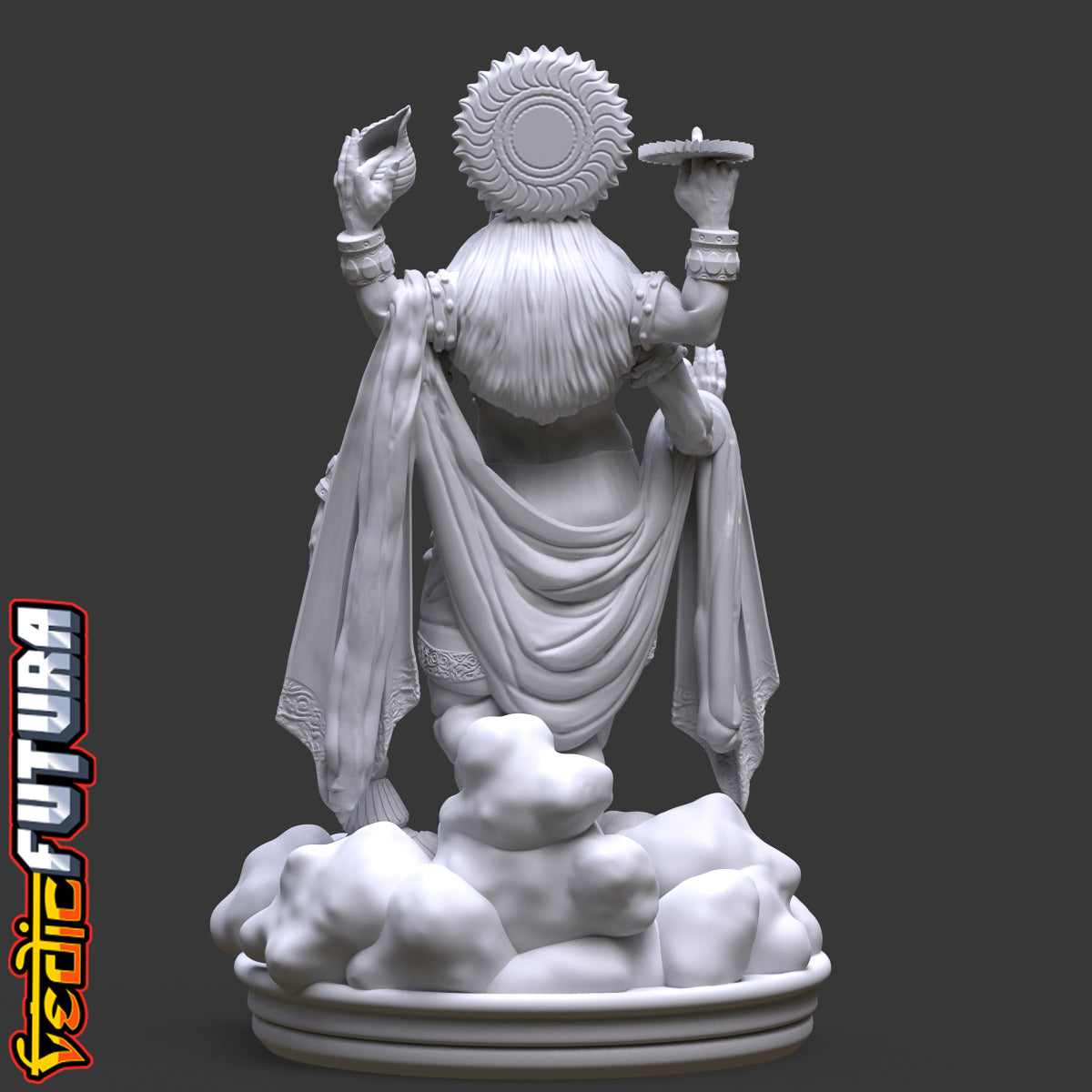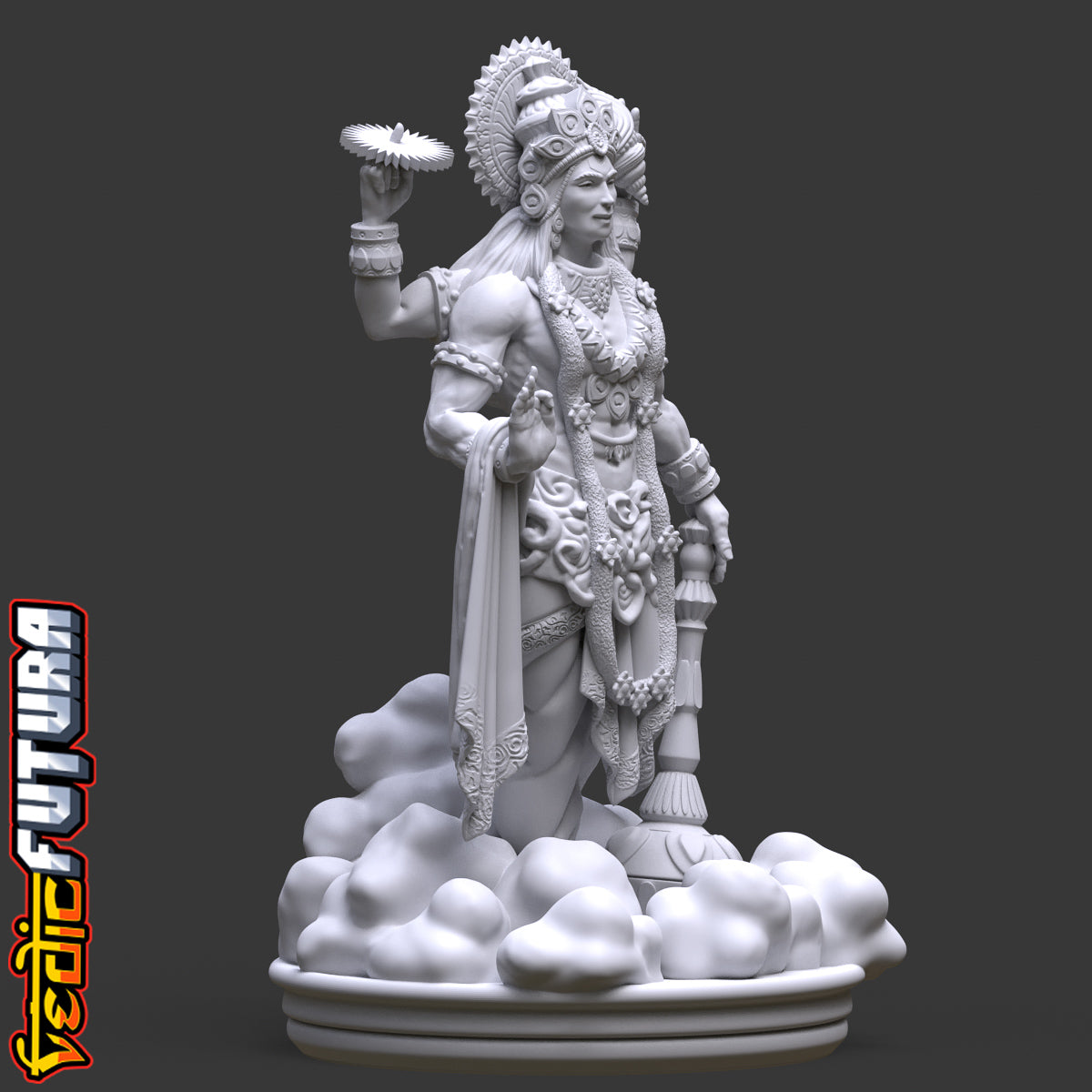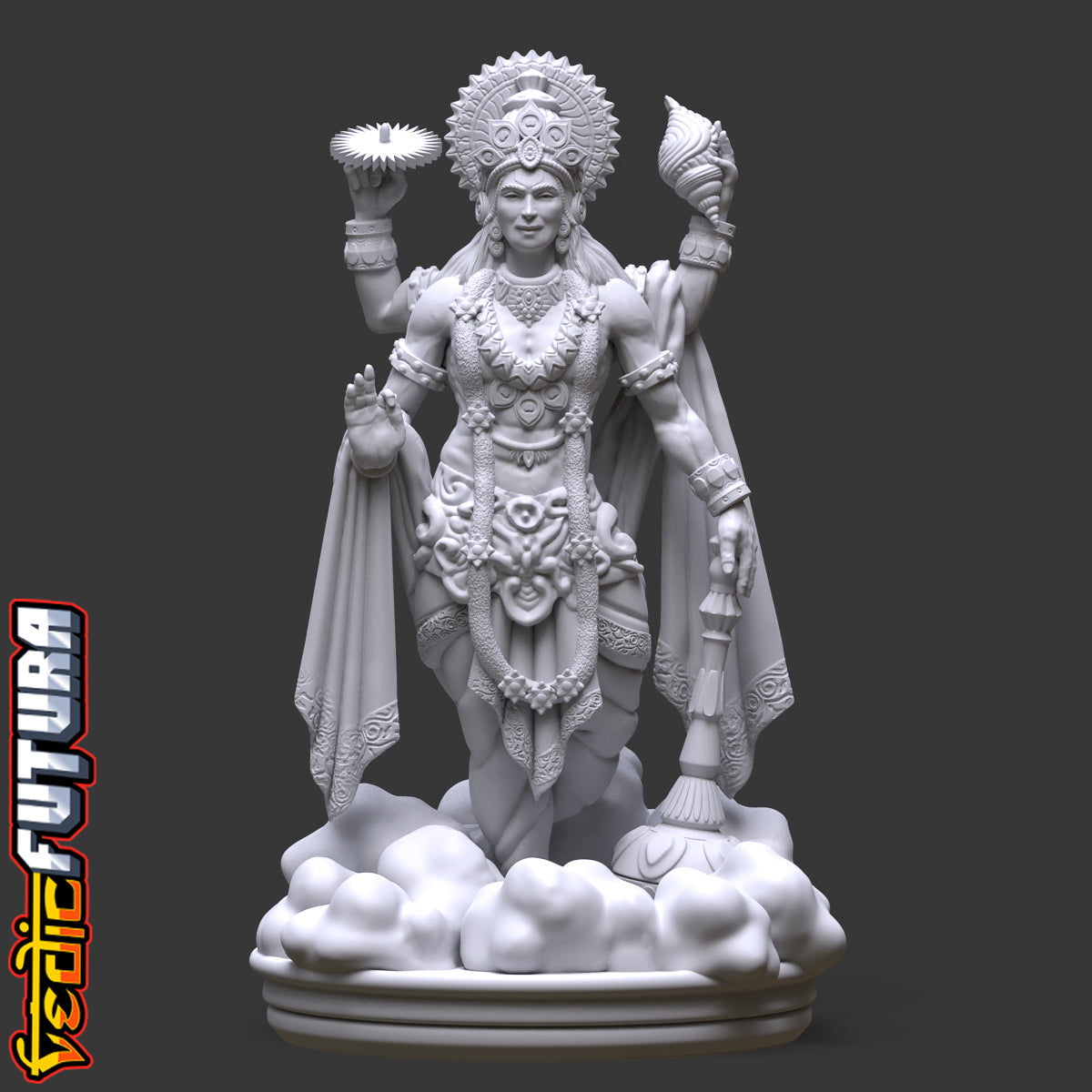 Adorned with a long flower garland and detailed jewelry, the statue reflects Vishnu's divine status. A distinctive crown on his head emphasizes his supreme authority. Standing on a base that resembles clouds, the statue hints at Vishnu's abode in Vaikuntha, suggesting a piece of the celestial realm in your space.