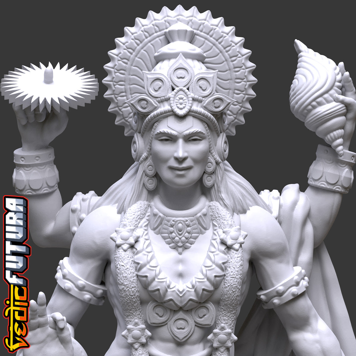 With four hands, each symbolizing a different aspect of his divine responsibilities, Vishnu's iconography is rich with meaning. His top right hand holds the Sudarshana Chakra, representing the mind's ability to govern. The top left wields the Panchajanya Shankha, indicating the beginning of existence and divine wisdom. The lower right hand is in the Abhaya Mudra, signifying reassurance and protection from fear, while the lower left hand rests on his mace, a symbol of strength and the destruction of ignorance.