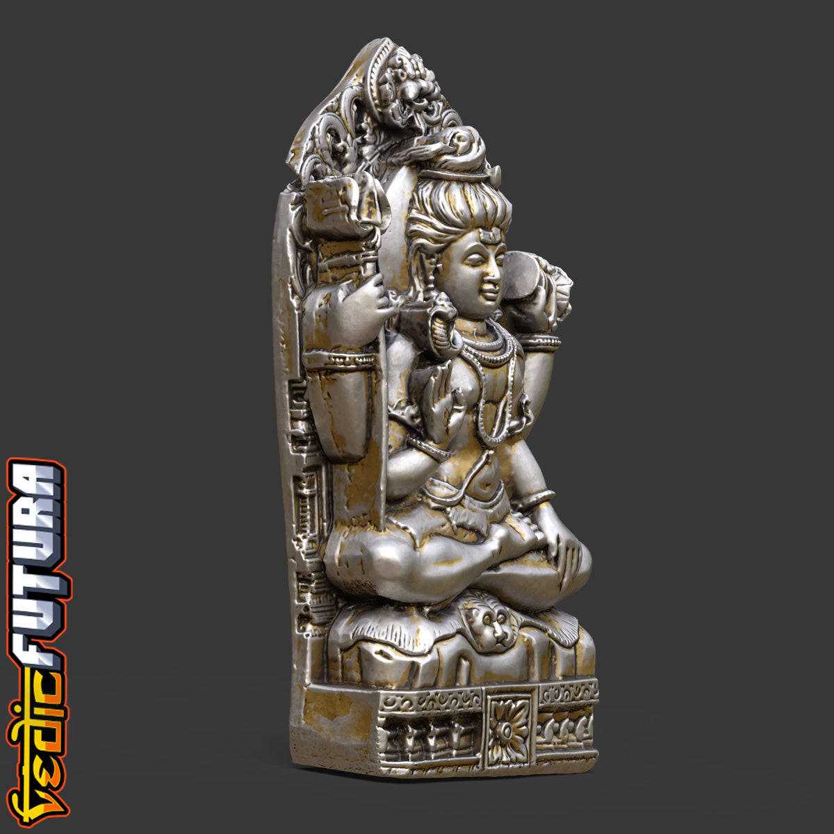 "This finely detailed sculpture represents Lord Shiva in serene meditative posture, seated in padmasana on a stylized lotus pedestal. The figure is framed within a richly ornamented prabhavali (arch).The backrest, with its scrolling flames and kirtimukha motif, anchors the divine presence. Shiva holds a trident (trishula) in one hand and a small drum (damaru) in the other, symbolizing destruction and creation. A skull motif on his shoulder, snakes as armlets, and the crescent moon in his matted locks reflect his ascetic and cosmic aspects.